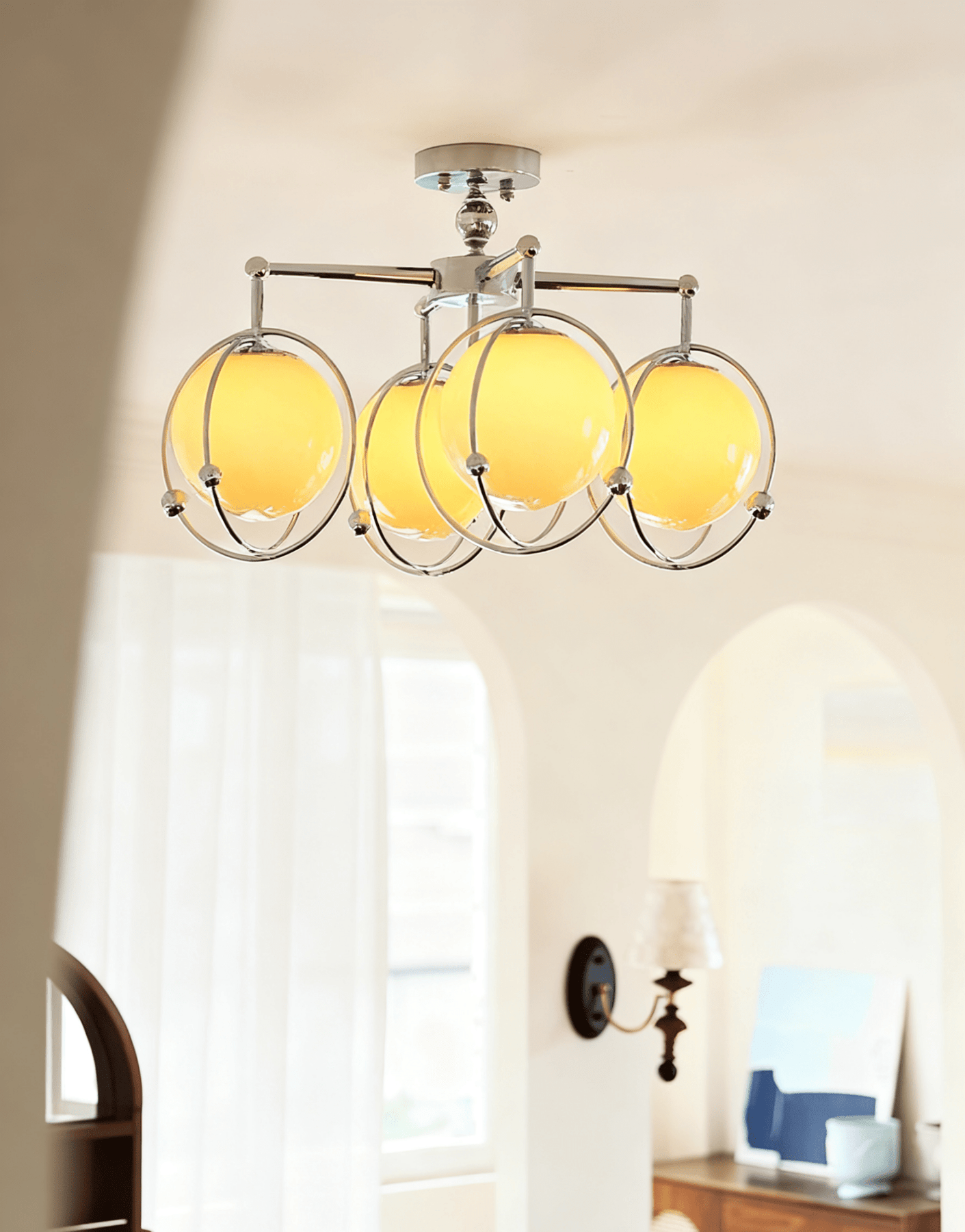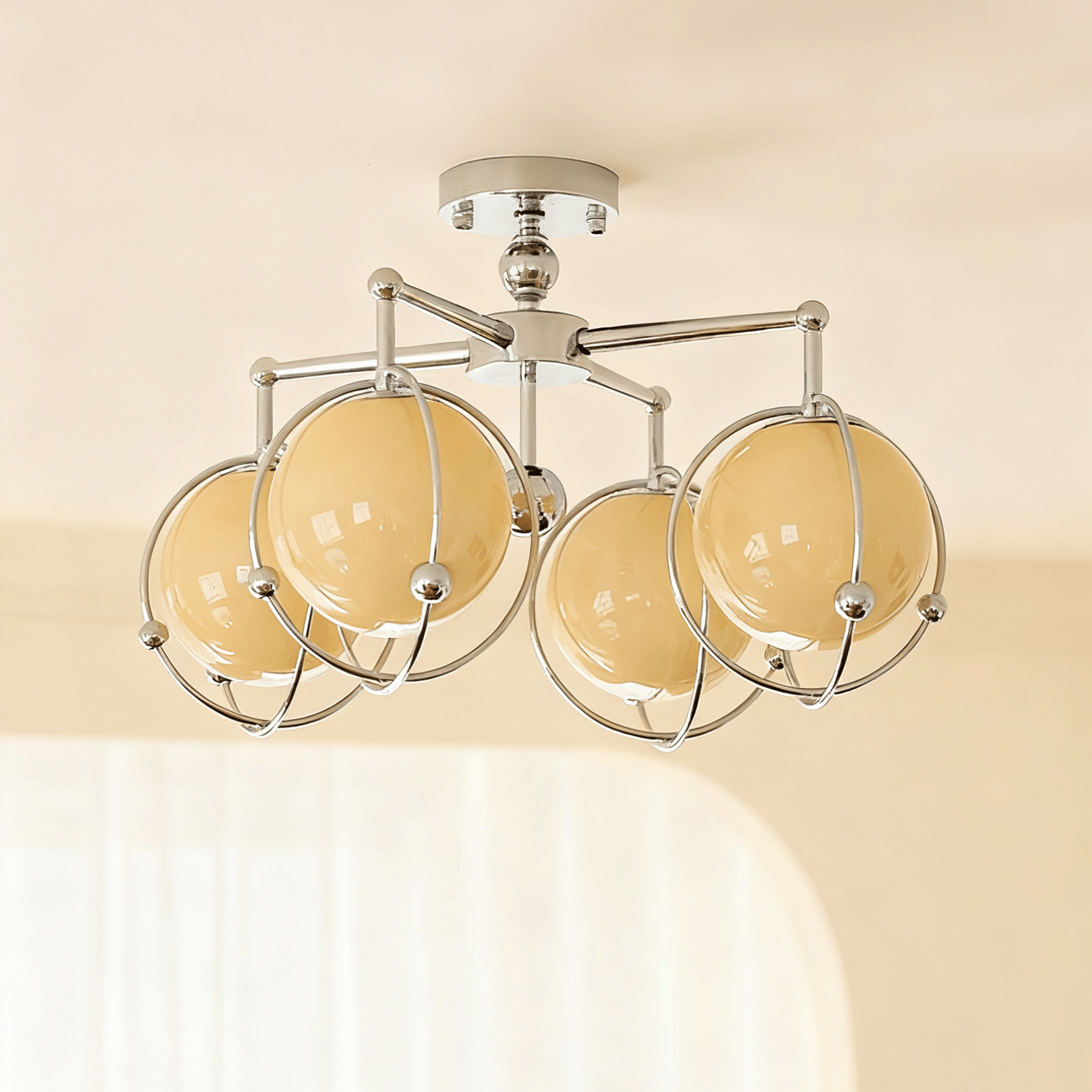 This Orb Cage Semi Ceiling Lamp showcases multiple globe - shaped shades in a warm, creamy tone, each nestled within a sleek metal cage. The polished metal frame and arms lend it a modern, industrial - chic flair. When illuminated, the globes cast a soft, inviting glow, ideal for infusing entryways, living rooms, or dining areas with a retro - futuristic charm, blending vintage aesthetics with contemporary design.