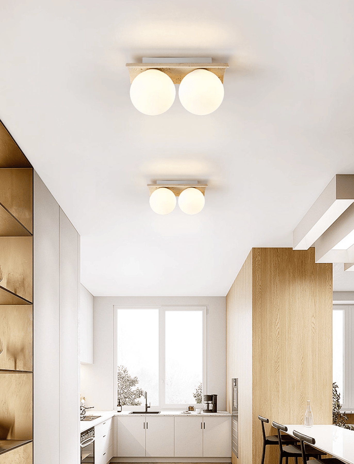Inspiriert von natürlichen Materialien und skulpturaler Balance eignet sich diese Deckenleuchte ideal für Wohnzimmer, Flure, Schlafzimmer oder sogar minimalistische Badezimmer. Der Sockel in Travertin-Optik verleiht eine geerdete, erdige Note, während die Kugelleuchten eine moderne, zeitlose Ästhetik vermitteln.
