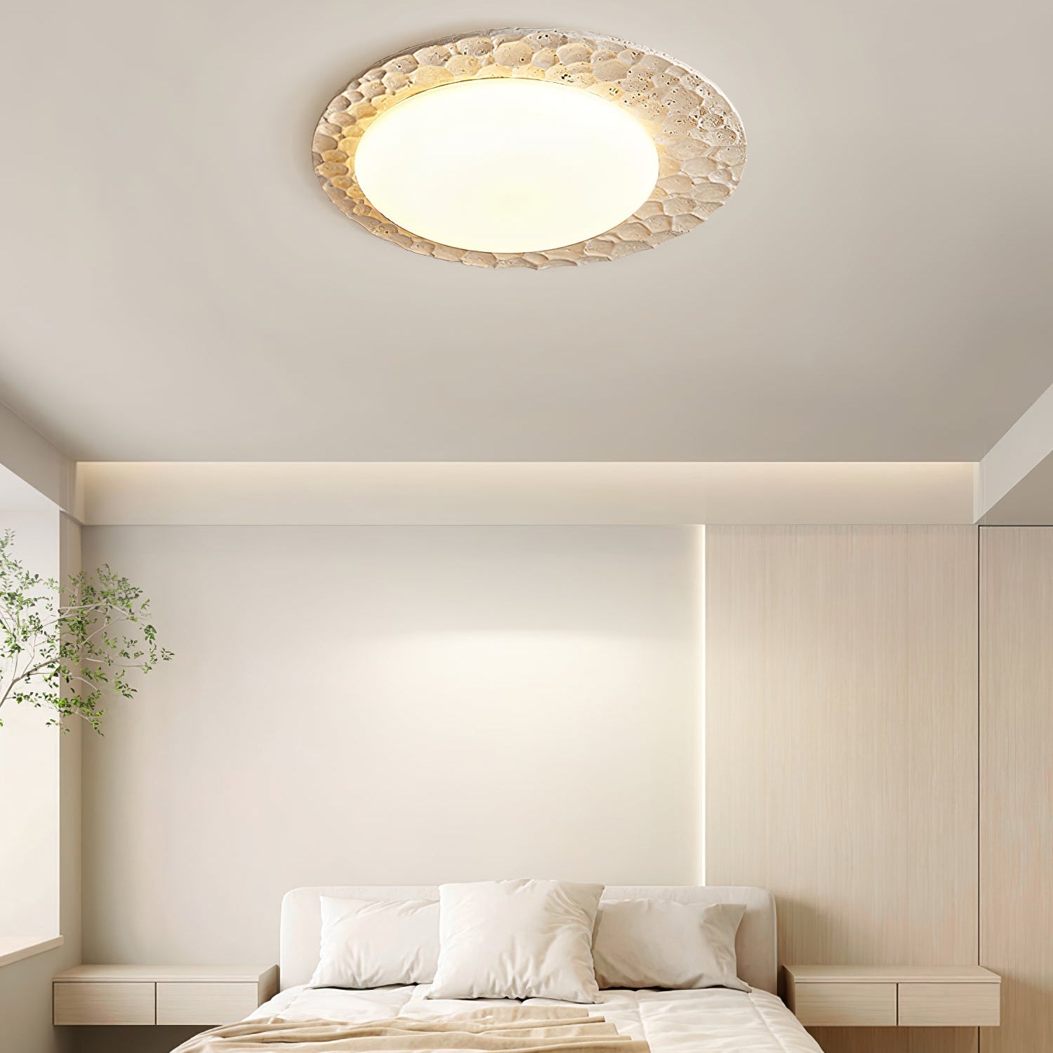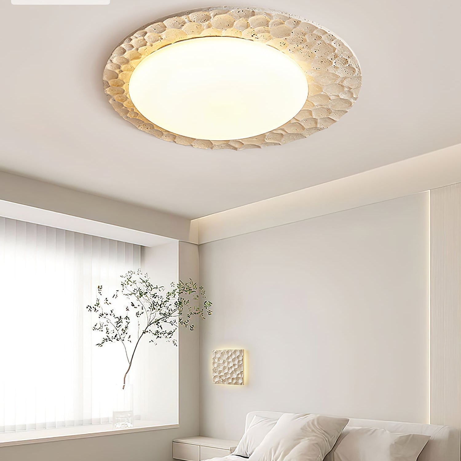The Vakkerlight Textured Organic Travertine Ceiling Lamp features a unique, hand-chiseled or pebbled yellow travertine surround, bringing an earthy yet modern aesthetic to any space. Its warm, inviting illumination emanates from a smooth, diffused light source, beautifully contrasting the natural texture of the stone and adding a distinctive tactile presence.