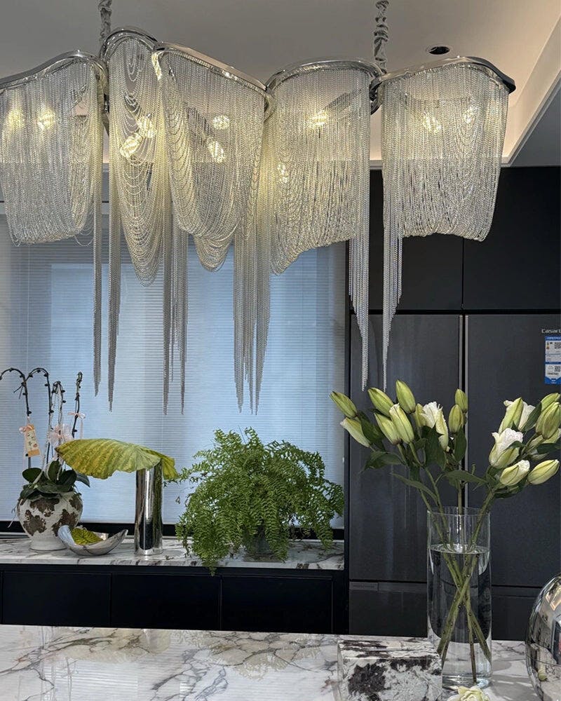 Verschönern Sie Ihren Raum mit dem Ark Tassel Kronleuchter. Dieser postmoderne, rechteckige Esszimmerleuchter besticht durch seine robuste Konstruktion aus Eisen und Aluminium und eine hochwertige, antioxidativ behandelte Quastenkette für langanhaltende Schönheit. Setzen Sie mit diesem kreativen Designerstück ein Statement in Ihrem Wohnzimmer, Ihrer Bar oder Ihrem Essbereich.