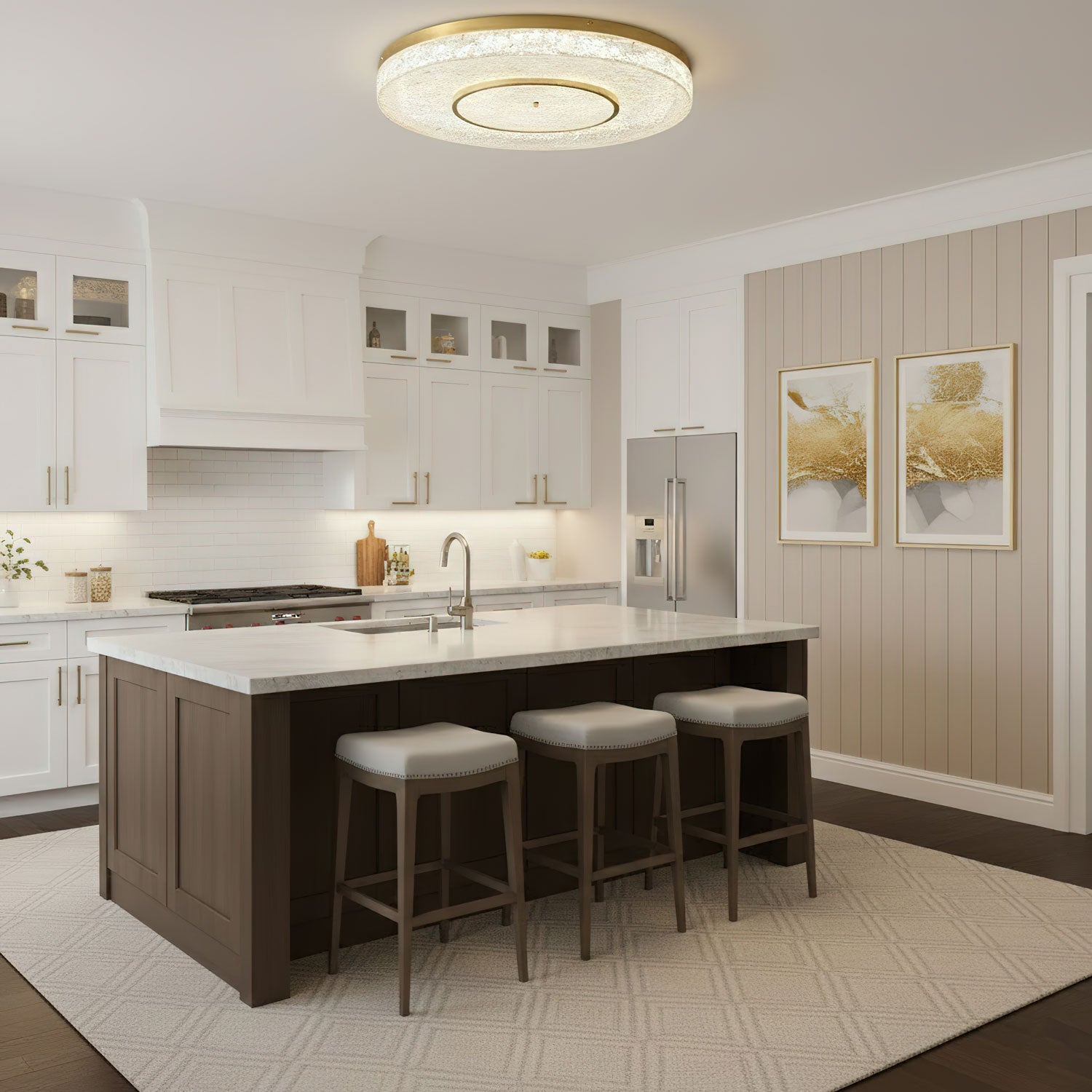 Pendelleuchten über der Kücheninsel : Diese bieten wichtiges Arbeitslicht für die Zubereitung von Speisen und sollten 81–91 cm über der Arbeitsfläche hängen. Achten Sie darauf, dass jede Pendelleuchte etwa ein Viertel der Länge der Kücheninsel ausmacht, um eine ausreichende Beleuchtung zu gewährleisten, ohne den Raum zu überladen.