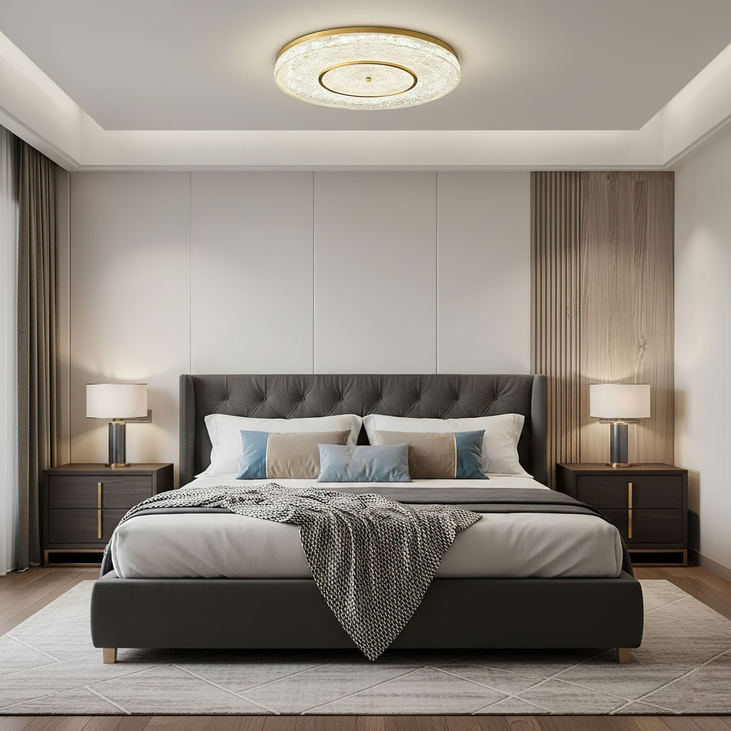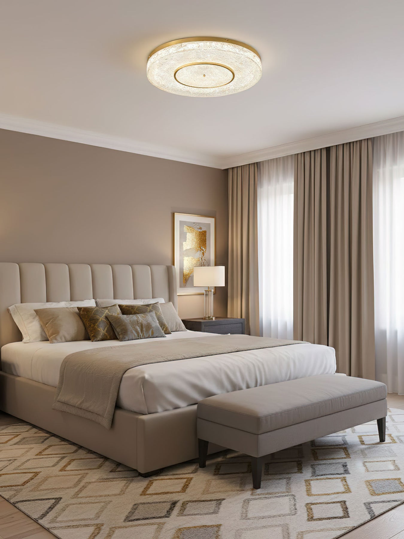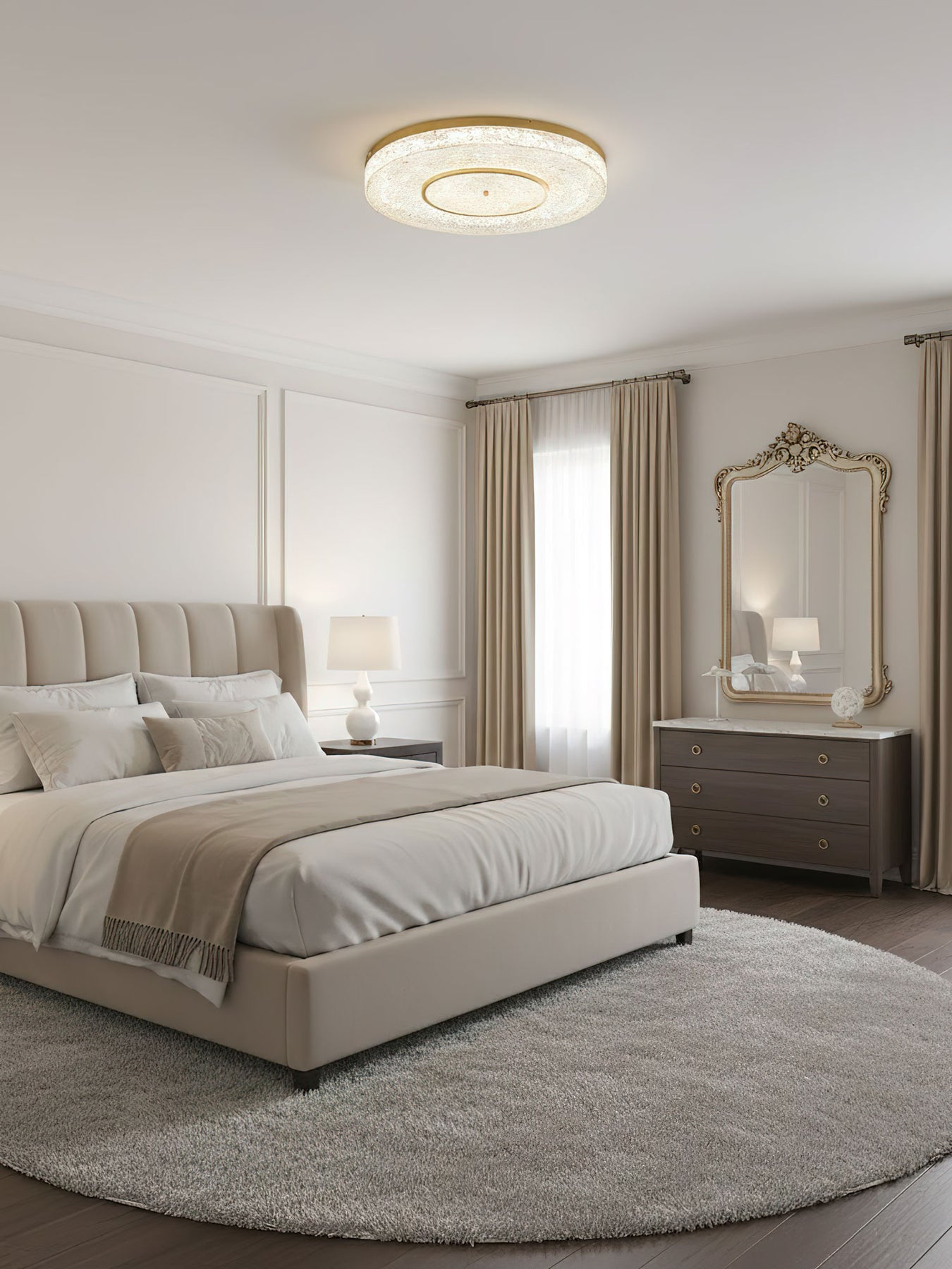 Deckenleuchten : Schlafzimmer profitieren von sanfter, stimmungsvoller Beleuchtung. Verwenden Sie die Raummaßformel, um sicherzustellen, dass die Deckenleuchte die richtige Größe hat. Halbbündige oder bündige Leuchten eignen sich gut für die Allgemeinbeleuchtung, während Wand- oder Nachttischlampen für gezieltes Arbeitslicht sorgen.