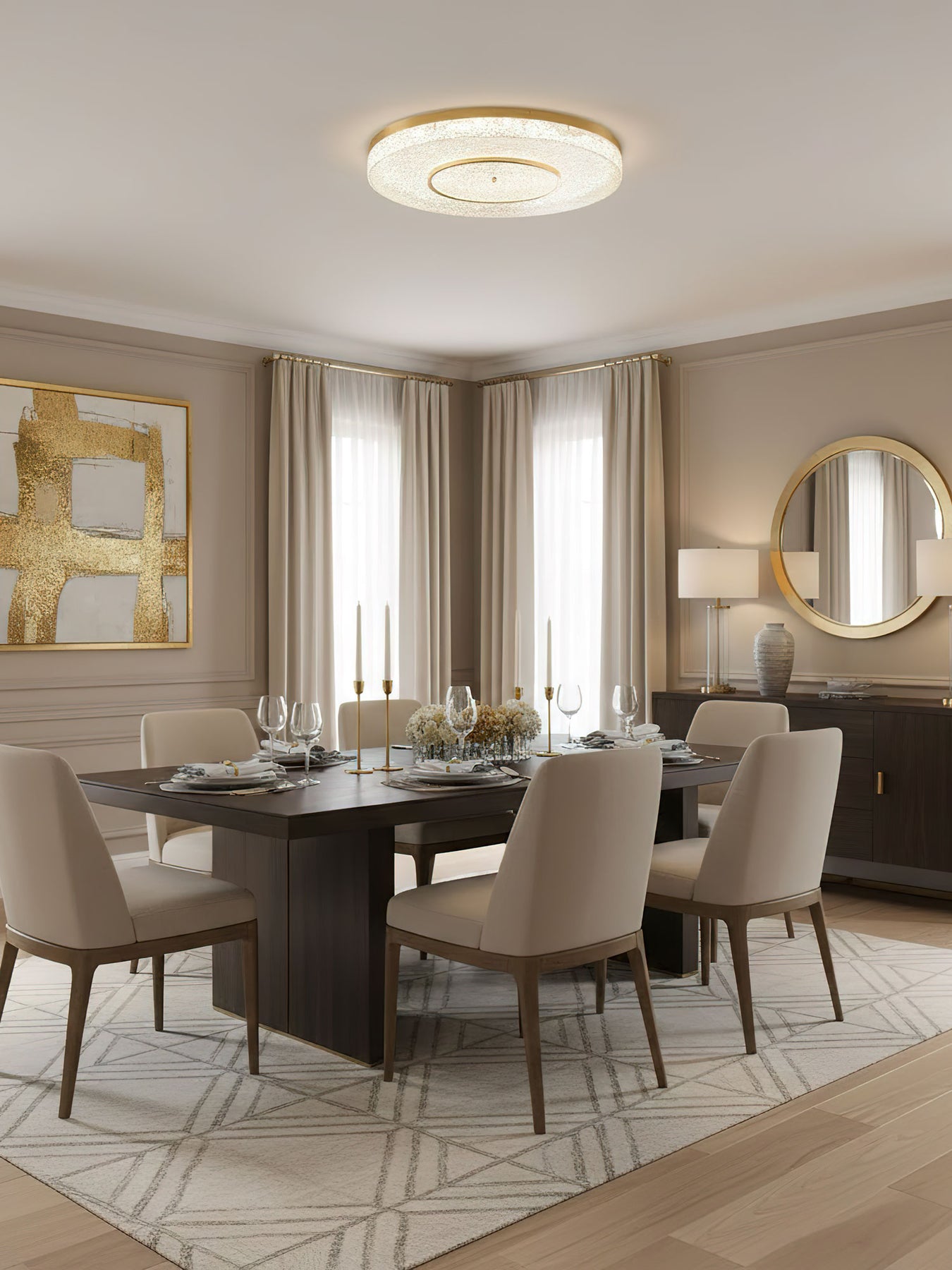 - Kronleuchter : Als Herzstück des Esszimmers sollte der Kronleuchter breit genug sein, um die Größe des Esstisches zu ergänzen, aber nicht so breit, dass er den Raum überwältigt. Ein Durchmesser von 1/2 bis 2/3 der Tischbreite ist ein guter Richtwert.