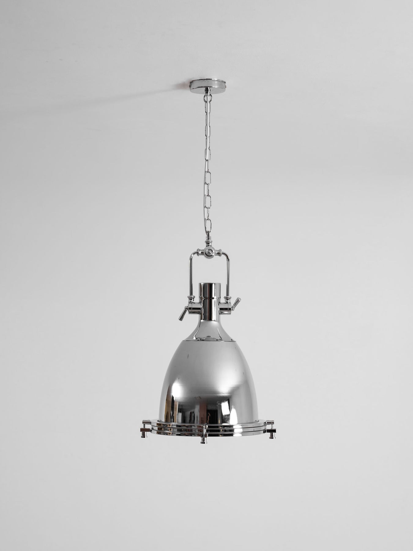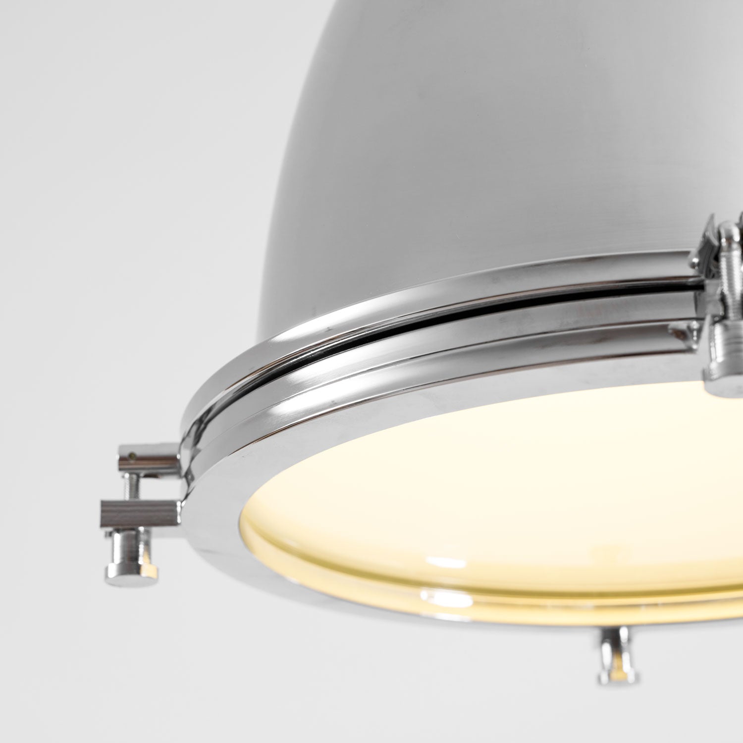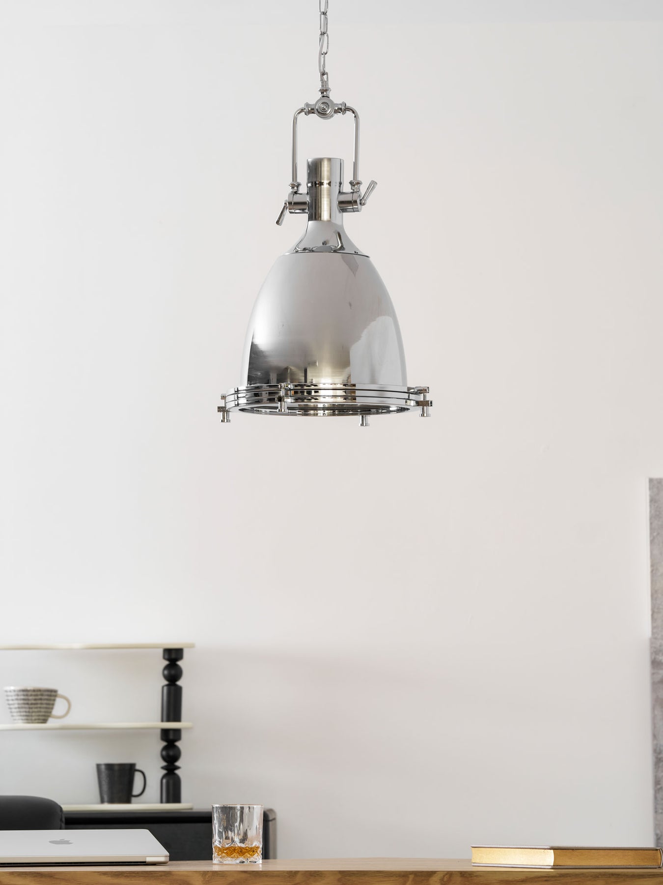 Diese robuste, nautische Industrie-Einzelpendelleuchte in poliertem Chrom verfügt über glatte Linien und eine Diffusorabdeckung, um ein schönes, weiches Licht in jedem Raum zu erzeugen. Glühbirne nicht enthalten.
