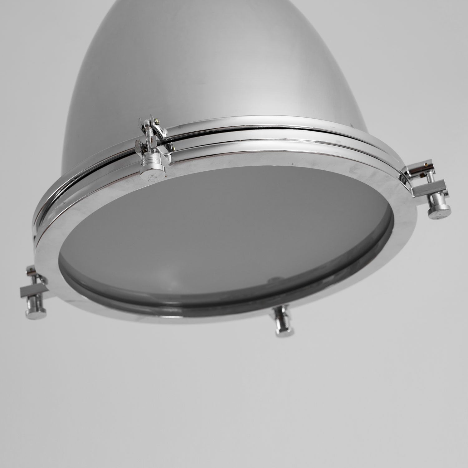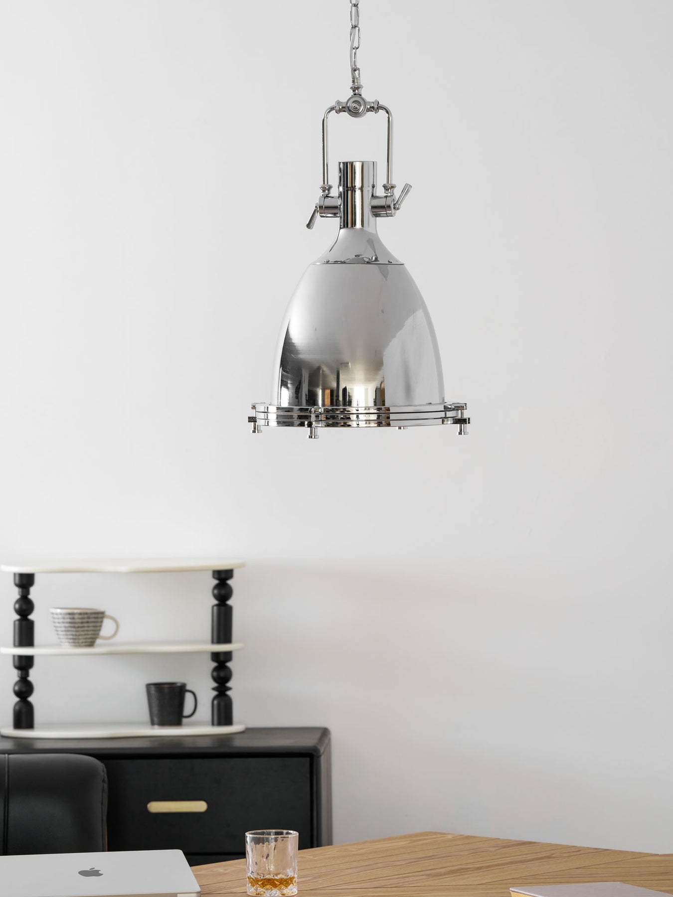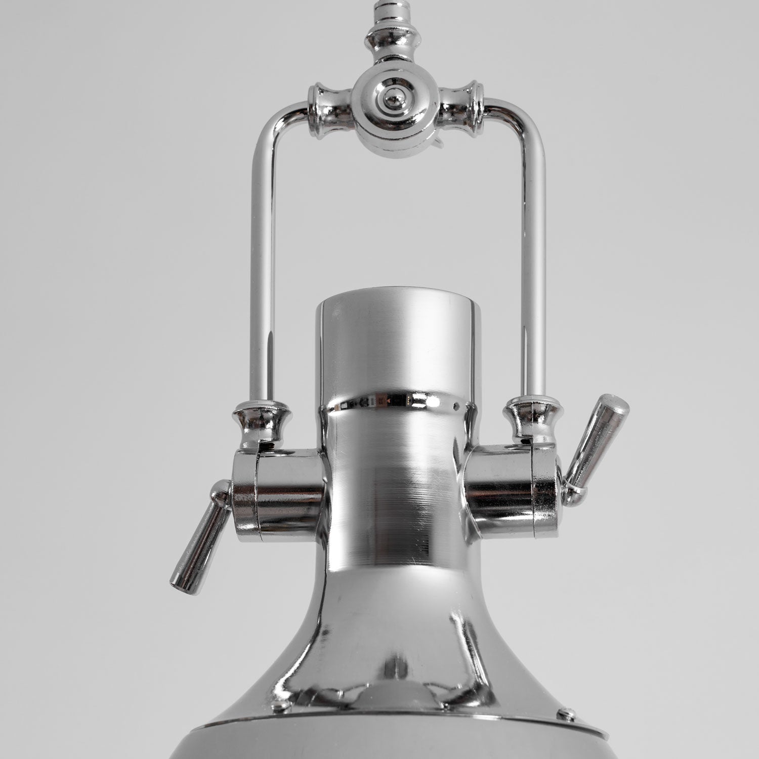 Diese robuste, nautische Industrie-Einzelpendelleuchte in poliertem Chrom verfügt über glatte Linien und eine Diffusorabdeckung, um ein schönes, weiches Licht in jedem Raum zu erzeugen. Glühbirne nicht enthalten.