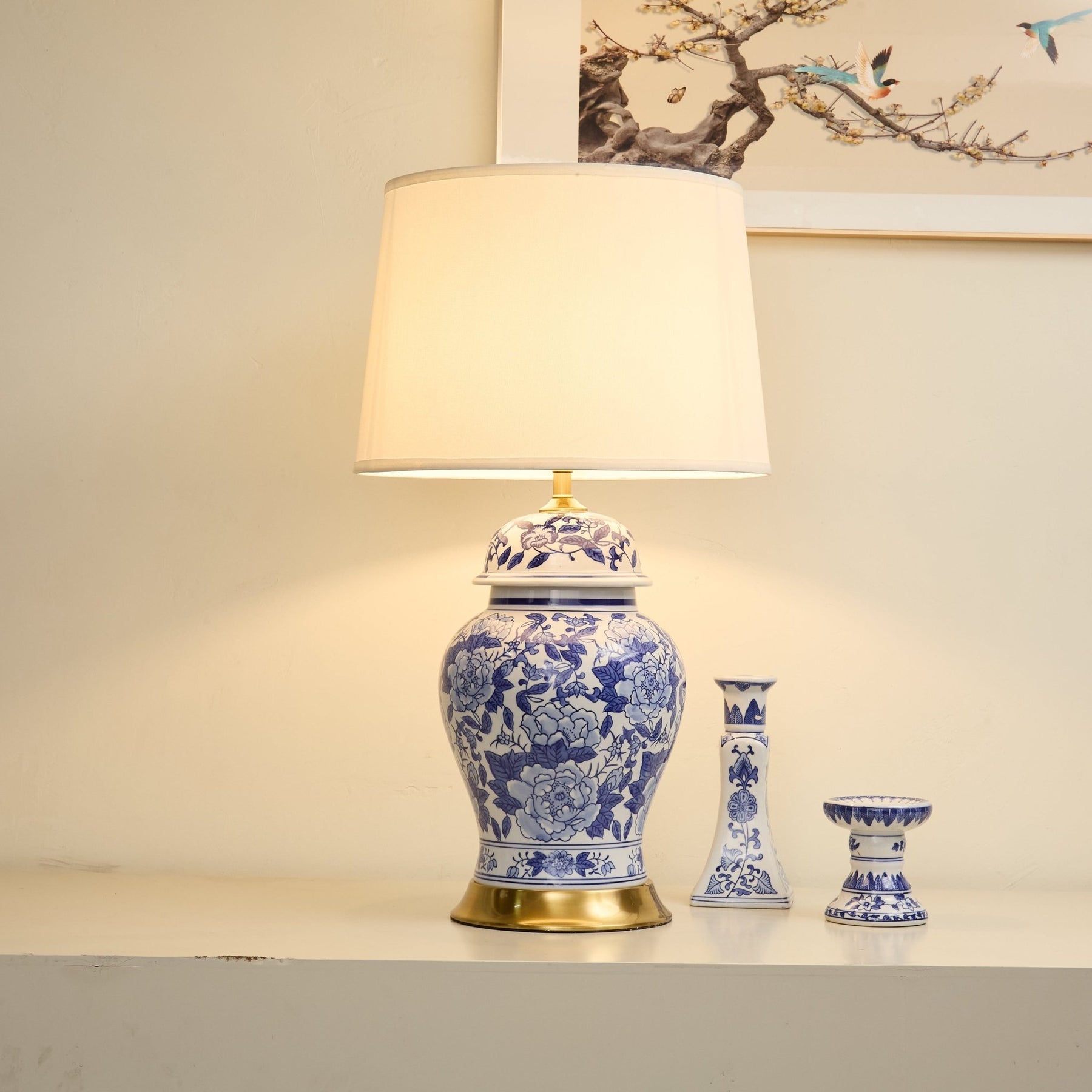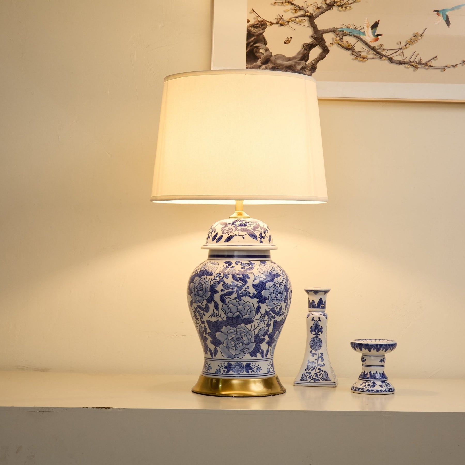 This table lamp takes the form of a blue - and - white porcelain jar, adorned with exquisite peony patterns. Peonies symbolize prosperity and good fortune in Chinese culture. Paired with a light - colored fabric lampshade, it emits a soft, warm glow, blending traditional charm with elegant ambiance, perfect for adding a touch of classic Chinese style to interior spaces.