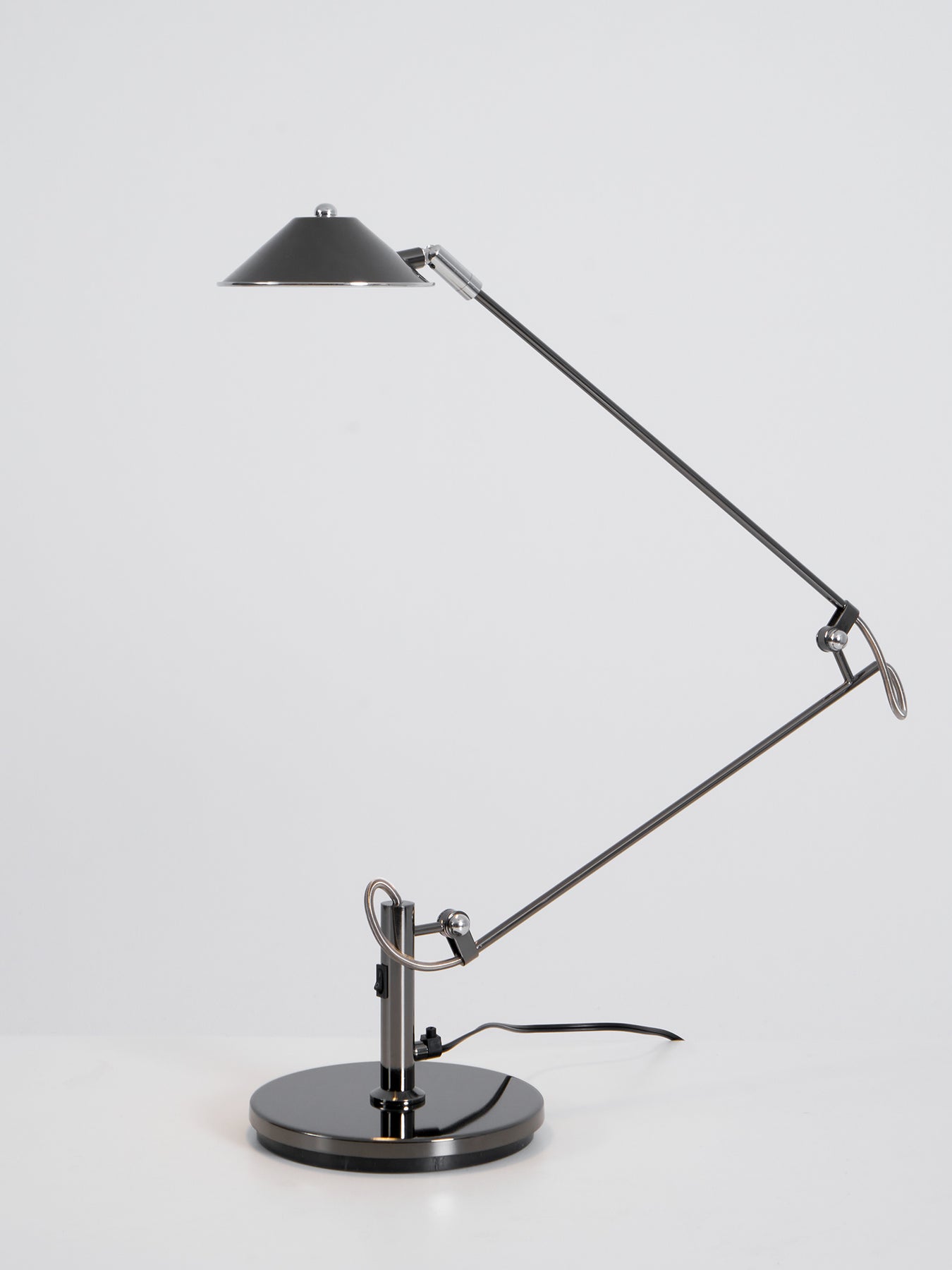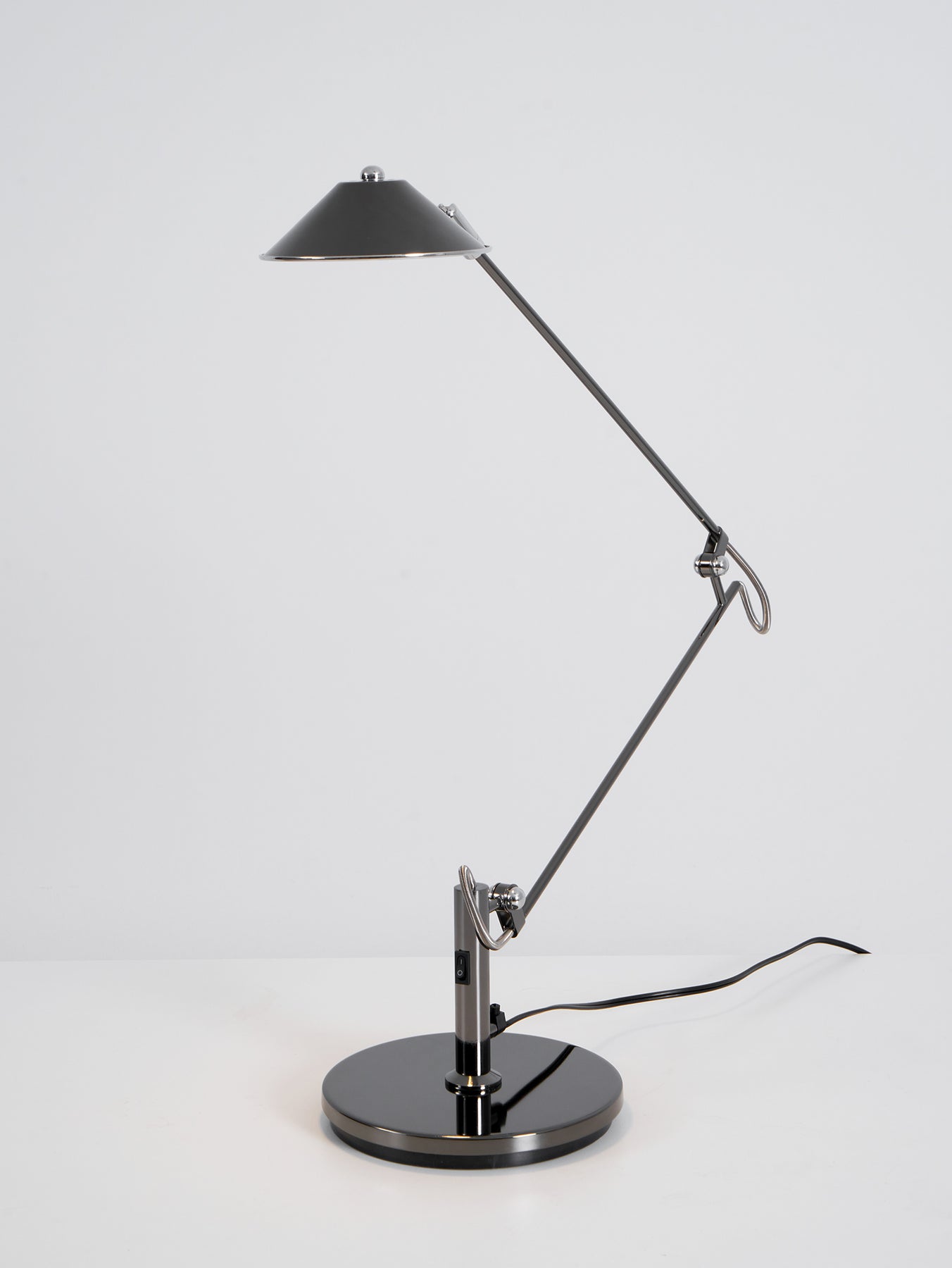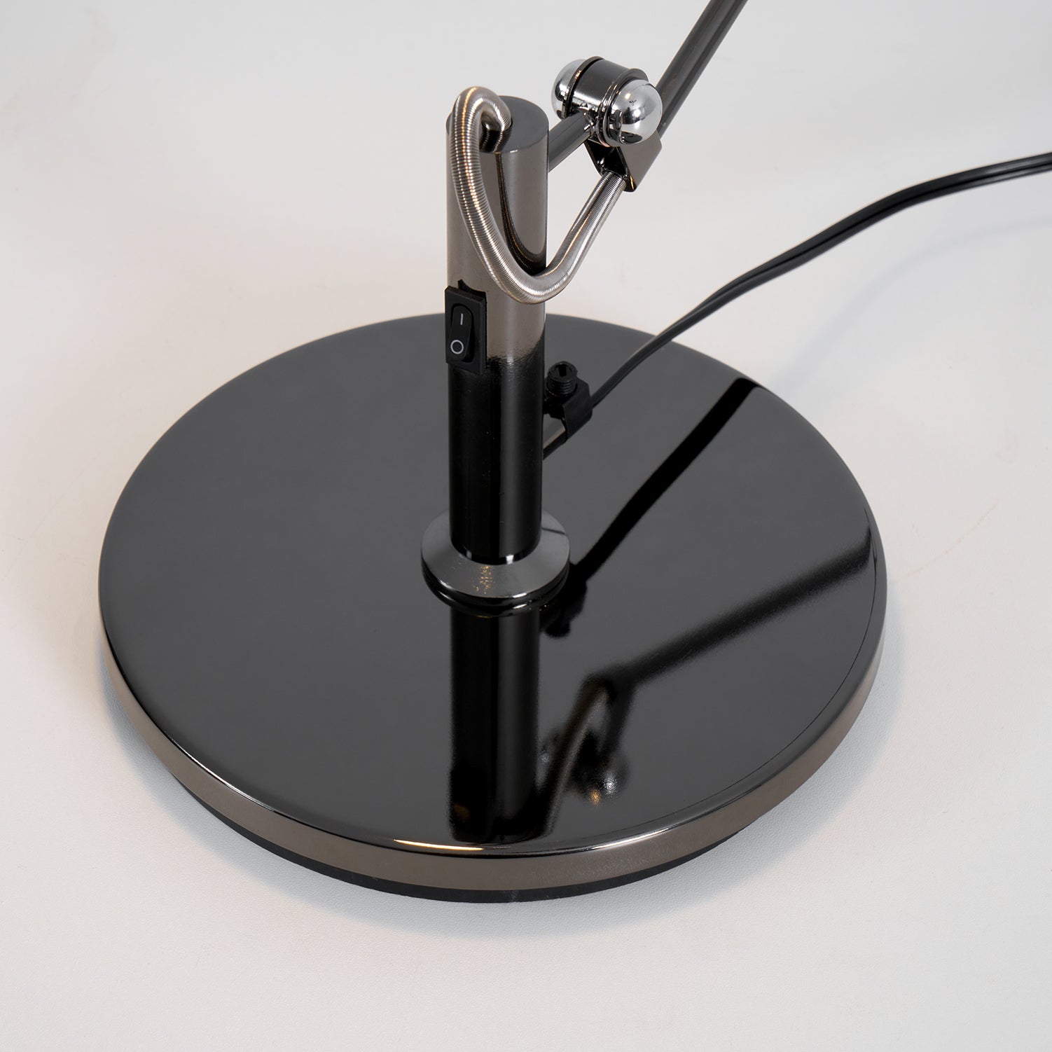 Diese verstellbare schwarze Büroarbeitsleuchte besteht aus Metall und verfügt über einen eleganten, schwarzen, kegelförmigen Lampenschirm. Ihr langer Arm ermöglicht eine einfache Positionierung und ihr Design ist speziell auf die Beleuchtungsbedürfnisse von Büroumgebungen zugeschnitten. Beleuchten Sie Ihren Arbeitsplatz mit Präzision und Stil.