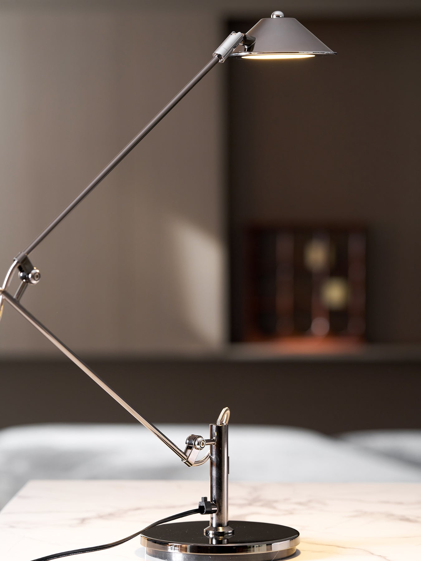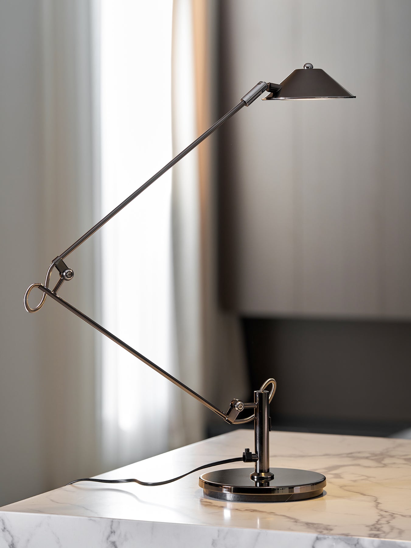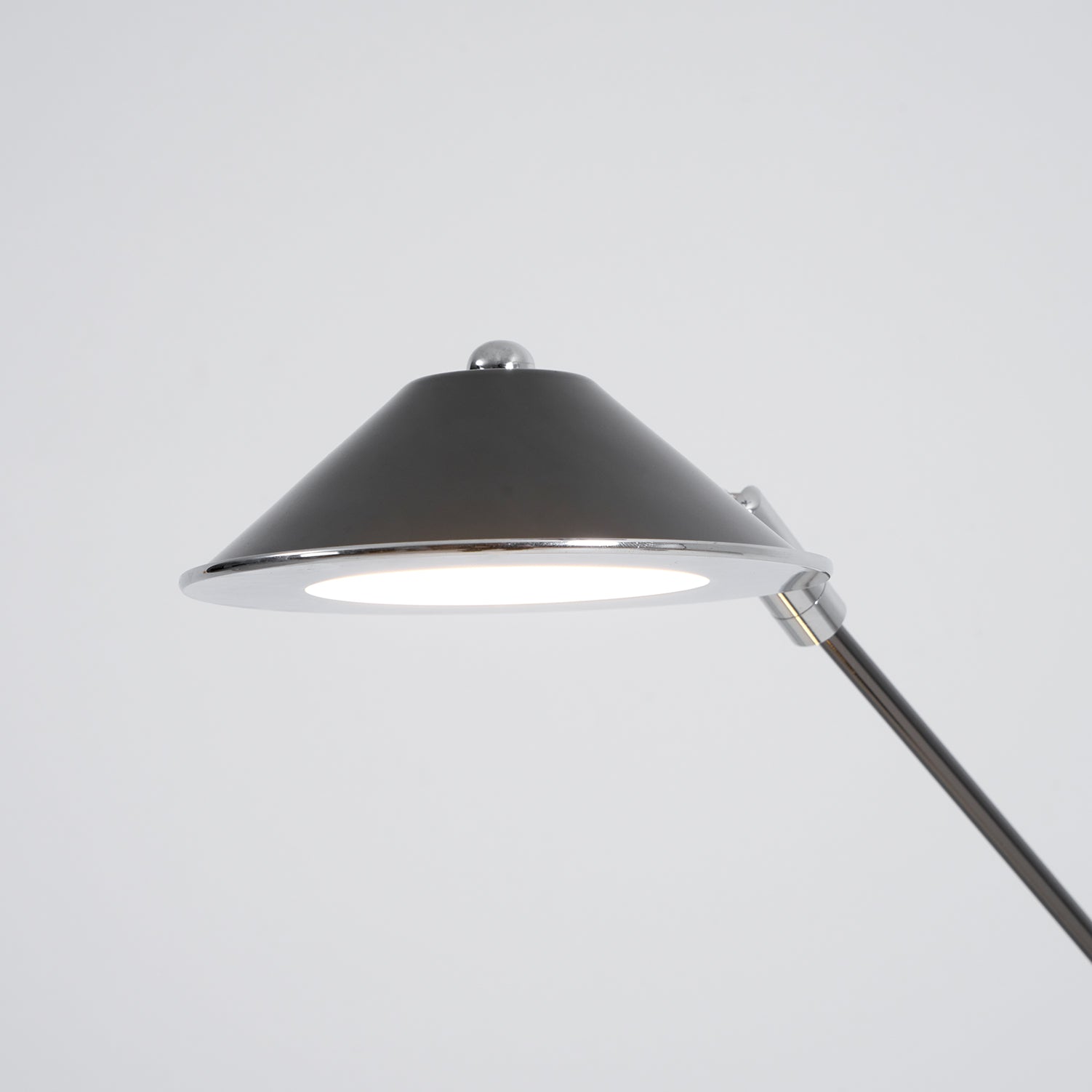 Diese verstellbare schwarze Büroarbeitsleuchte besteht aus Metall und verfügt über einen eleganten, schwarzen, kegelförmigen Lampenschirm. Ihr langer Arm ermöglicht eine einfache Positionierung und ihr Design ist speziell auf die Beleuchtungsbedürfnisse von Büroumgebungen zugeschnitten. Beleuchten Sie Ihren Arbeitsplatz mit Präzision und Stil.