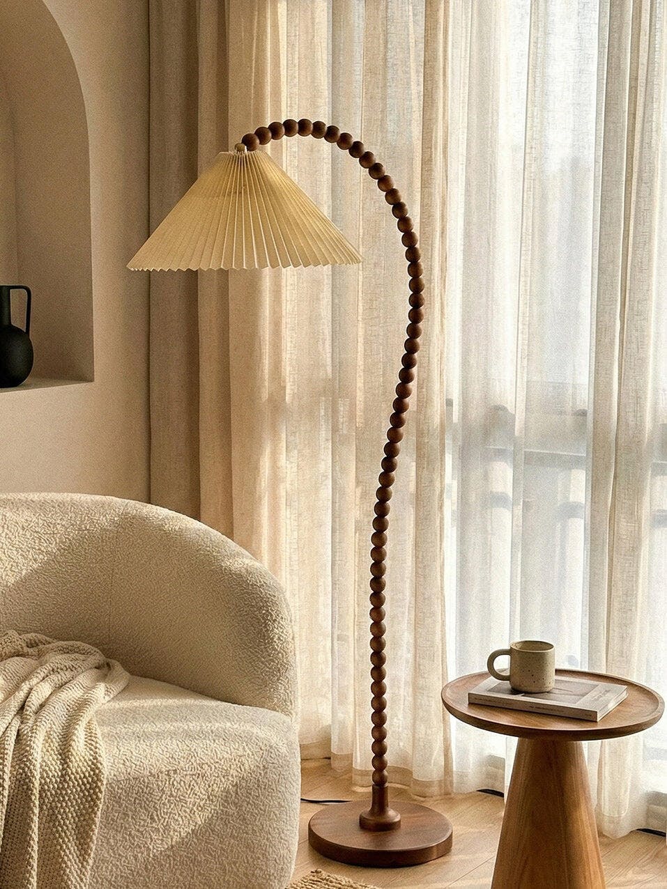 Diese einzigartige Stehleuchte mit ihrem flexiblen Stiel aus Holzperlen verleiht Ihrem Wohnraum eine natürliche und verspielte Note. Der konische Stoffschirm spendet weiches, warmes Licht und eignet sich perfekt für gemütliche Leseecken oder als Akzentstück.