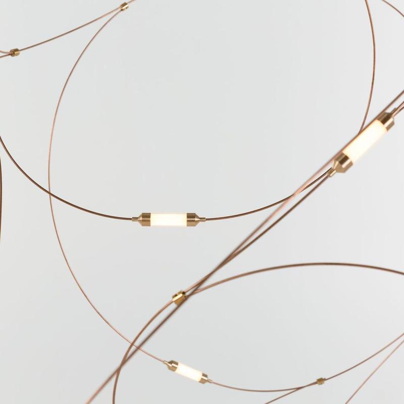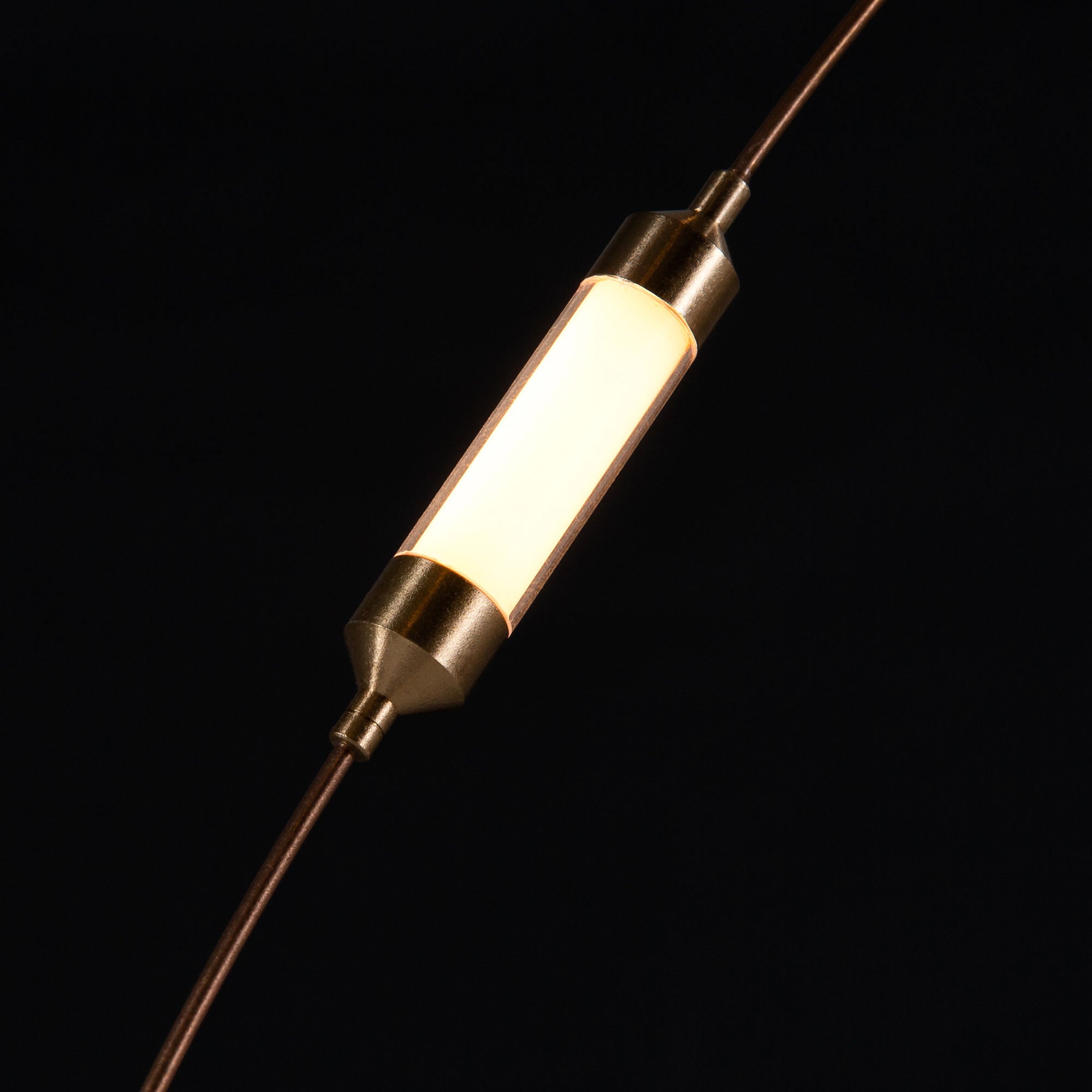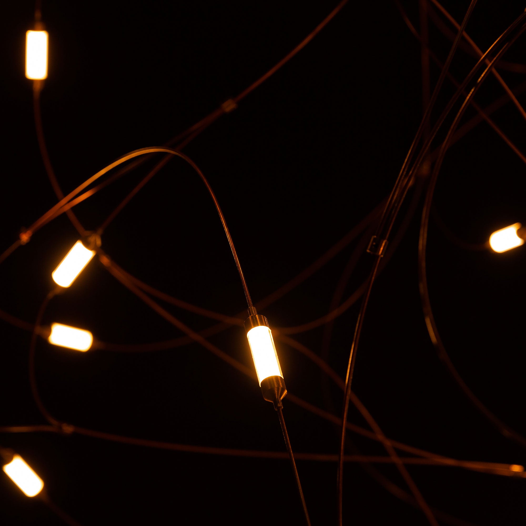 Wenn die Sonne untergeht und die Dunkelheit hereinbricht, erlebt die Flock Pendelleuchte eine atemberaubende Metamorphose. Ein Knopfdruck genügt und die Leuchte erwacht zum Leben und erleuchtet die Umgebung mit einem faszinierenden Lichtspiel. Die Kombination aus sorgfältig angeordneten Messingschalen, Bronzedrähten und halbtransparenten Polycarbonat-Diffusoren erzeugt ein atemberaubendes Spiel aus Licht und Schatten und schafft eine bezaubernde Atmosphäre.