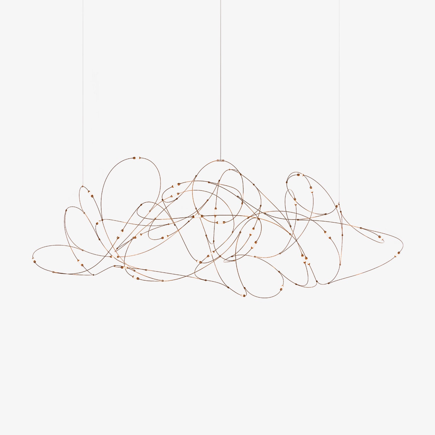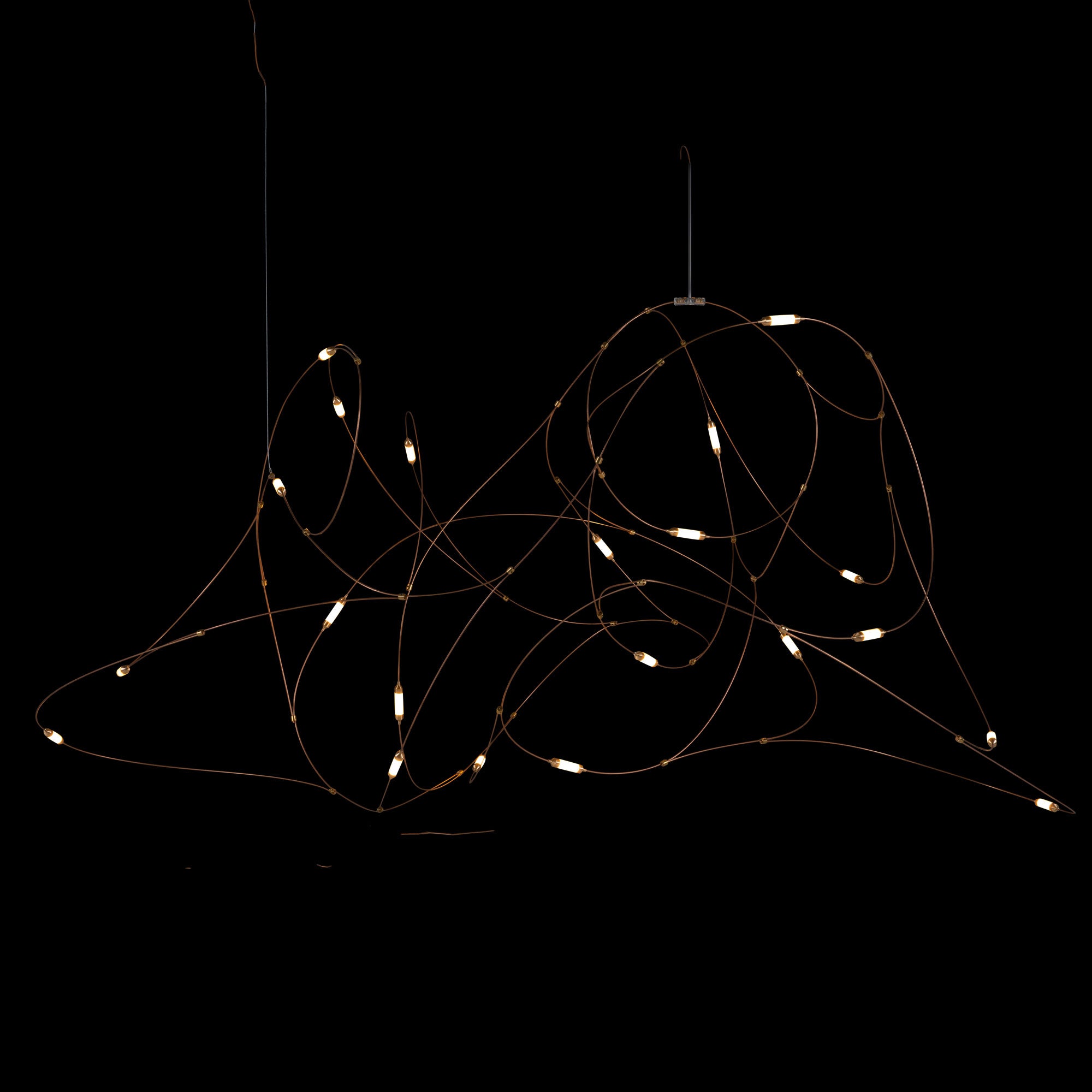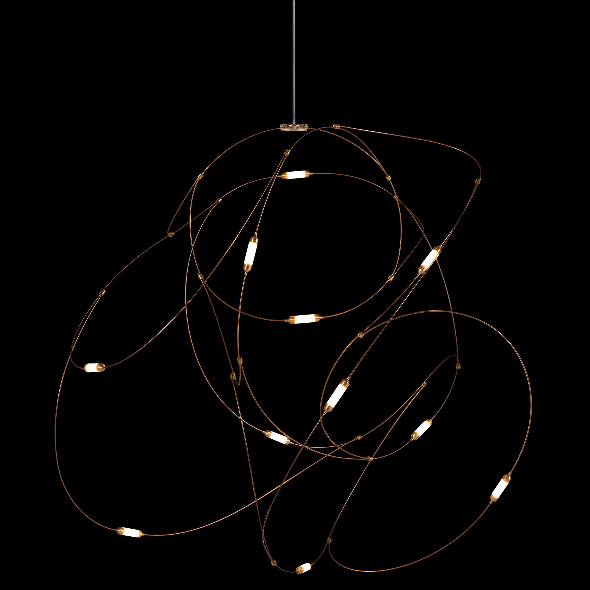 Wenn die Sonne untergeht und die Dunkelheit hereinbricht, erlebt die Flock Pendelleuchte eine atemberaubende Metamorphose. Ein Knopfdruck genügt und die Leuchte erwacht zum Leben und erleuchtet die Umgebung mit einem faszinierenden Lichtspiel. Die Kombination aus sorgfältig angeordneten Messingschalen, Bronzedrähten und halbtransparenten Polycarbonat-Diffusoren erzeugt ein atemberaubendes Spiel aus Licht und Schatten und schafft eine bezaubernde Atmosphäre.