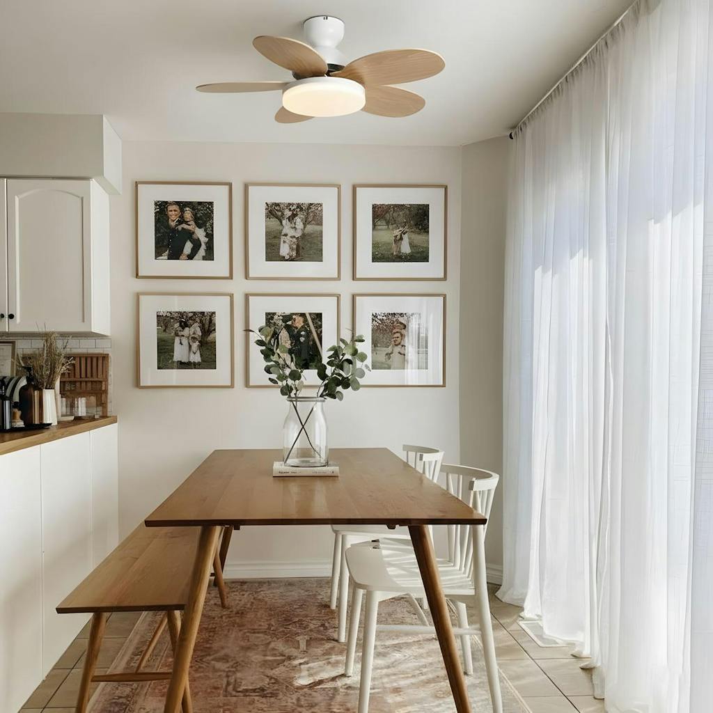 Inspiriert von der Form sich entfaltender Blütenblätter verfügt der Petalo über sechs elegant geschwungene Flügel in heller Holzmaserung. Vor dem kühlen, grauen Gehäuse sorgt dieser Deckenventilator für einen kraftvollen Luftstrom bei flüsterleisen Betrieb – abgerundet durch warme, diffuse LED-Beleuchtung für zusätzliche Funktionalität.