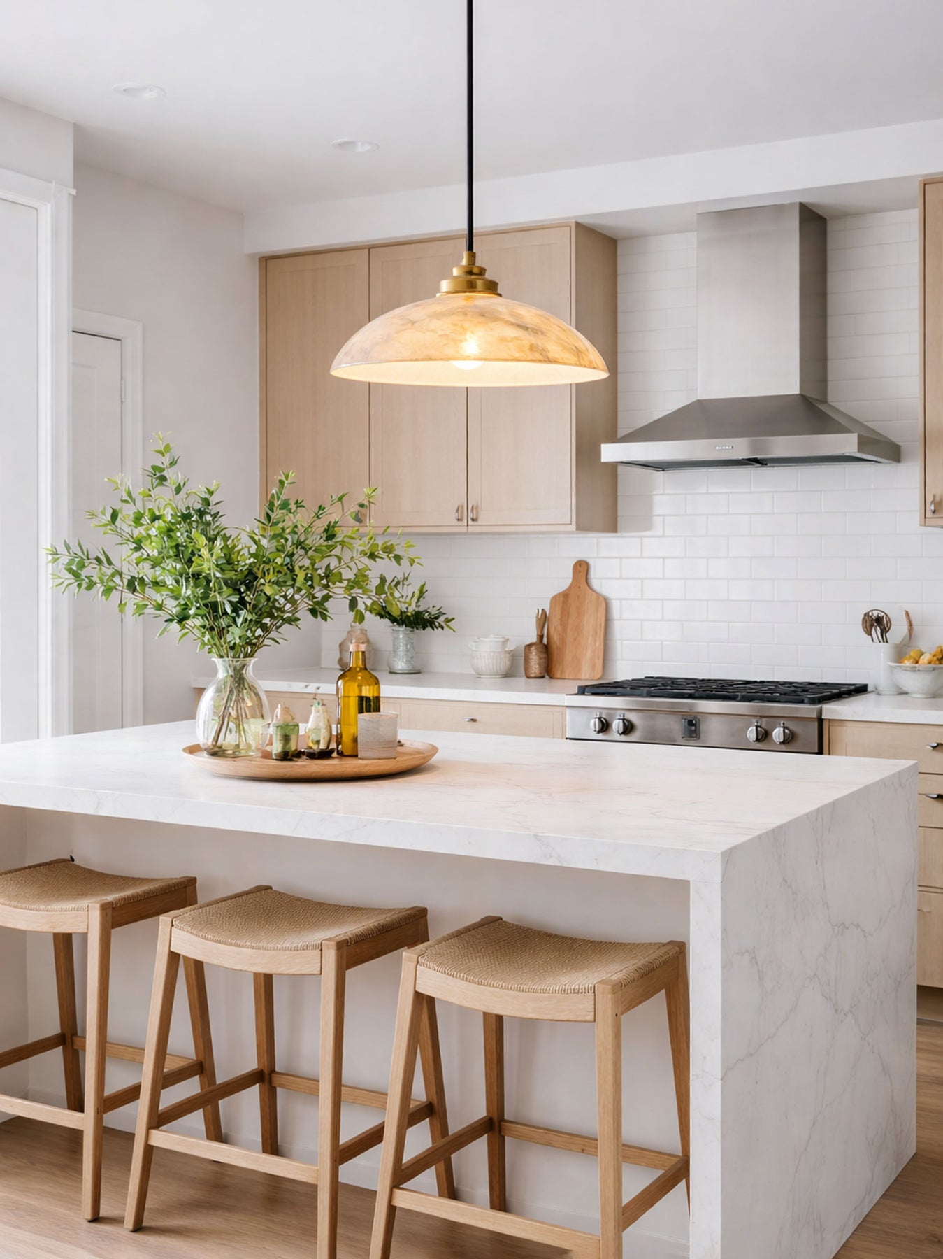 Pendants Over Island: These provide crucial task lighting for food prep and should hang 32-36 inches above the surface. Make sure that each pendant is about 1/4 the length of the island to provide sufficient coverage without overwhelming the space.