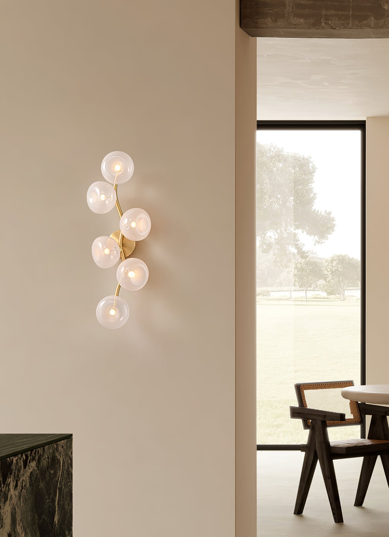 Inspired by nature’s elegance, Aurora Vine features six glowing glass orbs growing along a graceful golden stem. Like dew drops catching the first light of dawn, this sculptural sconce brings soft radiance and a poetic sense of movement to any space.