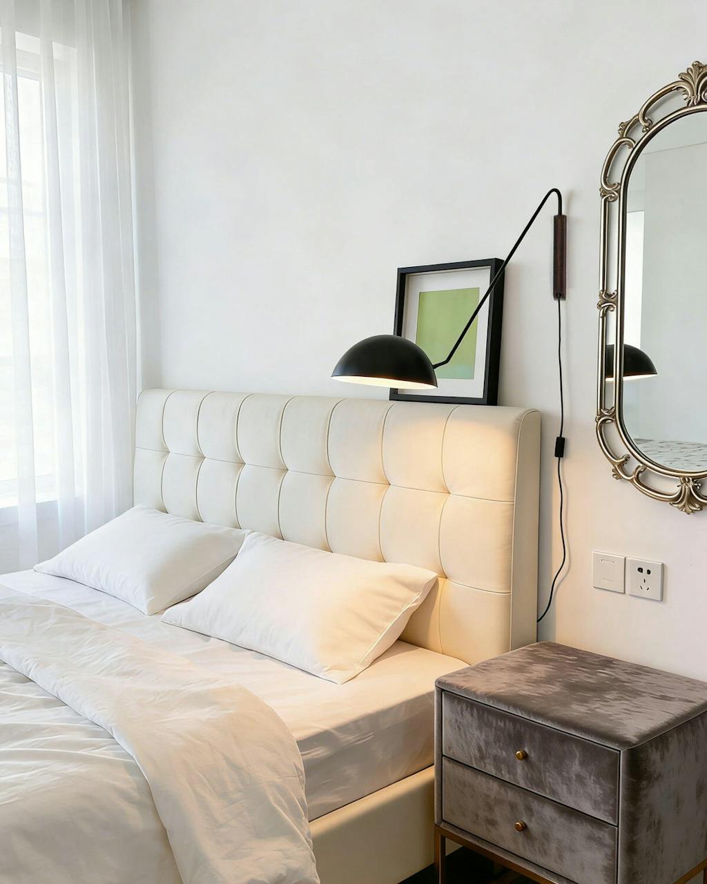 Task Lighting: Bedside lamps or wall sconces should be proportionate to the size of the nightstands and the bed. The lamp height should be roughly at eye level when sitting in bed.