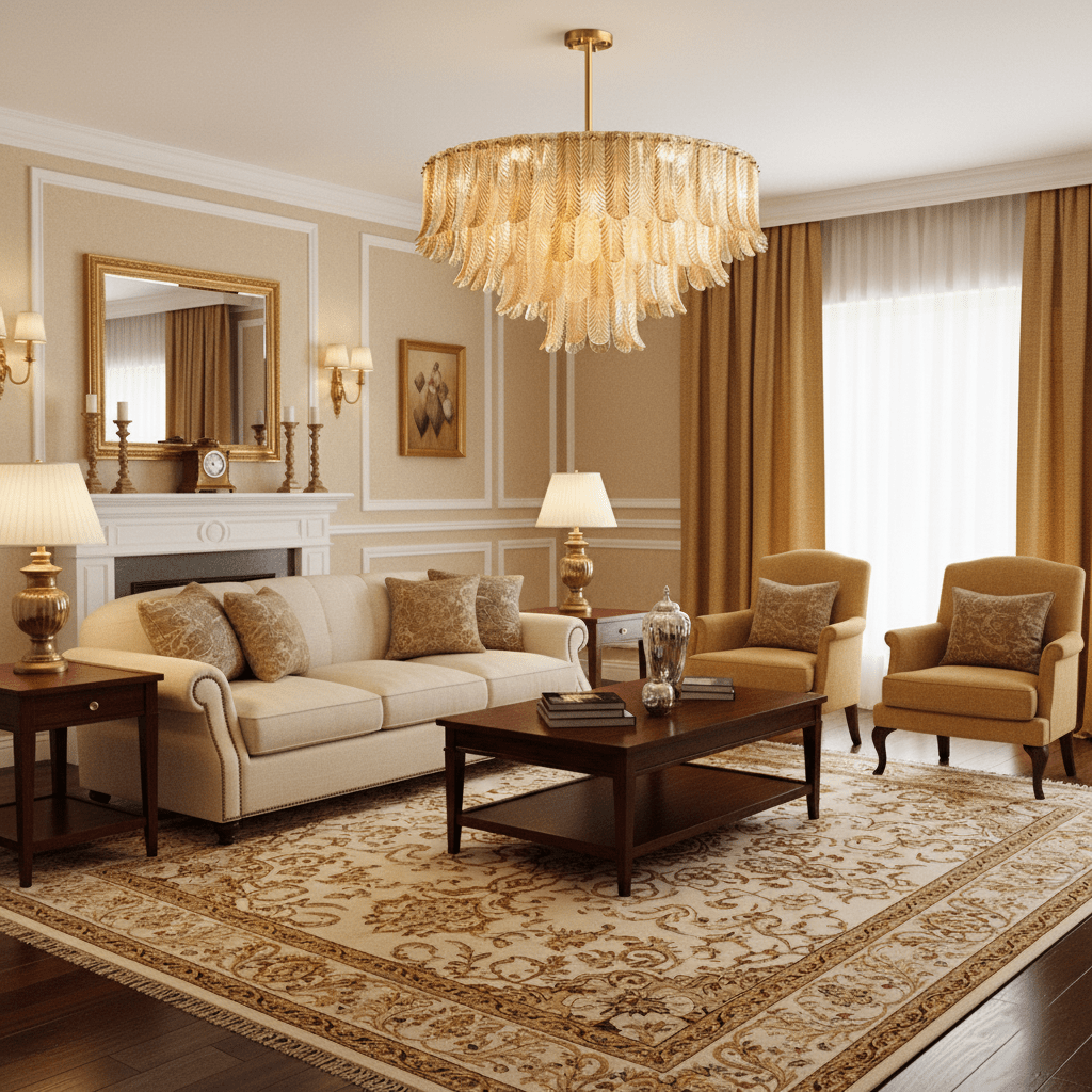 Chandeliers and Pendants: These are the focal points of the living room, especially in rooms with higher ceilings. To size appropriately, use the room dimension formula and ensure the fixture is in scale with the room’s layout. A general rule is to ensure there is at least 7 feet of clearance between the fixture and the floor.