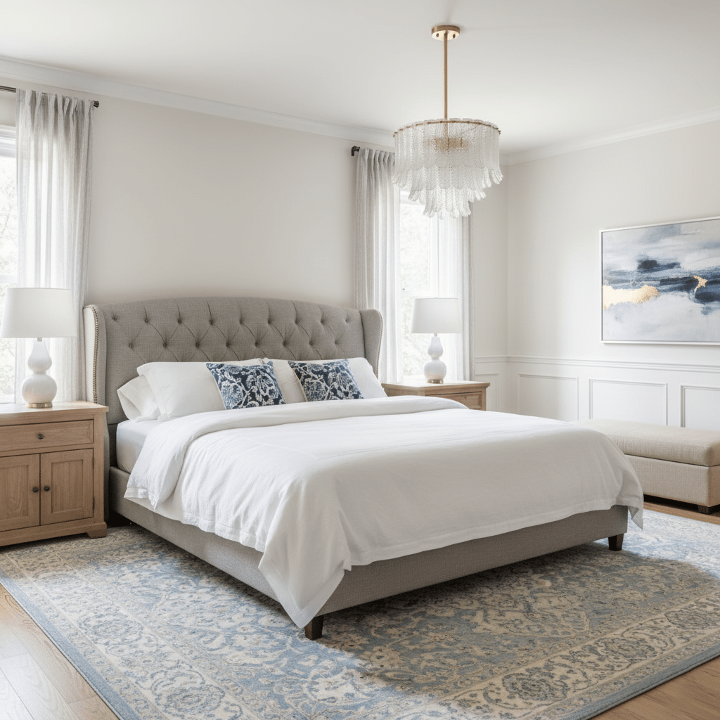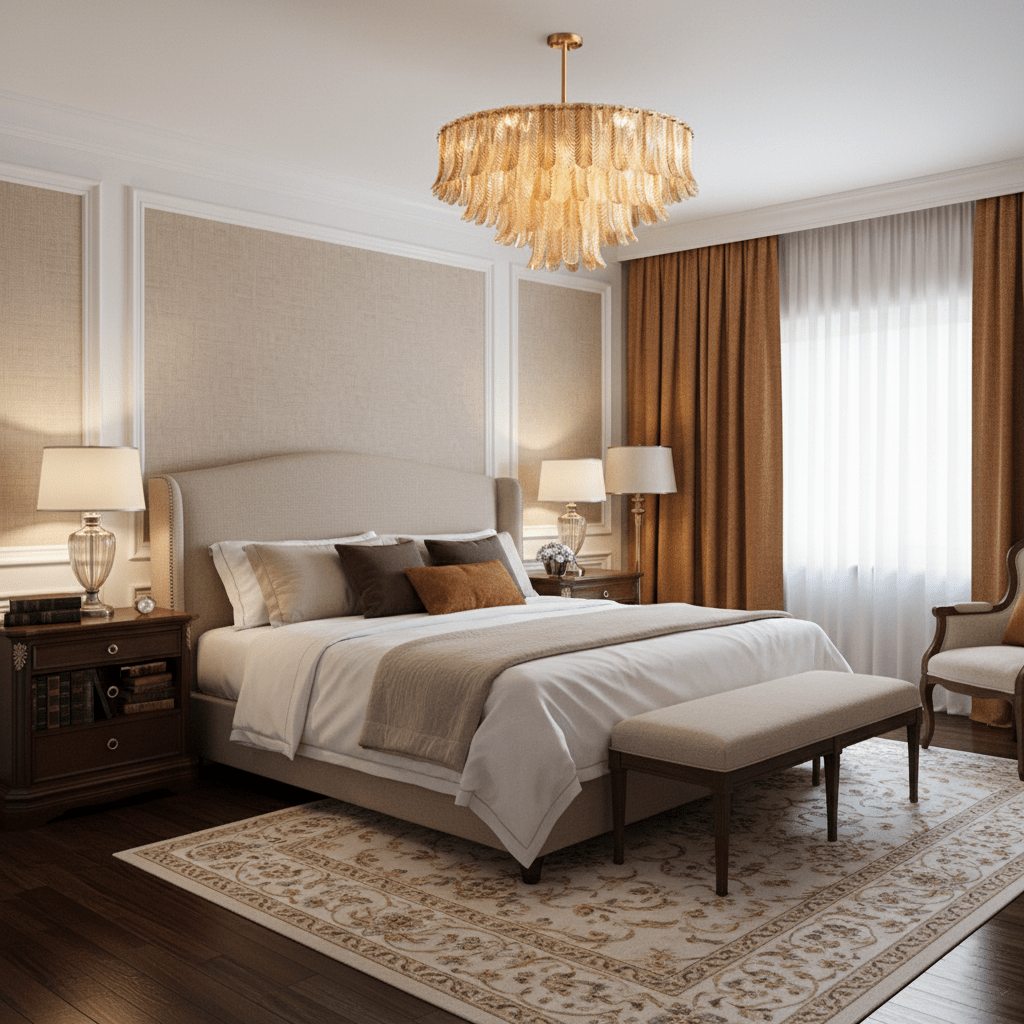 Ceiling Fixtures: Bedrooms benefit from soft, ambient lighting. Use the room dimension formula to ensure the ceiling fixture is properly scaled. Semi-flush or flush mounts work well for general lighting, while sconces or bedside lamps provide focused task lighting.