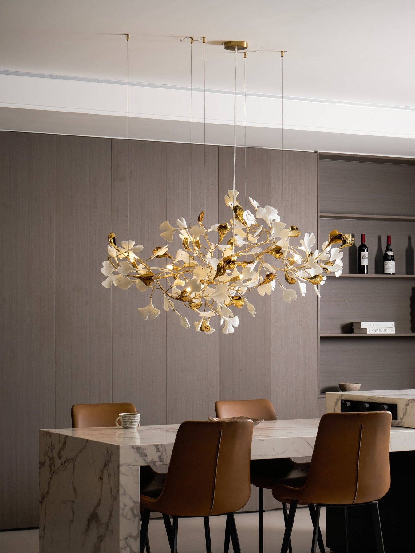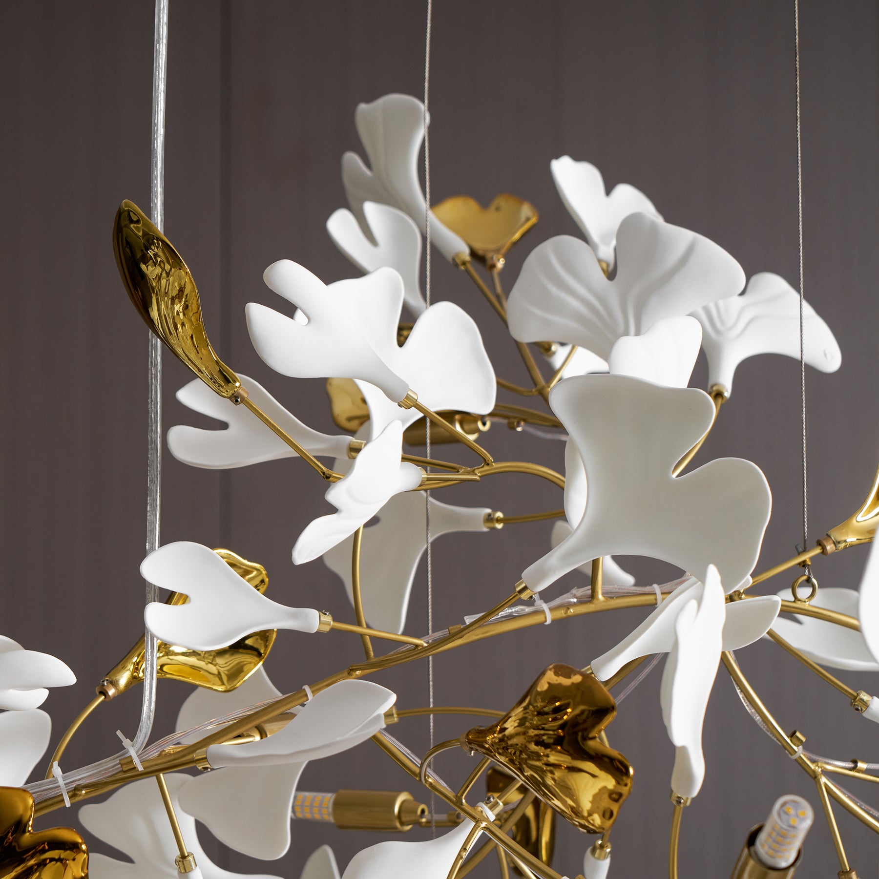 This ceramic ginkgo tree petal chandelier shows its luxurious style in overall design, material, and manufacturing technology. The metal lamp body is covered with exquisite ceramic petals, which reflect the perfect combination of lighting design and natural plants.