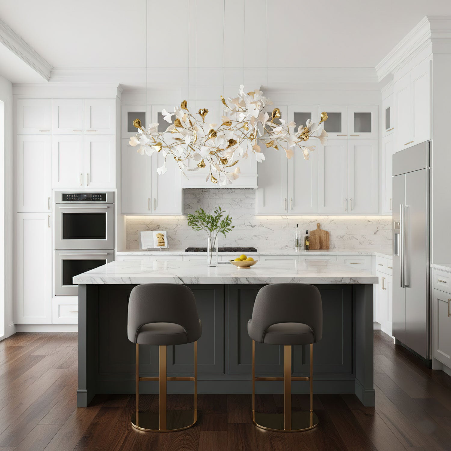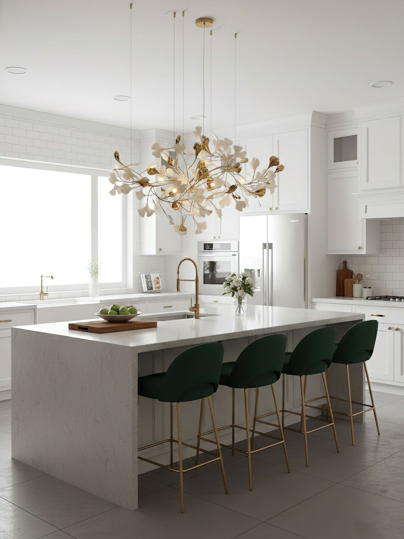 Pendants Over Island: These provide crucial task lighting for food prep and should hang 32-36 inches above the surface. Make sure that each pendant is about 1/4 the length of the island to provide sufficient coverage without overwhelming the space.