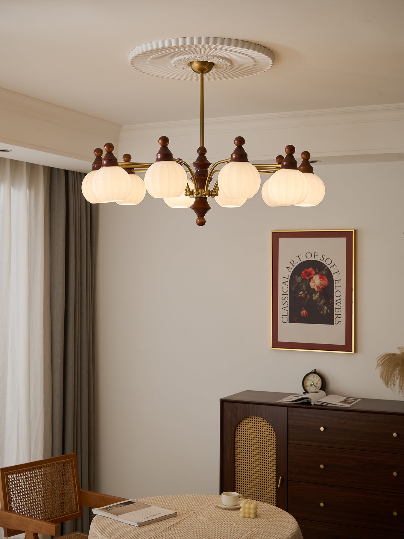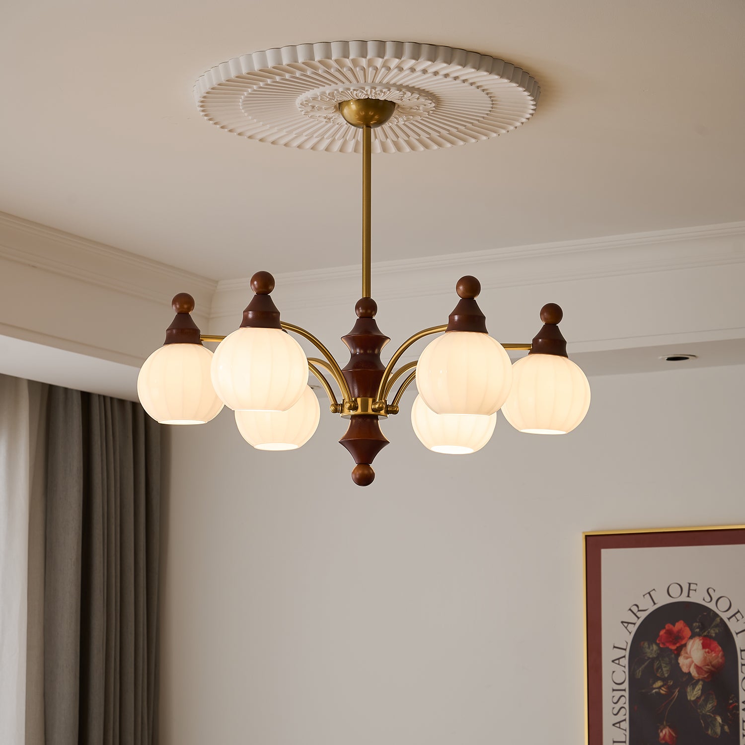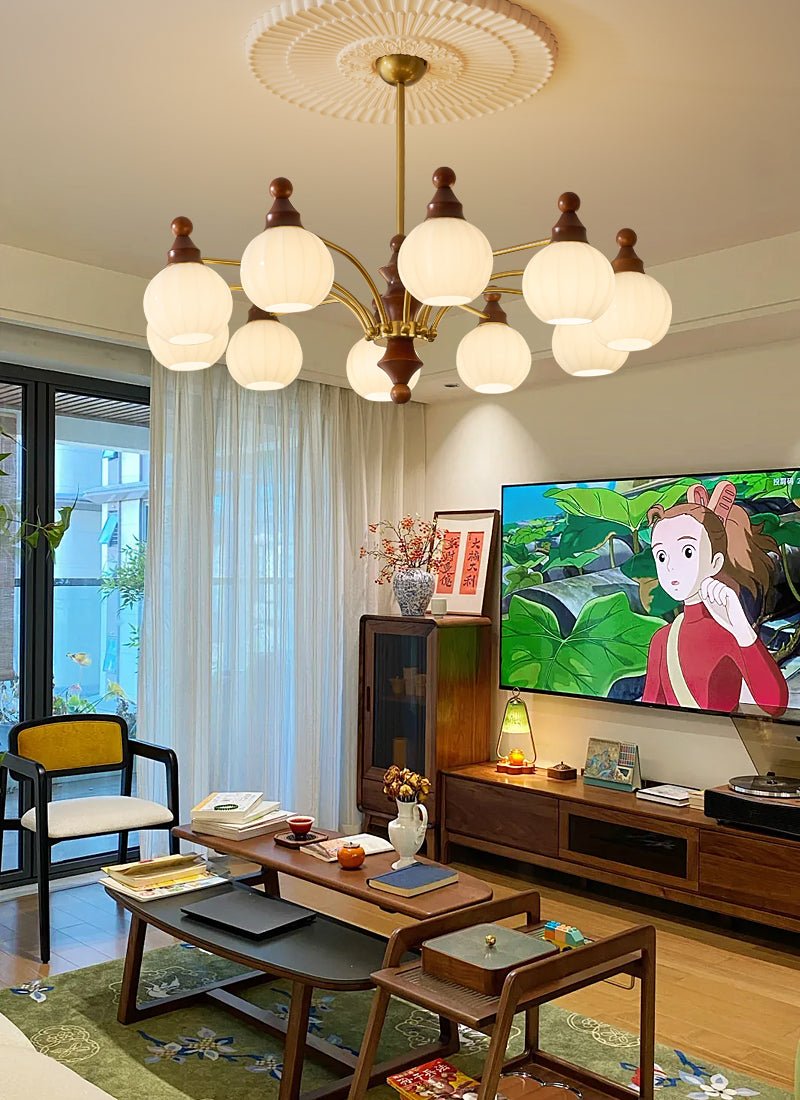 The Ophelia Blossom Chandelier by Vakkerlight features delicately shaped glass shades reminiscent of blooming flowers, paired with warm walnut and brass accents. This elegant design adds a timeless charm to any living or dining space, creating a soft and inviting glow.