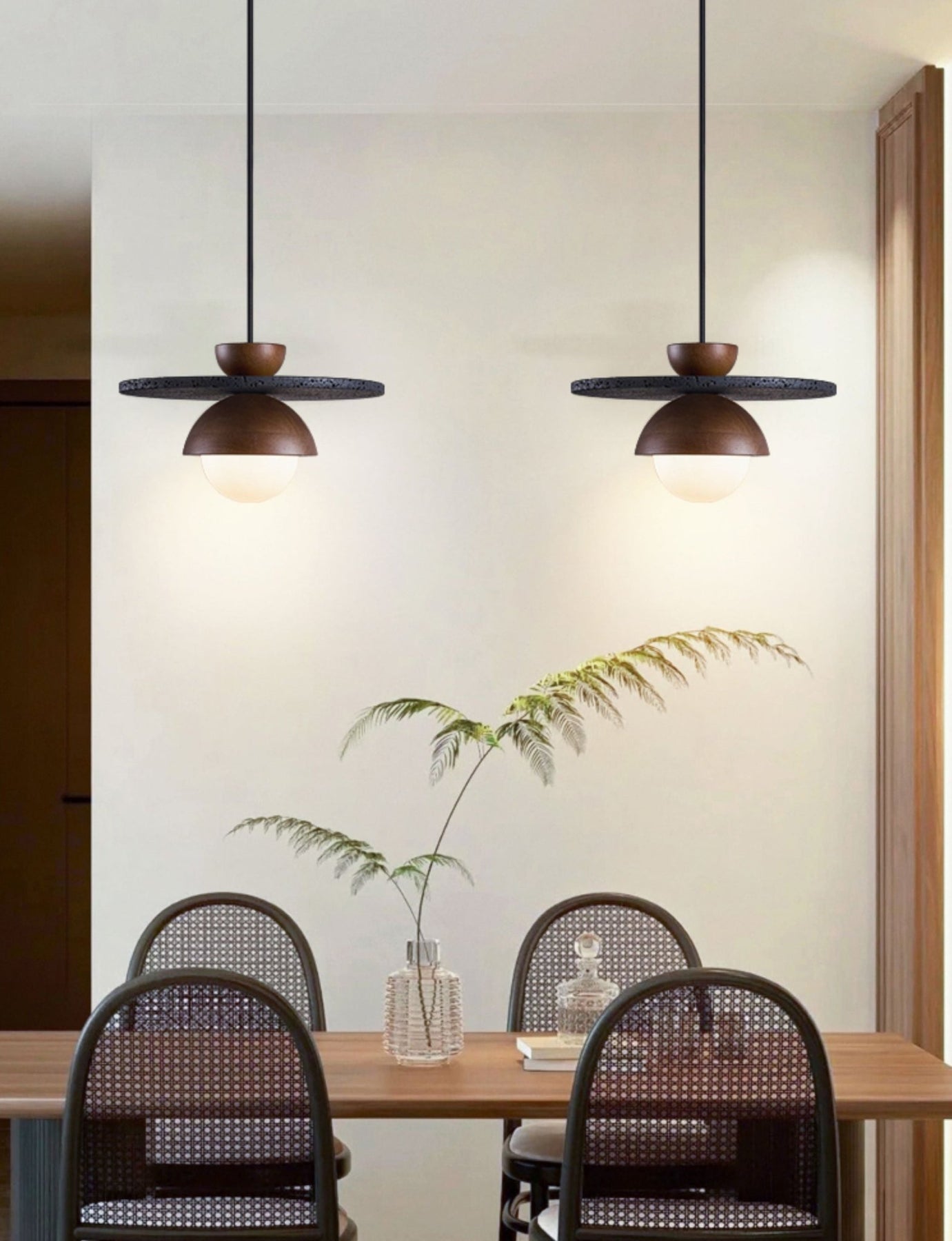 A striking, sculptural centerpiece combining raw texture and smooth geometry. This pendant features a warm Walnut Wood dome and a dramatic outer Disc of Porous Black Stone, layered around a luminous Opal Glass Sphere. It delivers ambient, diffused light, perfect for adding an organic, artistic focal point to modern living and dining spaces.
