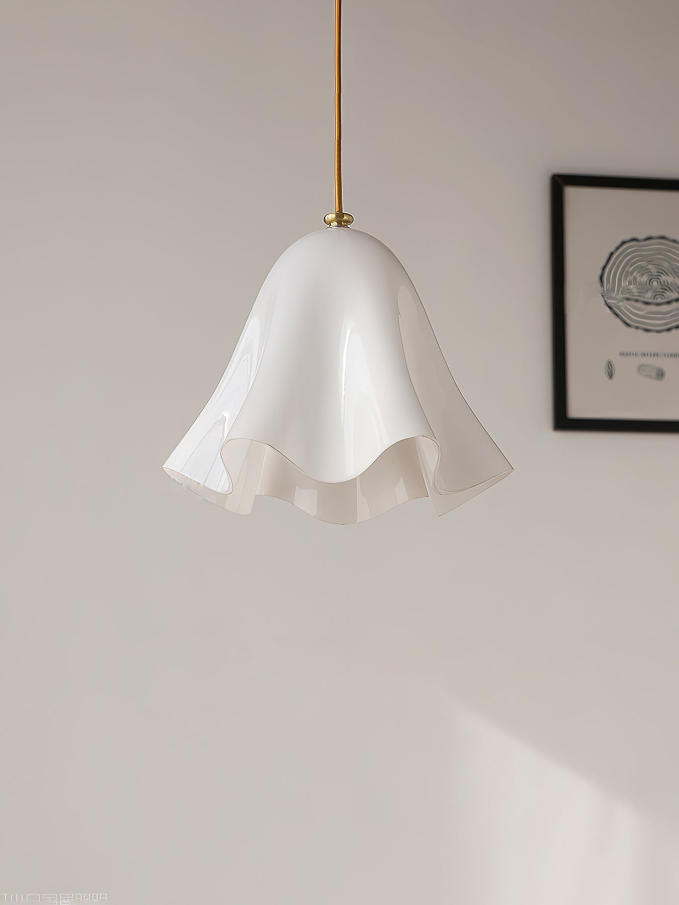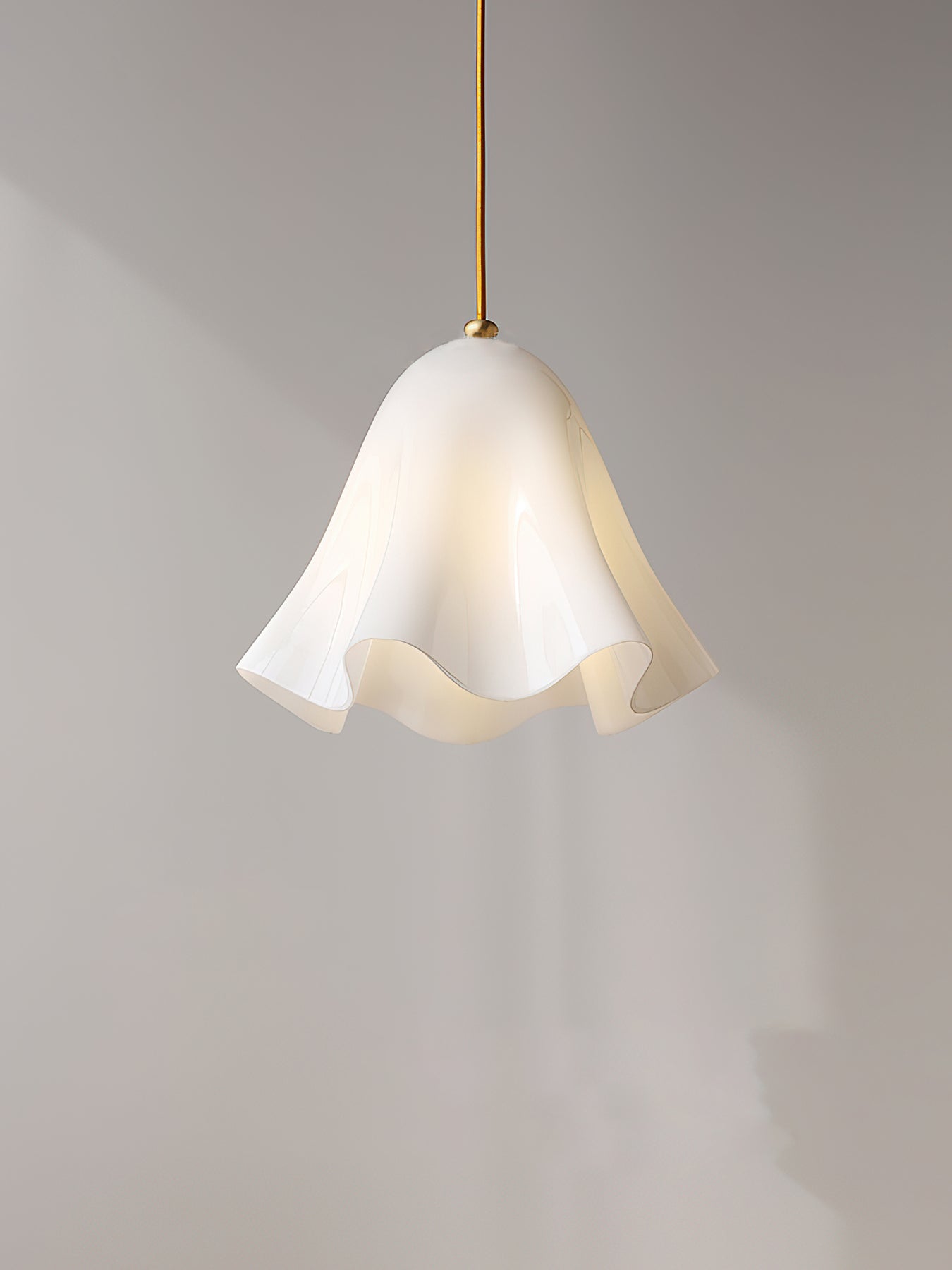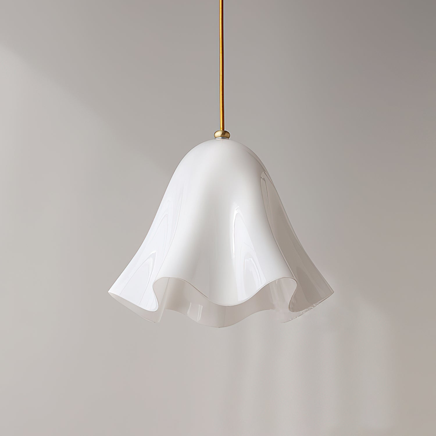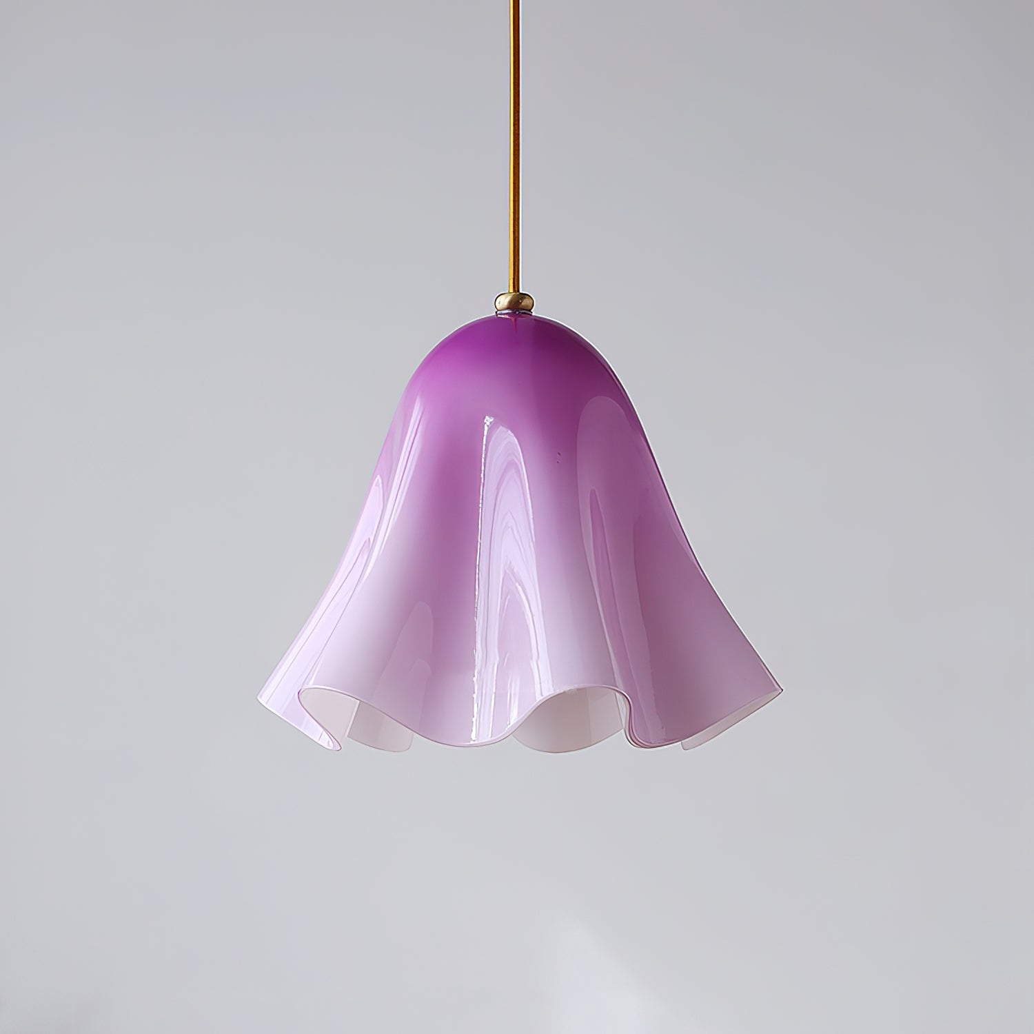 The Vera Bloom Pendant Lamp captures the elegant beauty of blooming flowers in shimmering glass. Its soft gradient colors create a dreamy glow, while its undulating silhouette adds a touch of movement and artistic flair to any space. Suspended from a sleek brass canopy, this chandelier is perfect for adding warmth and elegance to a dining room, bedroom, or creative nook. A true statement piece, it blends soft colors with a sculptural form, bringing light and poetry to your home.