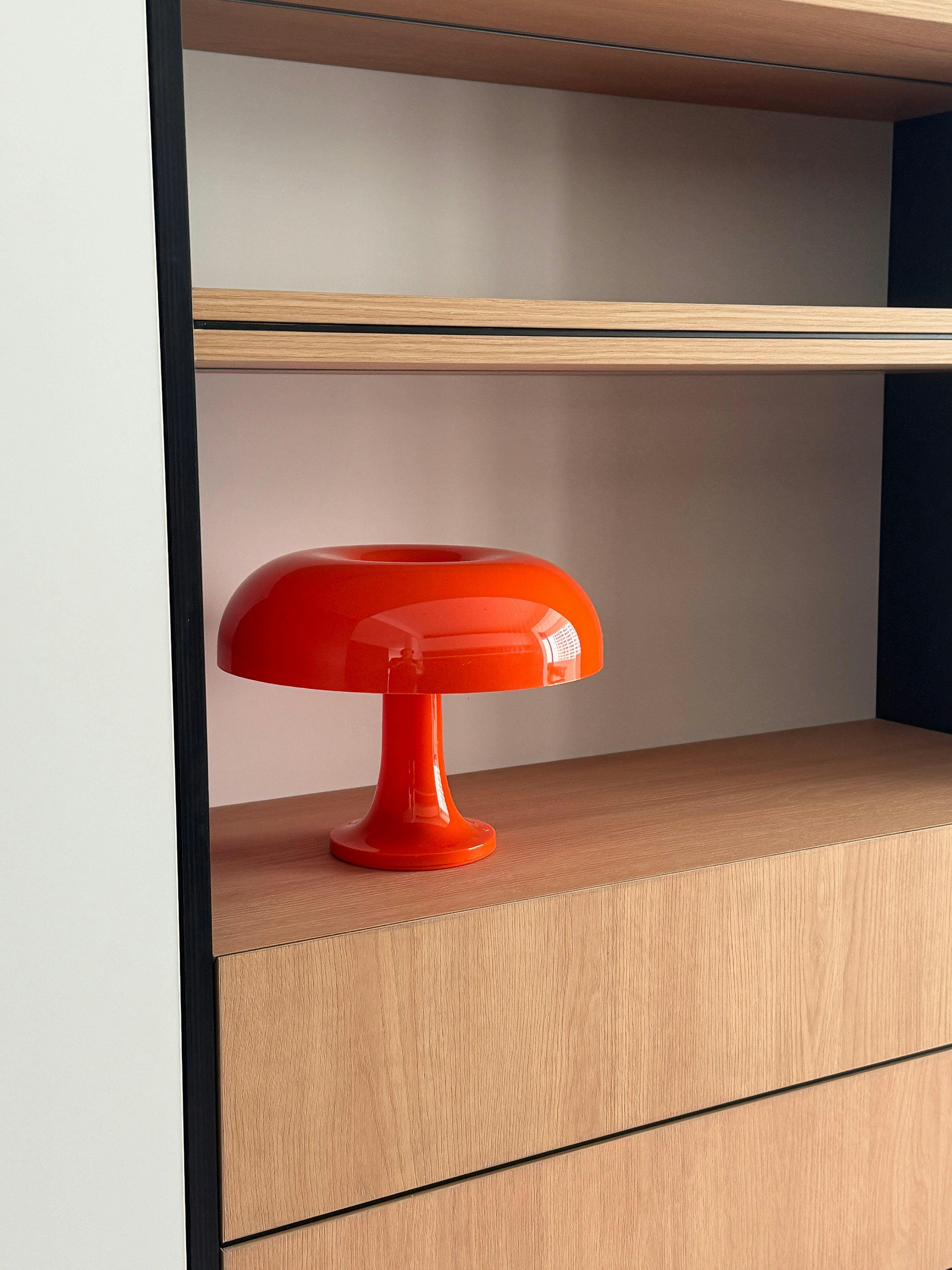 Originally released in 1965, the Mushroom Table Lamp showcases the wonders of ABS thermoplastic injection molding, bringing an industrial touch to any home or office. A symbol of futurism and democratic design, it is a staple in major design museums. Available in orange and white, this lamp adds a playful yet sophisticated element to your decor.