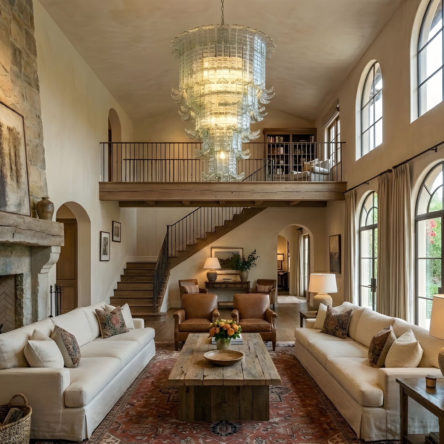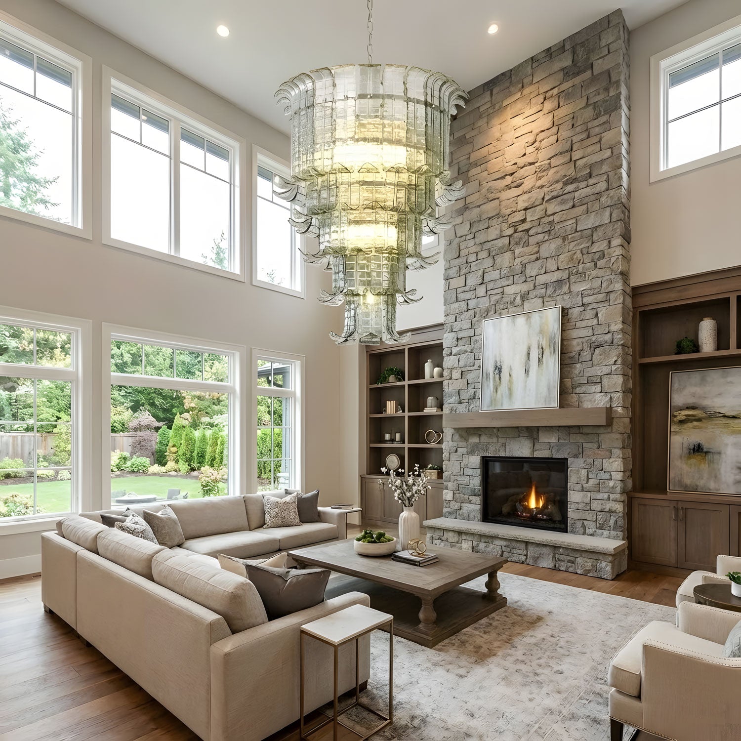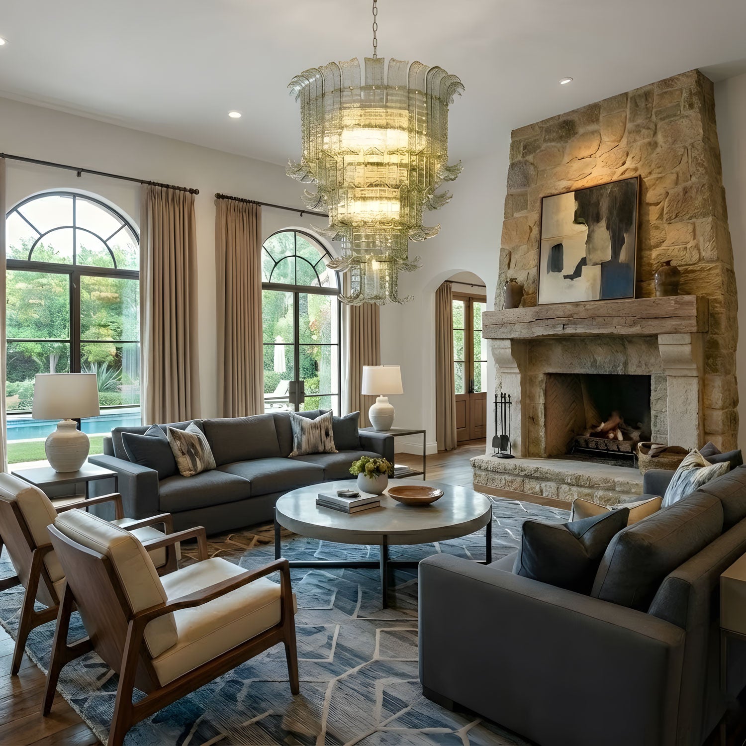 Chandeliers and Pendants: These are the focal points of the living room, especially in rooms with higher ceilings. To size appropriately, use the room dimension formula and ensure the fixture is in scale with the room’s layout. A general rule is to ensure there is at least 7 feet of clearance between the fixture and the floor.