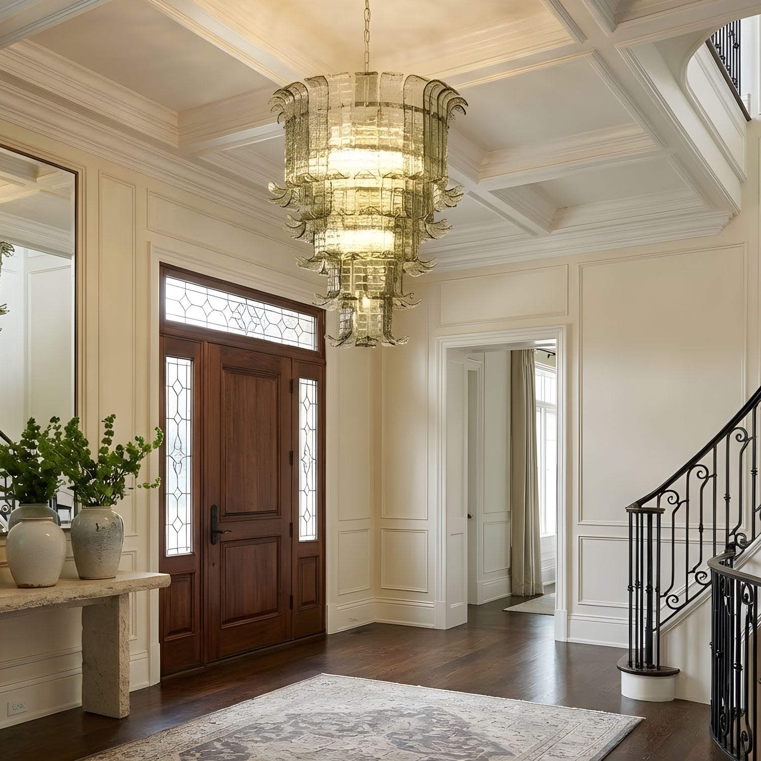 Chandeliers: The entryway is the perfect spot for a statement chandelier. Use the length + width formula to determine the diameter, and ensure the fixture hangs at least 7 feet from the floor to allow clearance.