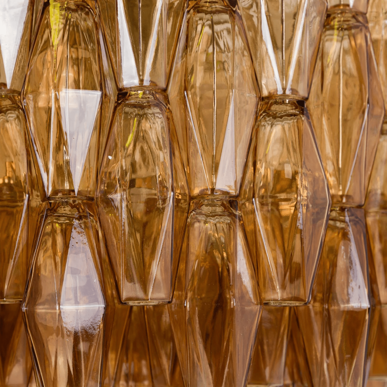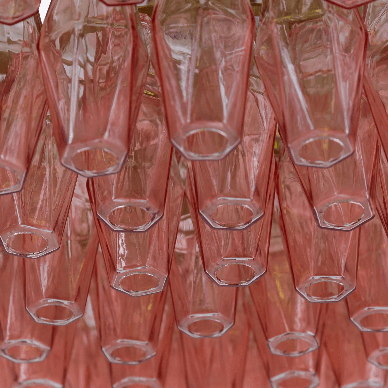 The Drum Sorrento Chandelier showcases a refined design with polyhedrons of colored glass, available in pink or amber. Its versatile drum shape complements diverse interiors, making it suitable for living rooms, dining areas, or dressing rooms. This chandelier combines artistic craftsmanship with adaptable style, enhancing any space with subtle elegance and vibrant color accents.