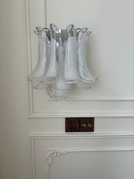 The Horseshoe Wall Lamp is a striking piece that blends modern sophistication with a unique, eye-catching design. Shaped like a horseshoe, the lamp’s cascading glass elements mimic flowing petals, offering a soft, diffused glow that creates a warm and welcoming atmosphere. The chrome-plated base provides a sleek, polished contrast, enhancing its contemporary appeal. Ideal for living rooms, bedrooms, or hallways, this wall lamp serves as both a functional light source and a stylish accent, making it the perfect addition to any modern home looking to add a touch of elegance and charm.