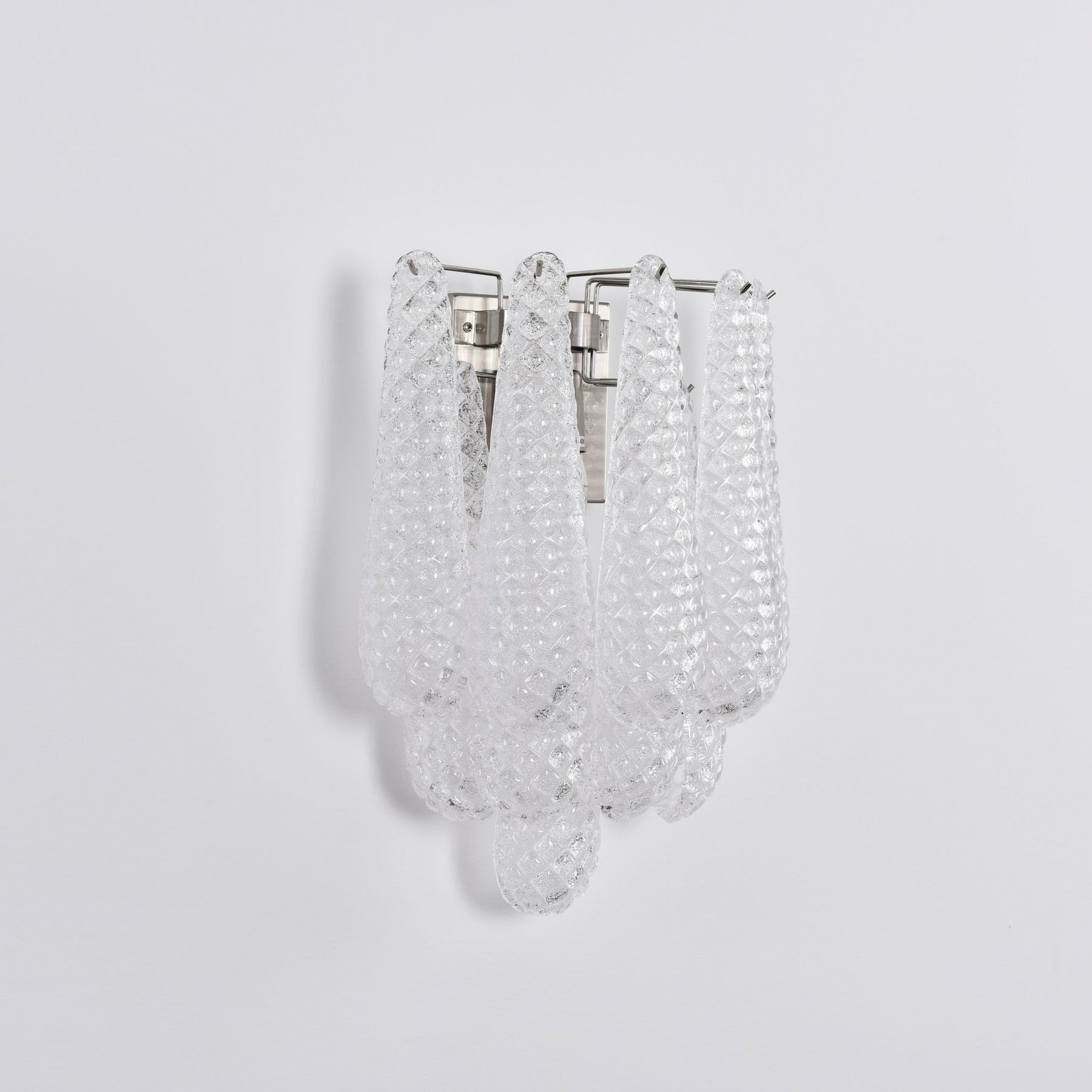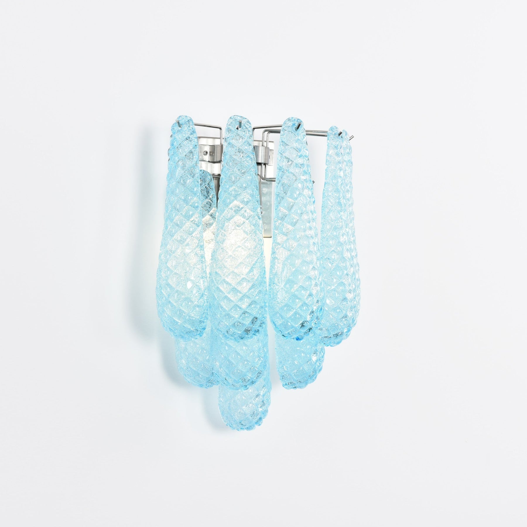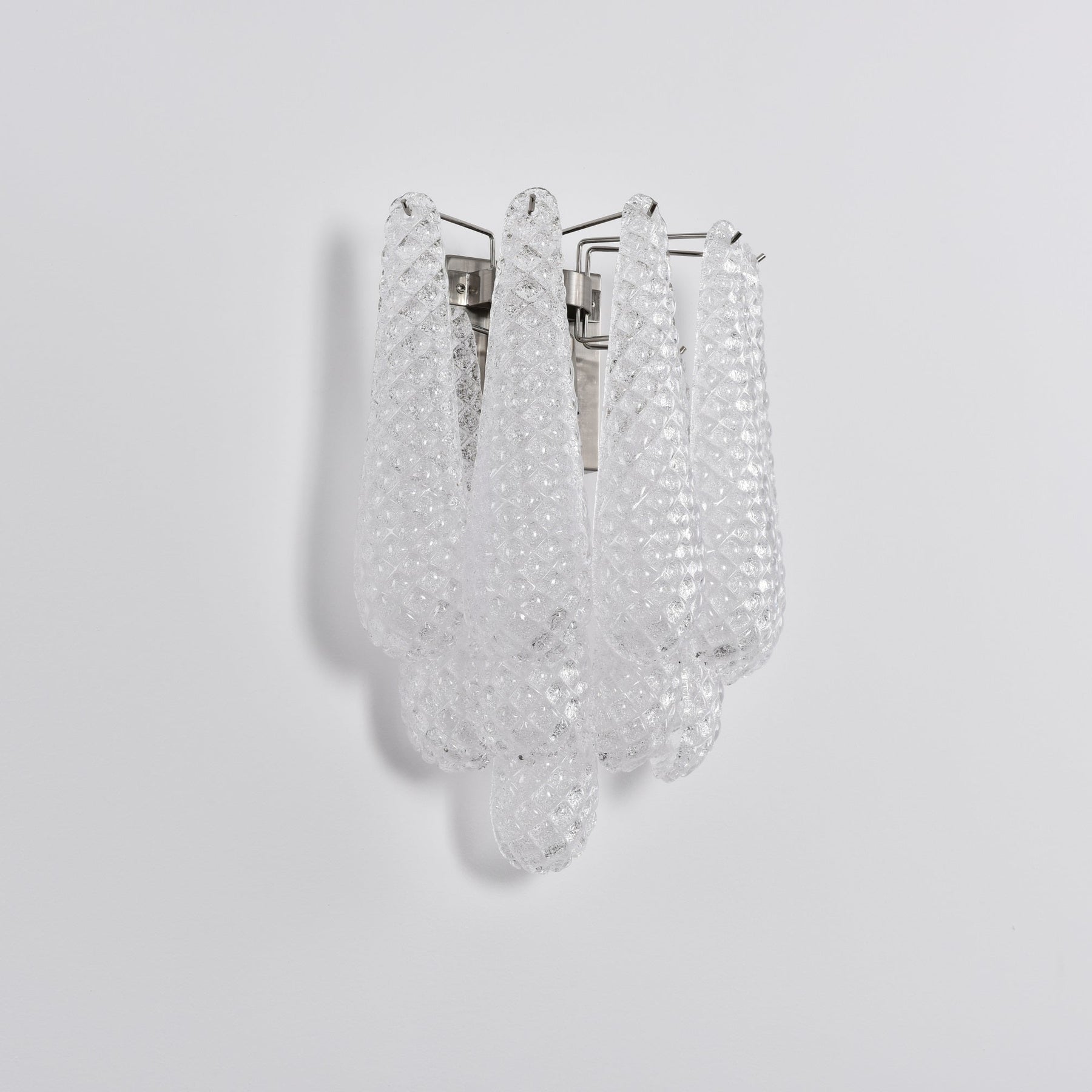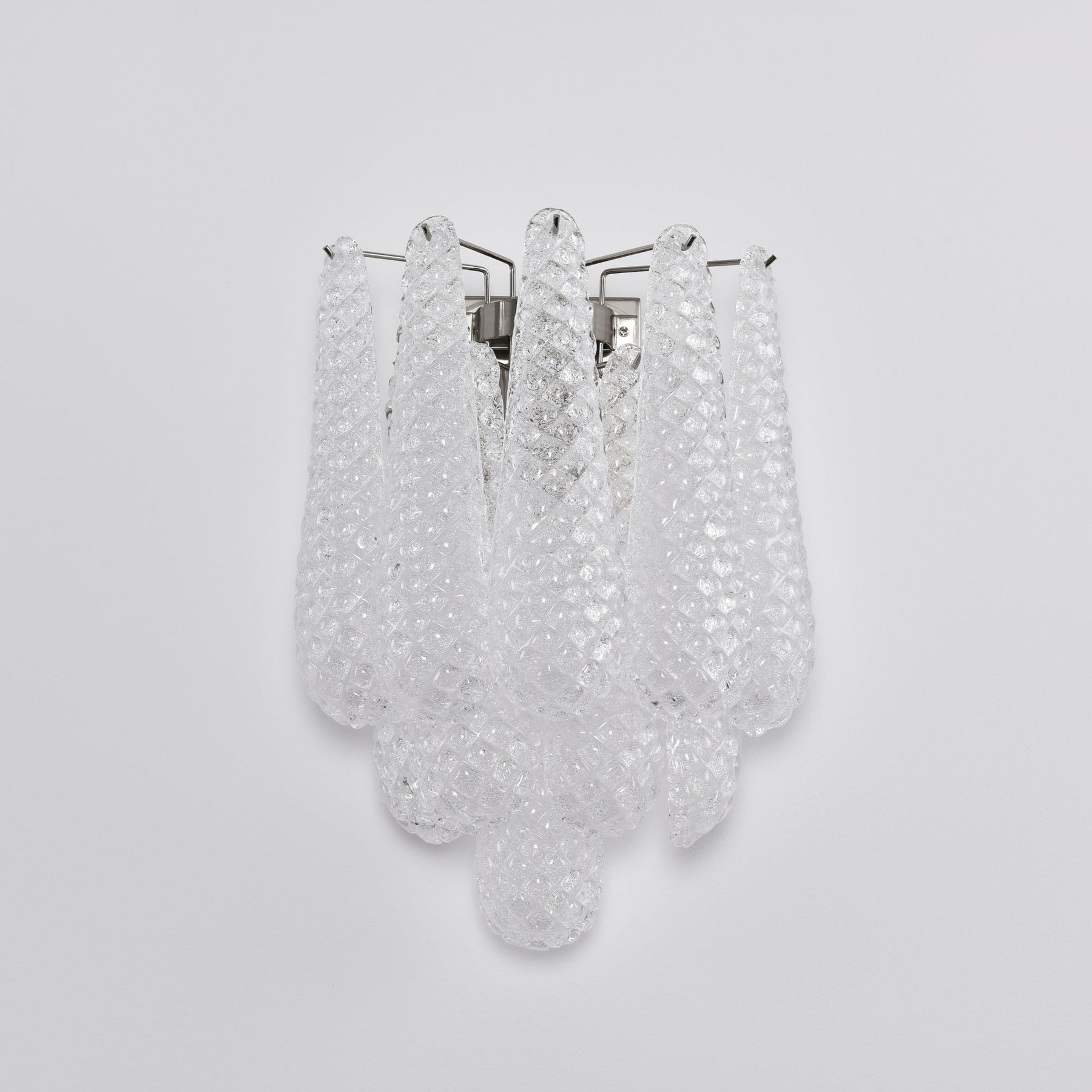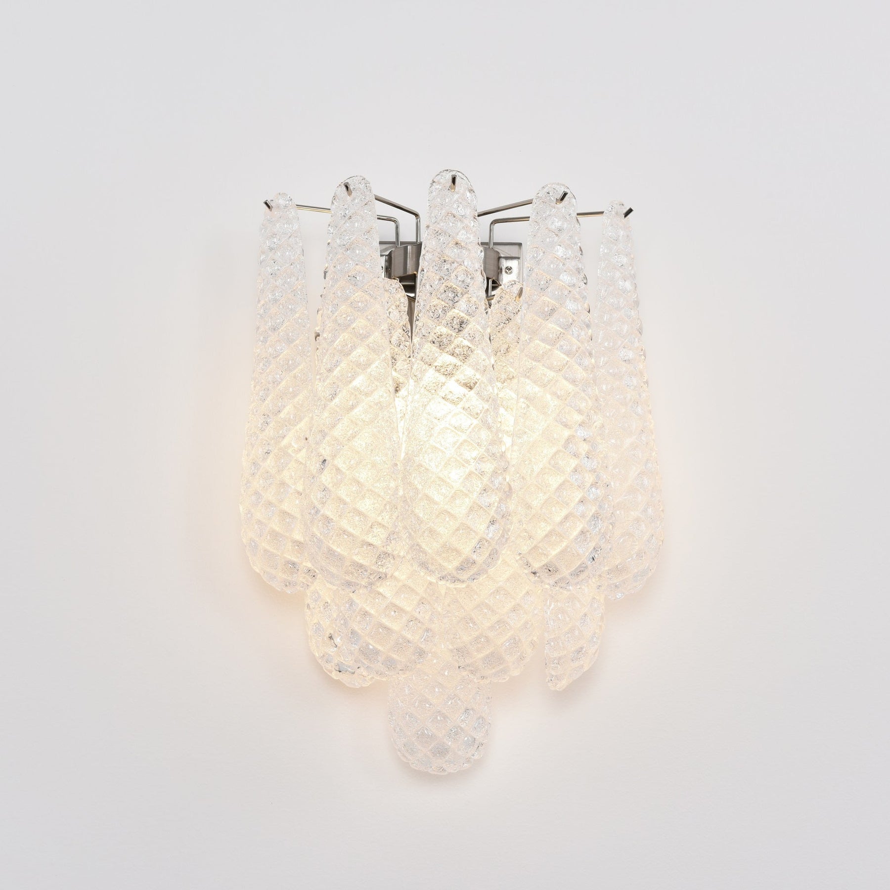 Bring a touch of elegance and artistry to your interior with the Lagoon Bloom Wall Lamp by Vakkerlight. This stunning wall fixture features hand-blown glass in a textured teardrop shape, layered to create a cascading floral silhouette. Each piece captures and reflects light beautifully, creating a soft, ambient glow that transforms any room.