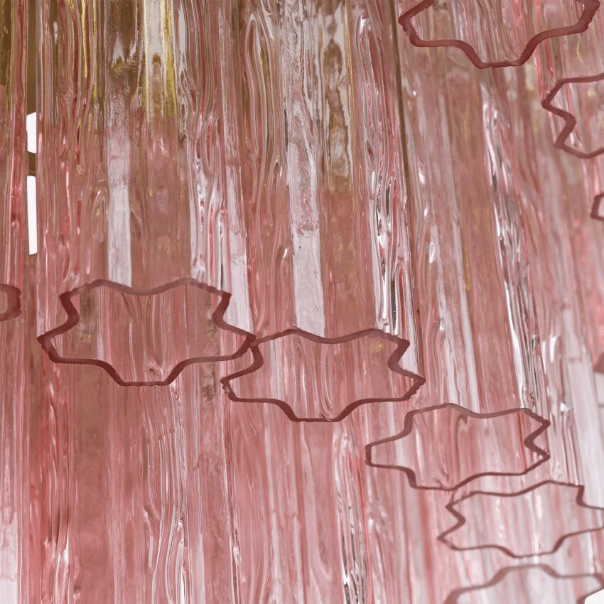 Five tiers of fluted glass tubes cascade elegantly in this mid-century inspired chandelier. Each textured glass tube is meticulously suspended from a premium Satin gold frame, creating a sophisticated architectural statement. Available in three distinct colorways: rich Smoked Quartz for dramatic depth, delicate blush Pink for subtle warmth, or classic clear glass for timeless versatility. The tiered arrangement ensures optimal light diffusion while maintaining the authentic aesthetic of mid-century design principles.