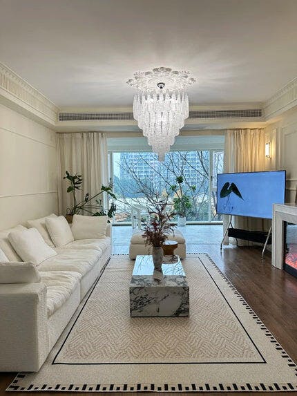 Chandeliers and Pendants: These are the focal points of the living room, especially in rooms with higher ceilings. To size appropriately, use the room dimension formula and ensure the fixture is in scale with the room’s layout. A general rule is to ensure there is at least 7 feet of clearance between the fixture and the floor.