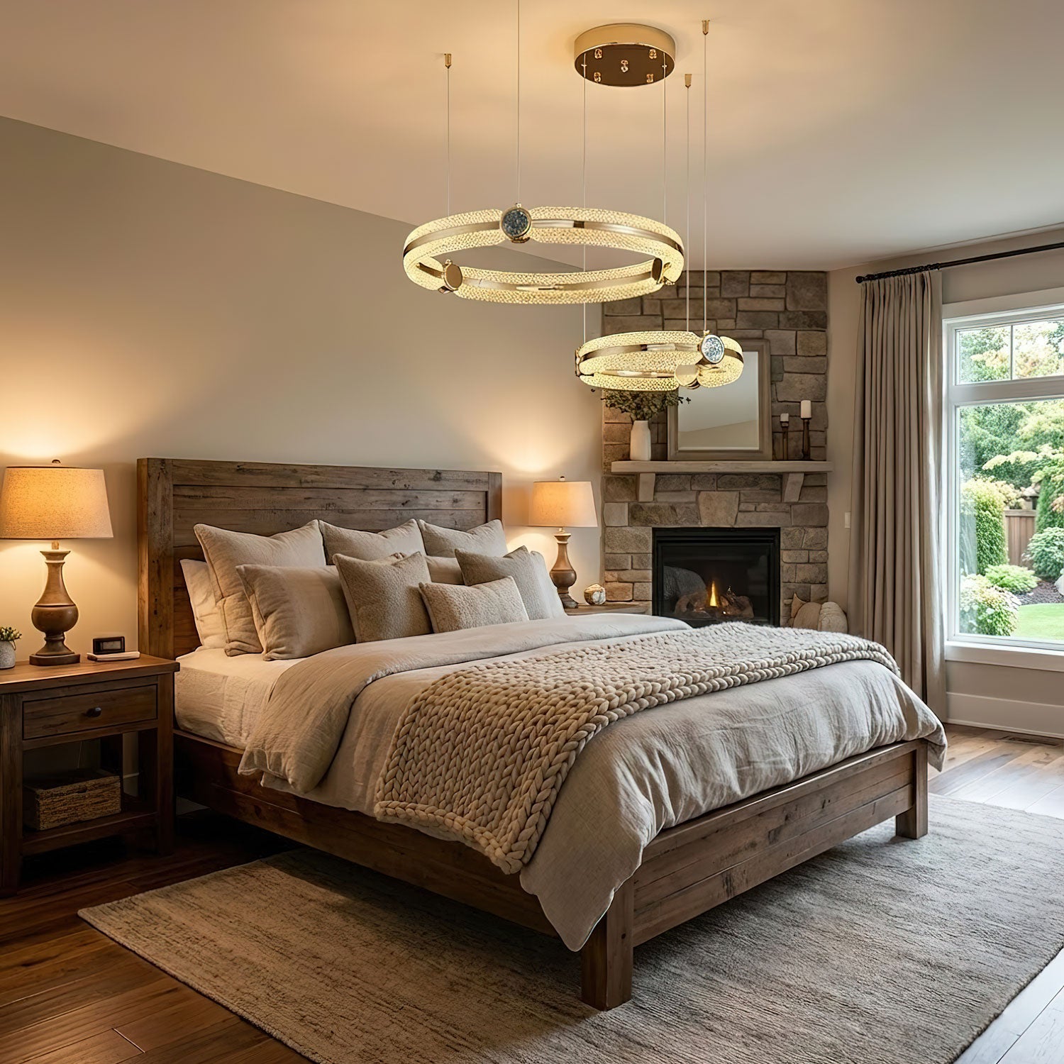 Ceiling Fixtures: Bedrooms benefit from soft, ambient lighting. Use the room dimension formula to ensure the ceiling fixture is properly scaled. Semi-flush or flush mounts work well for general lighting, while sconces or bedside lamps provide focused task lighting.