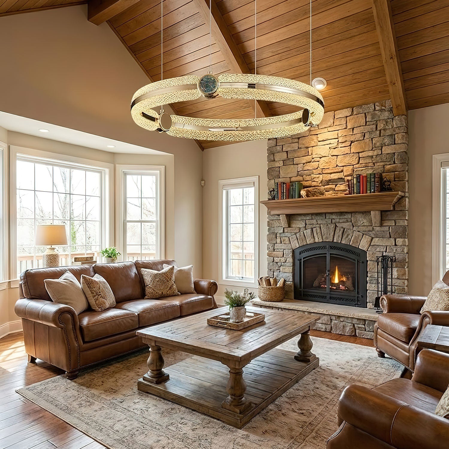 Chandeliers and Pendants: These are the focal points of the living room, especially in rooms with higher ceilings. To size appropriately, use the room dimension formula and ensure the fixture is in scale with the room’s layout. A general rule is to ensure there is at least 7 feet of clearance between the fixture and the floor.