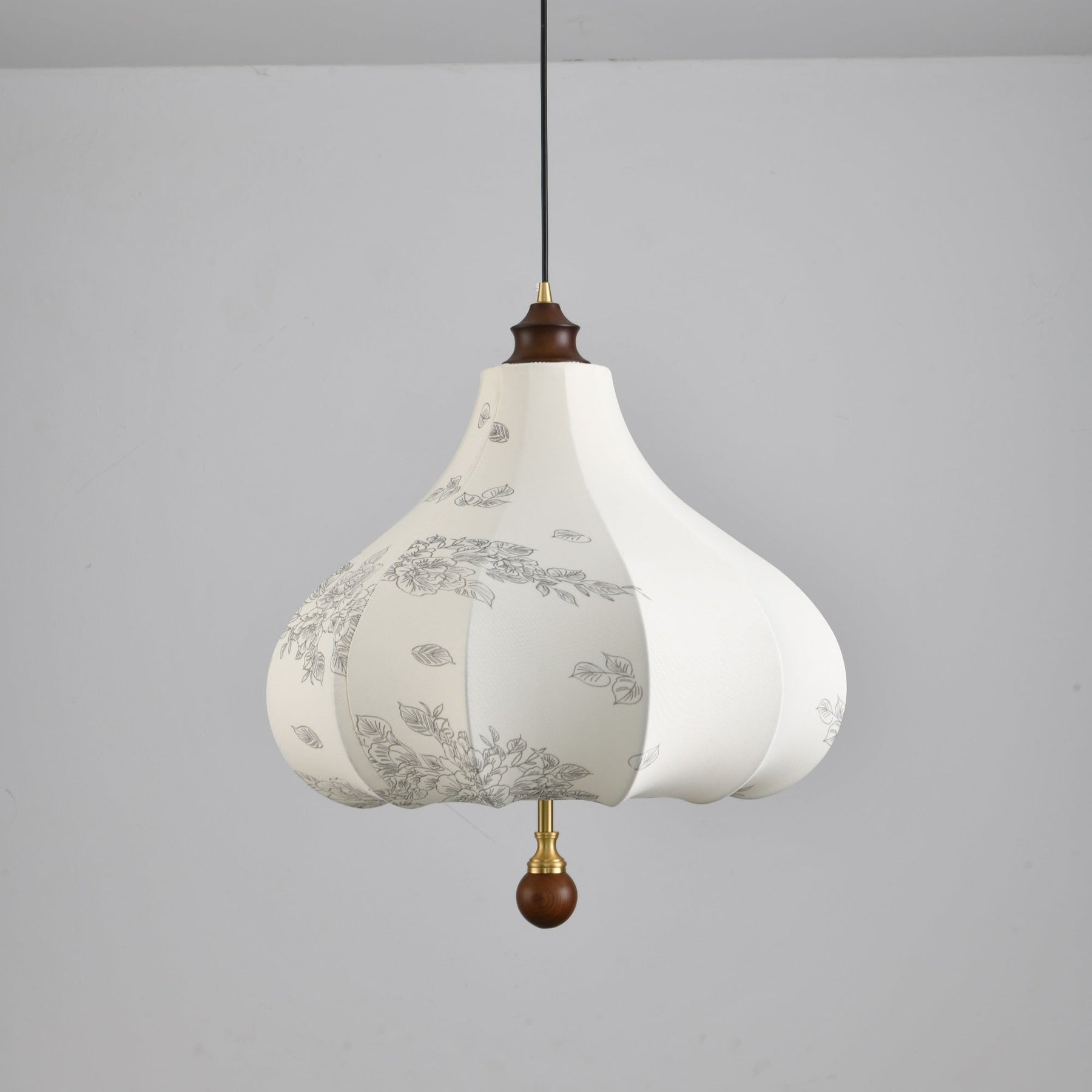 Inspired by the elegance of vintage lanterns, the Blossom Lantern Pendant Light features a delicately patterned fabric shade with soft floral motifs, paired with warm walnut wood and golden brass accents. Its graceful curves and gentle glow bring a touch of romantic charm to dining rooms, living spaces, or bedrooms. Perfect for creating a cozy, nostalgic atmosphere with timeless appeal.