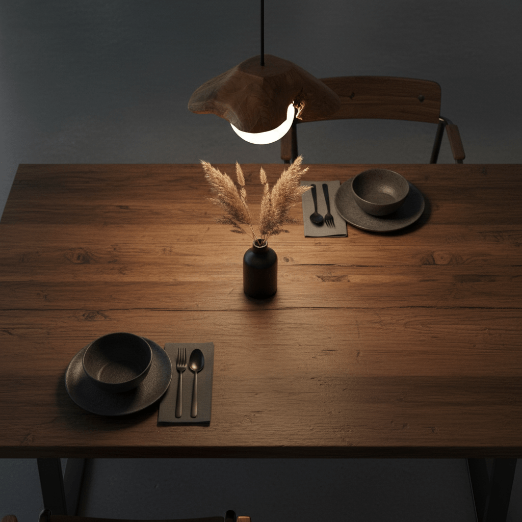 The Lunawood Halo is a pendant light that captures the spirit of ancient forests and celestial light. Suspended by a minimalist black cord, this piece features a hand-shaped wooden canopy, naturally contoured and polished to reveal the rich character of the grain. Beneath it glows a perfect opaline sphere, like a moon cradled in a woodland canopy. The interplay of organic asymmetry and refined illumination makes this lamp a poetic centerpiece—equally at home in modern, rustic, or nature-inspired interiors. Each piece is one-of-a-kind, honoring the unpredictability of raw wood.