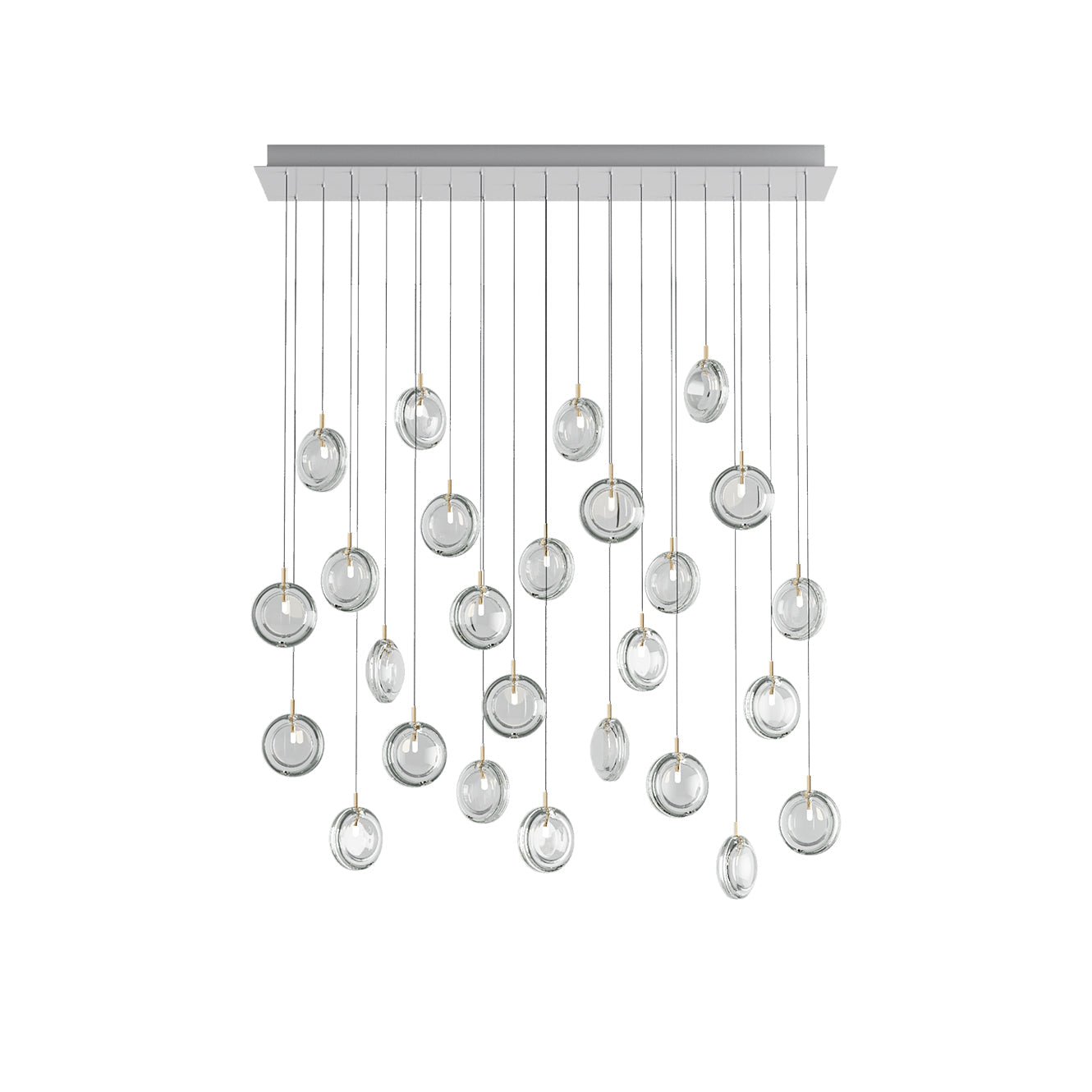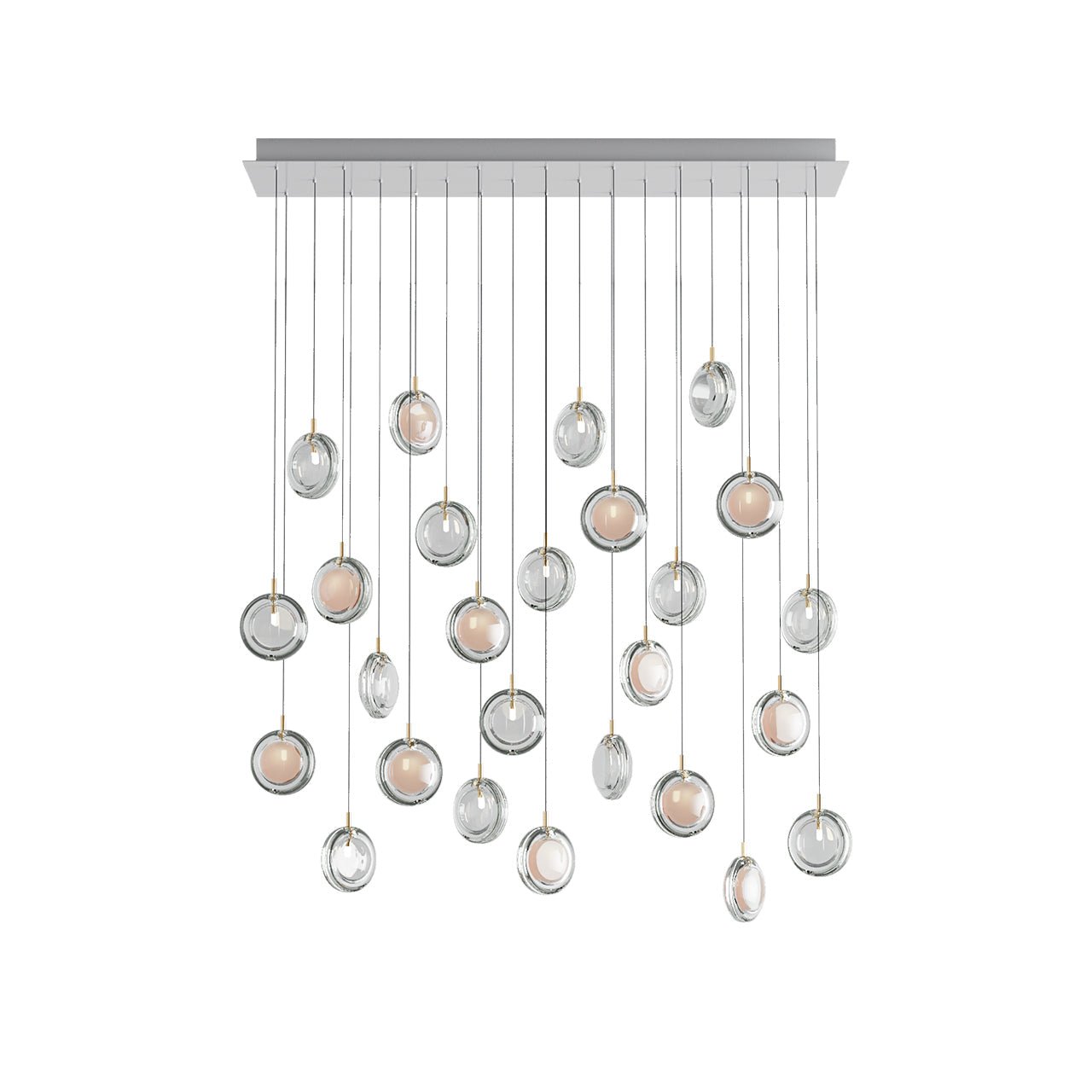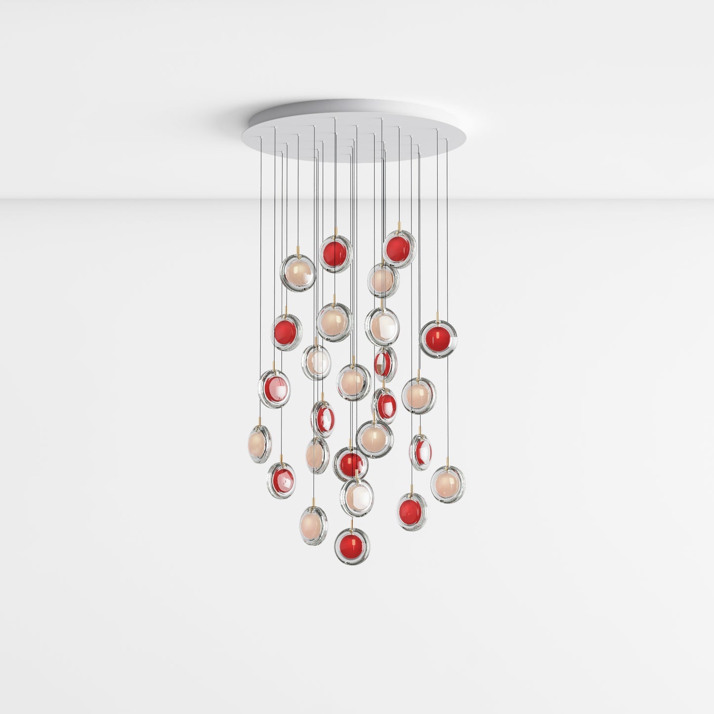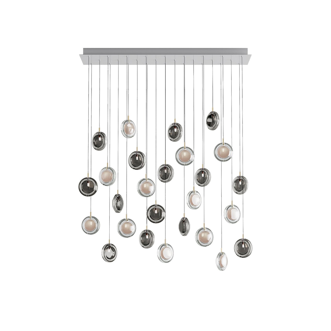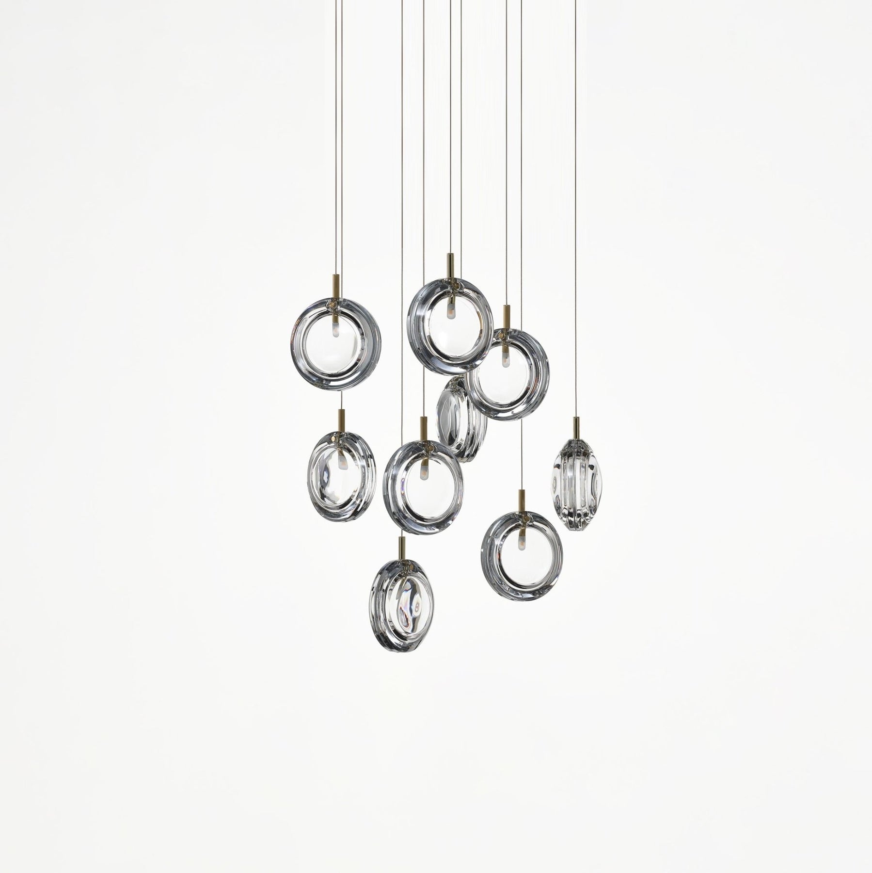 The Lens Round Chandelier elegantly harnesses the principle of light refraction through dual lenses, creating a dynamic interplay of light and shadow. Its design not only produces a mesmerizing visual symphony but also offers custom color variations enhanced by a specialized hand-painting technique. With its refined canopy details and hypnotic form, this chandelier stands as a sophisticated focal point, elevating any interior with a unique, artful lighting presence.