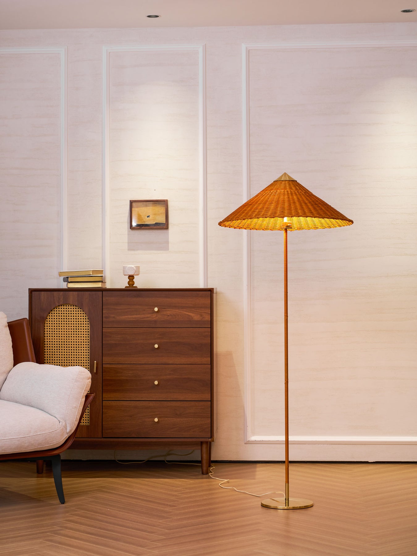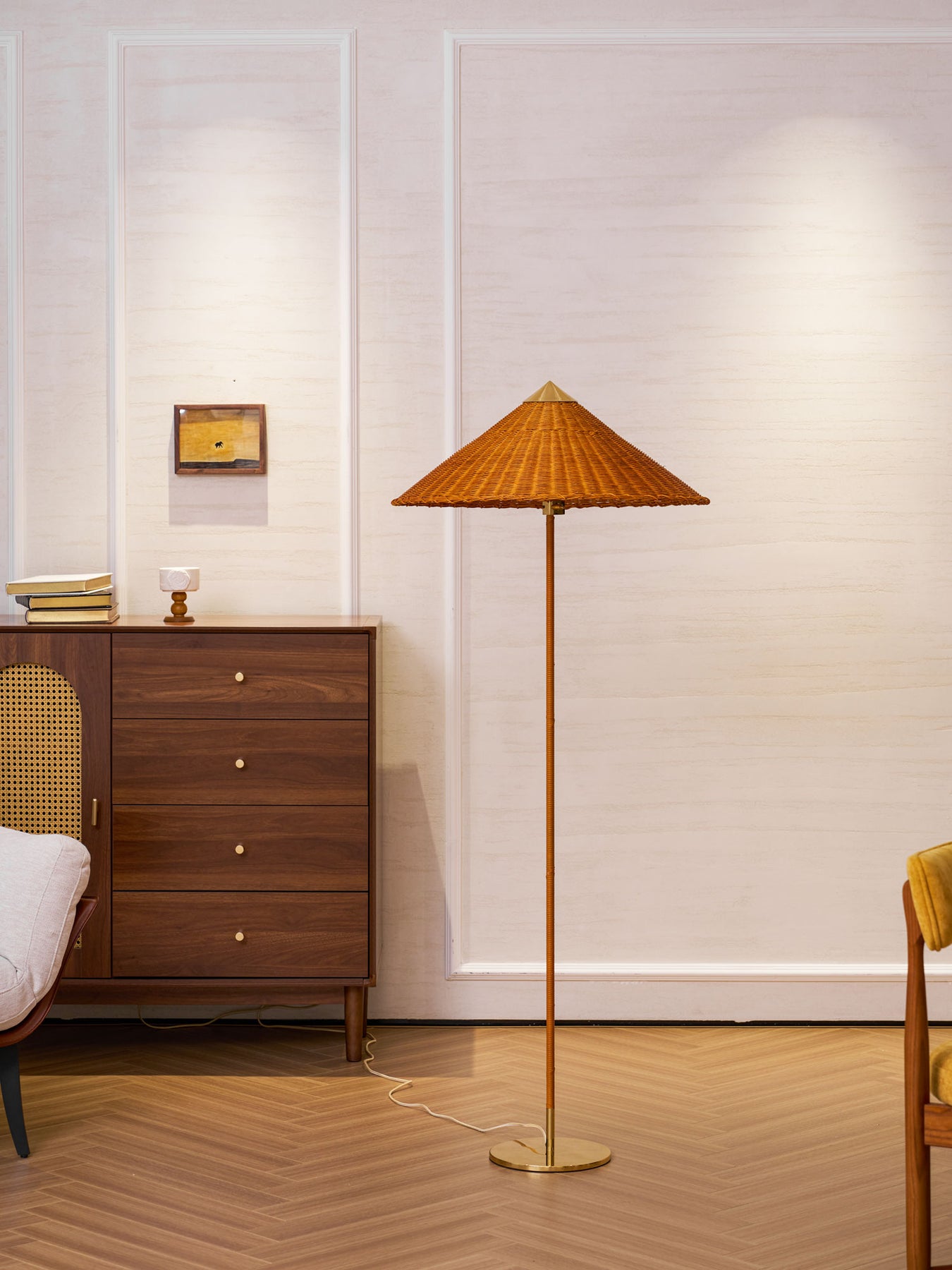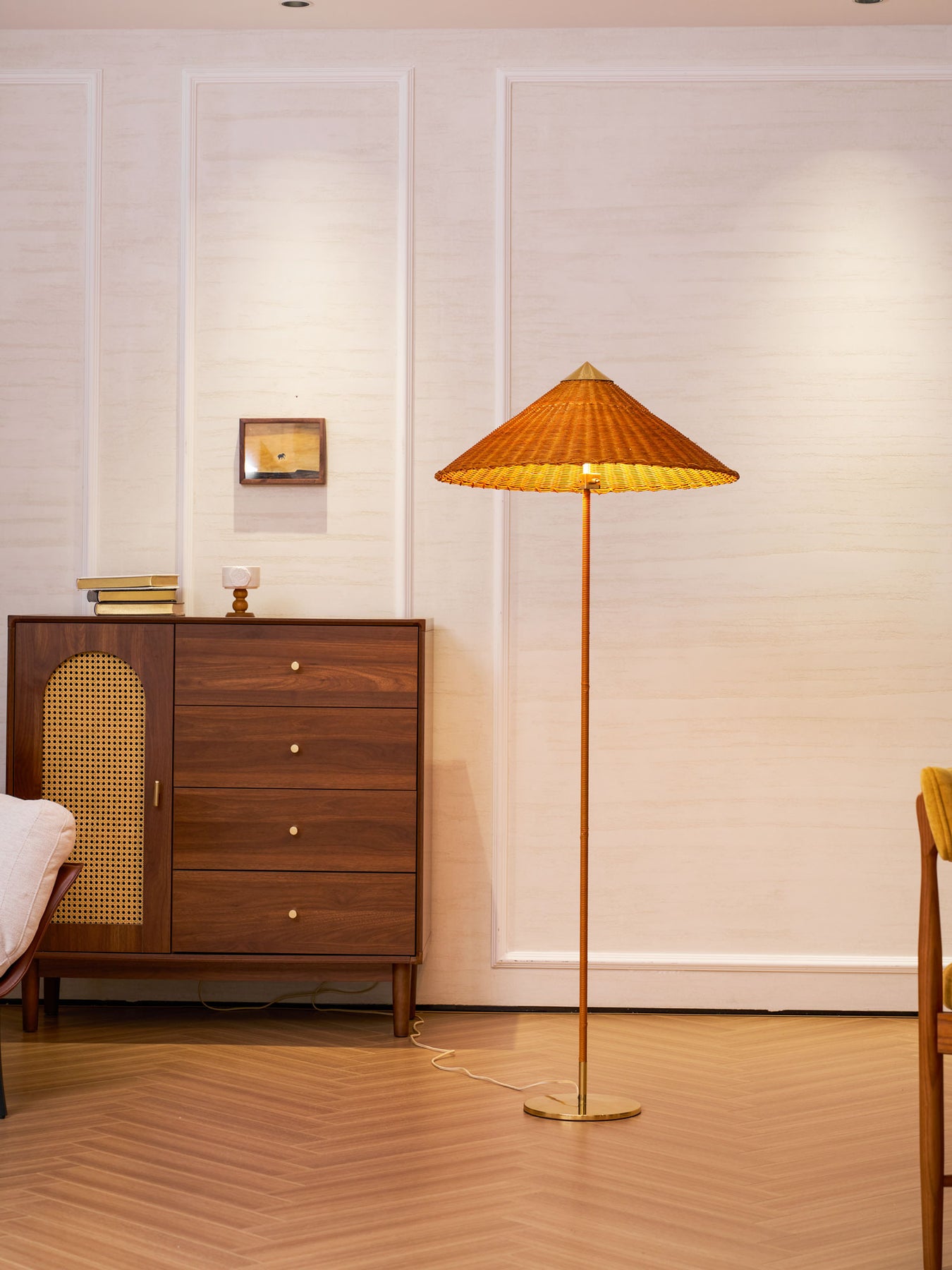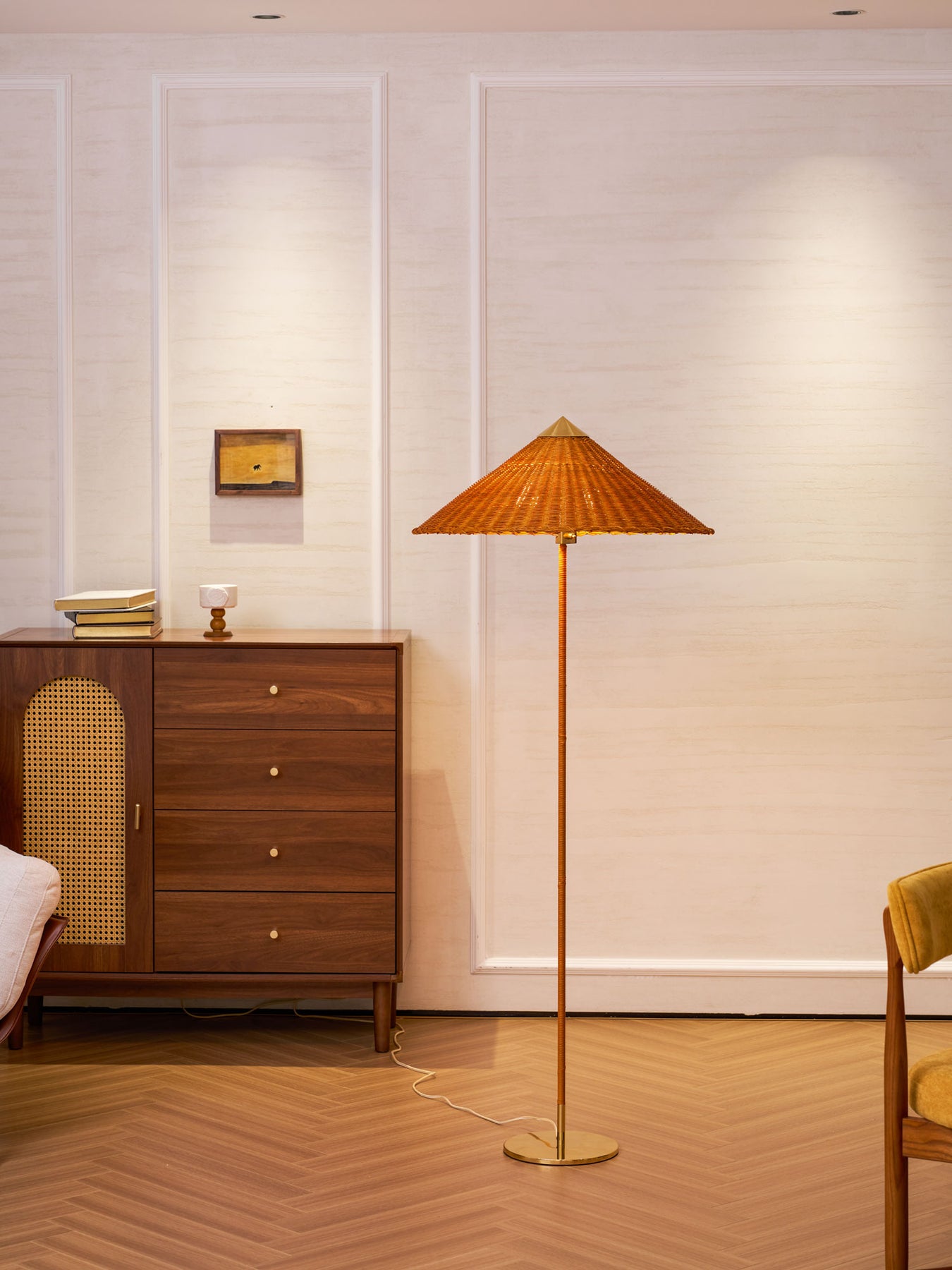 Characterized by its elegant and airy lampshade and rattan-covered stem, the 9602 Floor Lamp shows the designer’s limitless imagination and unparalleled ability to create designs of enduring beauty. Adding a playful, exuberant quality to the top, balanced by the more static form of the base, the 9602 Floor Lamp is perfectly suited for creating a gentle ambient light in the domestic living room.