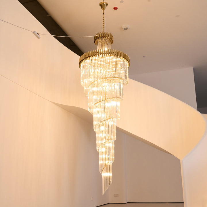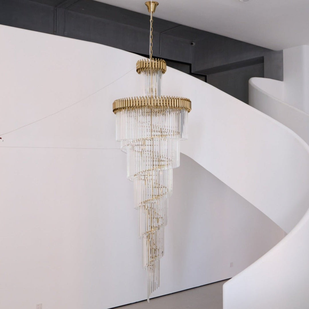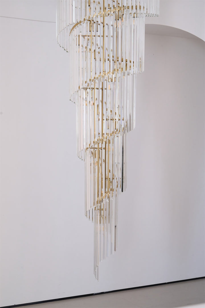 The Crystal Spiral Chandelier is a breathtaking statement piece designed to captivate and illuminate any grand interior. Featuring a cascading spiral of high-quality crystal rods, this chandelier elegantly refracts light, creating a dazzling display of brilliance. The gold-finished frame enhances its luxurious appeal, making it a perfect addition to staircases, foyers, or high-ceiling spaces. Elevate your home or venue with this modern yet timeless masterpiece, bringing sophistication and radiance to any setting.