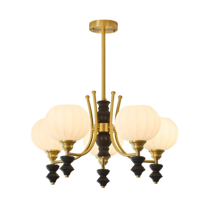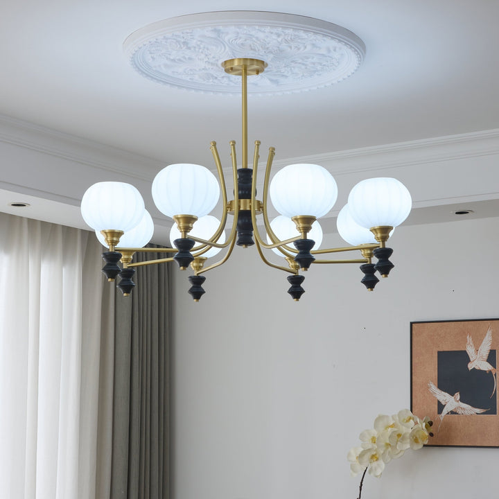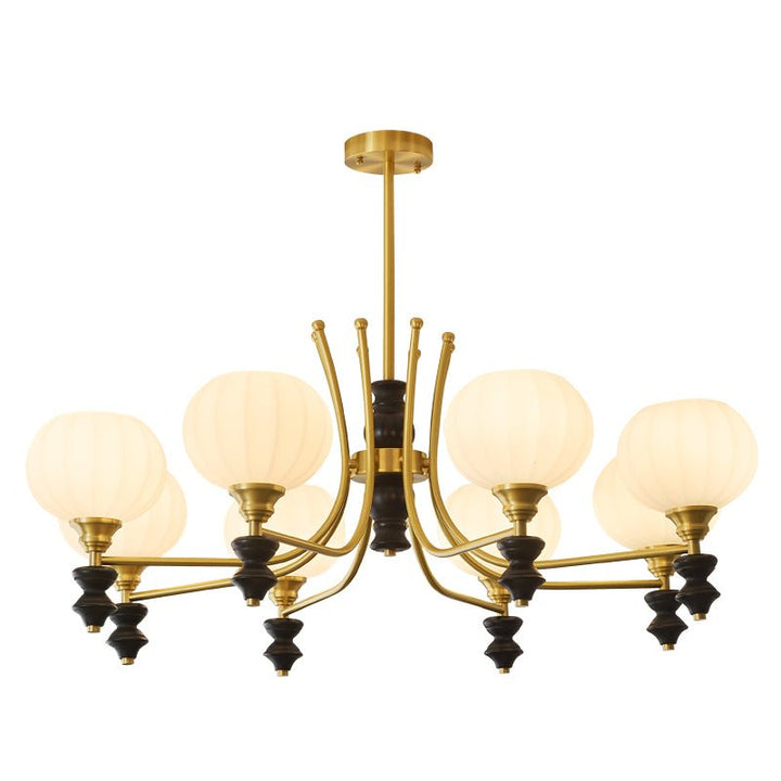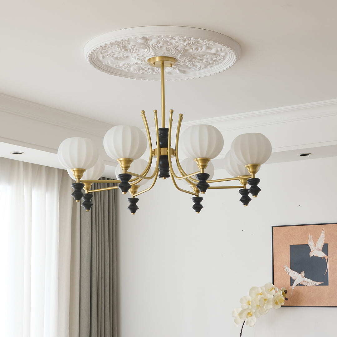 The Lucerna Royale Chandelier by Vakkerlight is a stunning blend of classical grandeur and modern craftsmanship. Designed with a harmonious fusion of wrought iron, glass, and wood, this chandelier features gracefully curved arms supporting delicate, ribbed glass globes that emit a soft, ambient glow. The bold contrast of matte black wood accents against a luxurious gold frame elevates its regal aesthetic, making it a statement piece for sophisticated interiors. Perfect for dining rooms, living spaces, and grand foyers, the Lucerna Royale Chandelier brings timeless elegance to any setting.