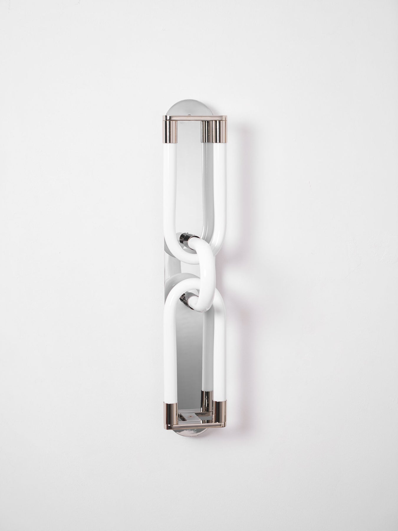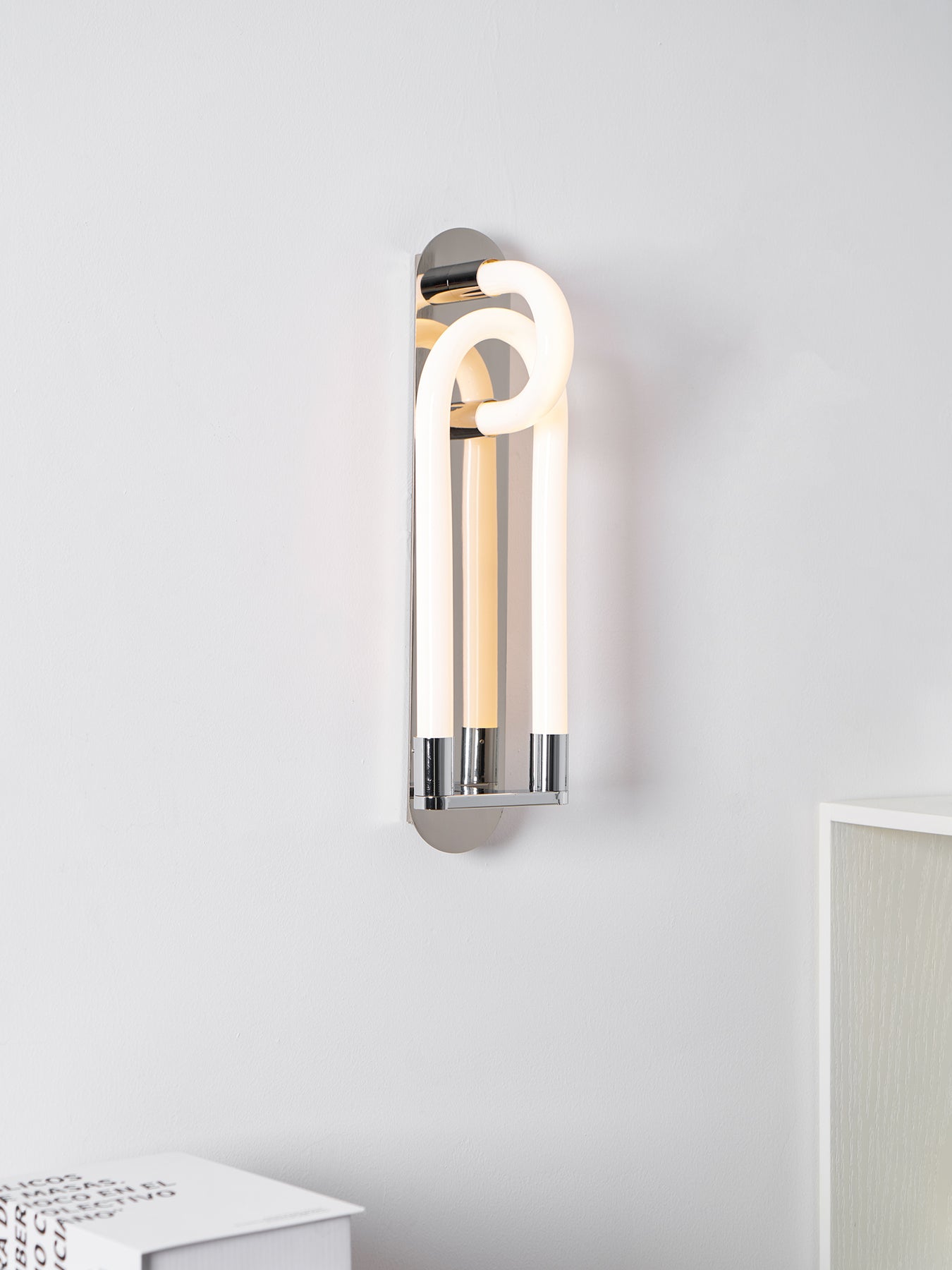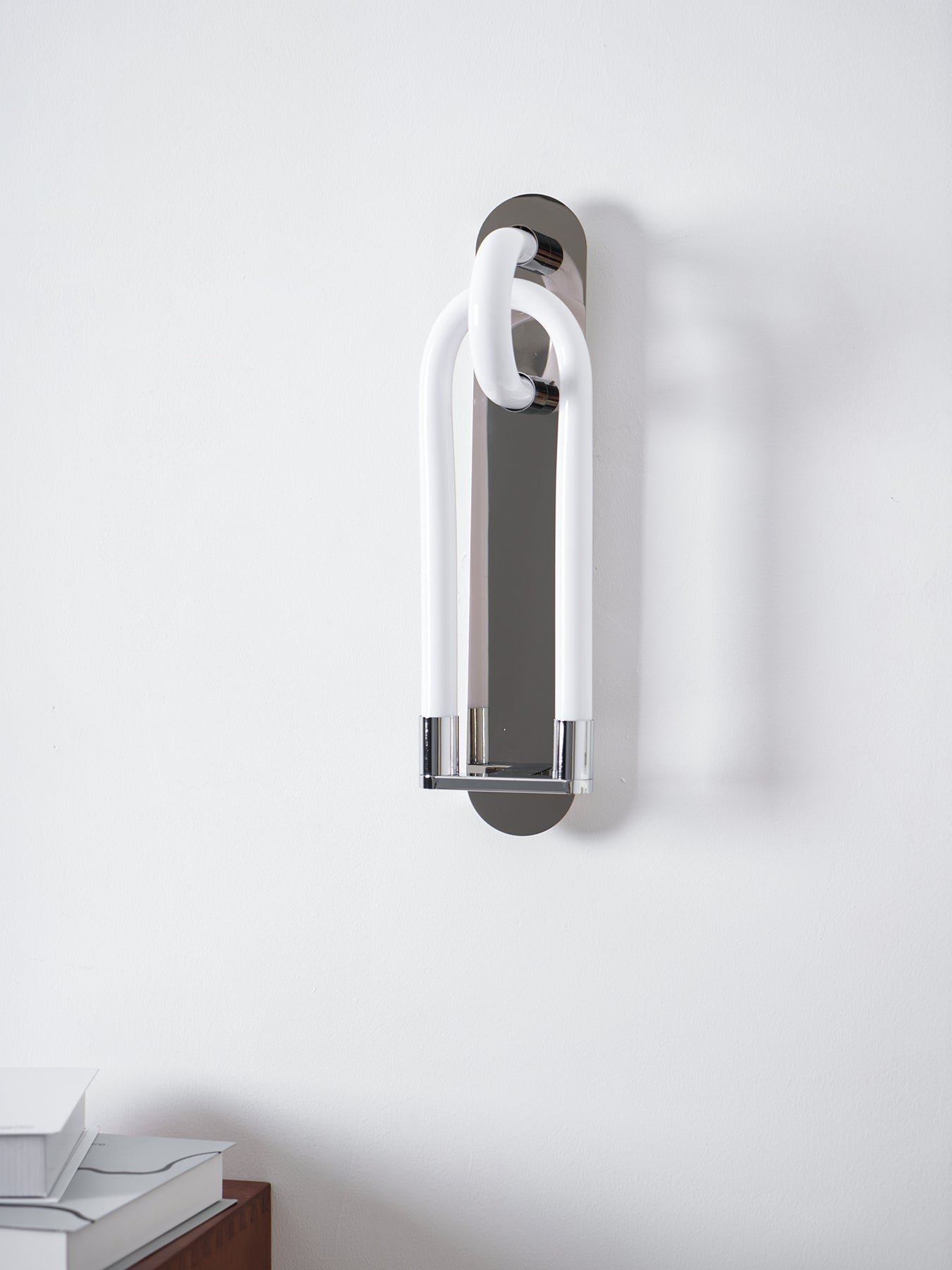 Crafted with precision, the frosted tubular body emits a warm, even glow from both ends, creating an ambient light that gently grazes the wall. The sleek metallic backplate, finished in brushed gold or satin nickel, adds a touch of refined minimalism. Whether mounted vertically or horizontally, Loop Arcus adapts effortlessly to modern interiors.