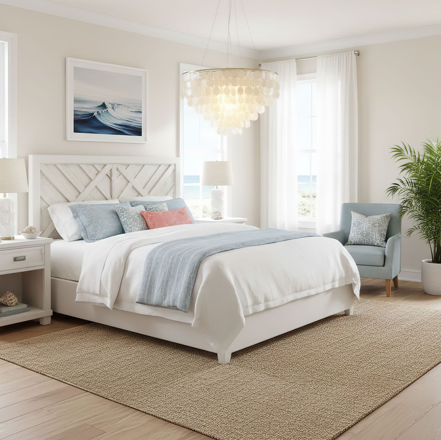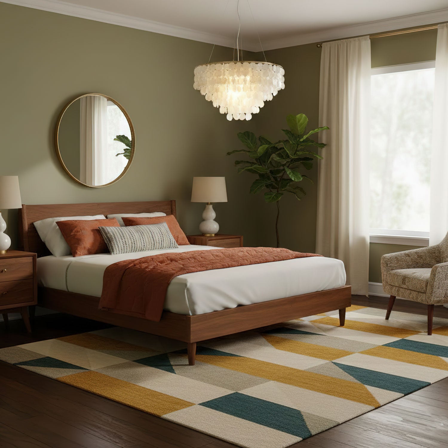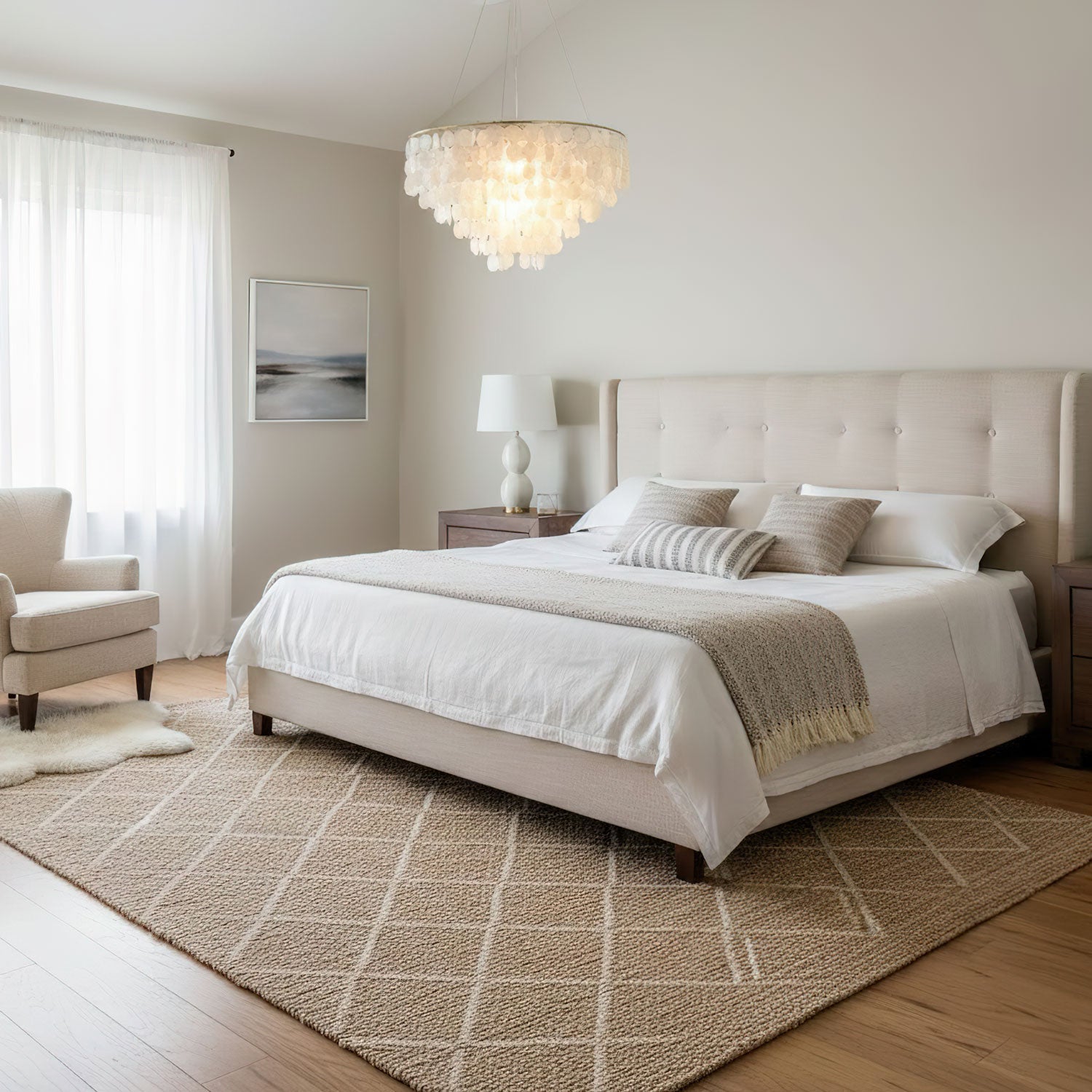 Ceiling Fixtures: Bedrooms benefit from soft, ambient lighting. Use the room dimension formula to ensure the ceiling fixture is properly scaled. Semi-flush or flush mounts work well for general lighting, while sconces or bedside lamps provide focused task lighting.