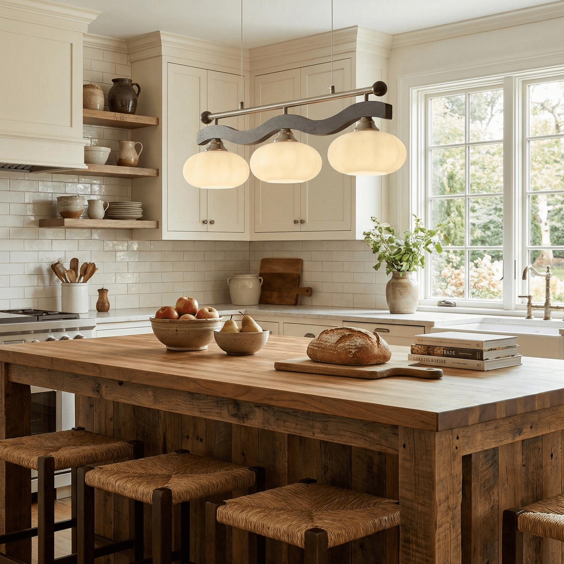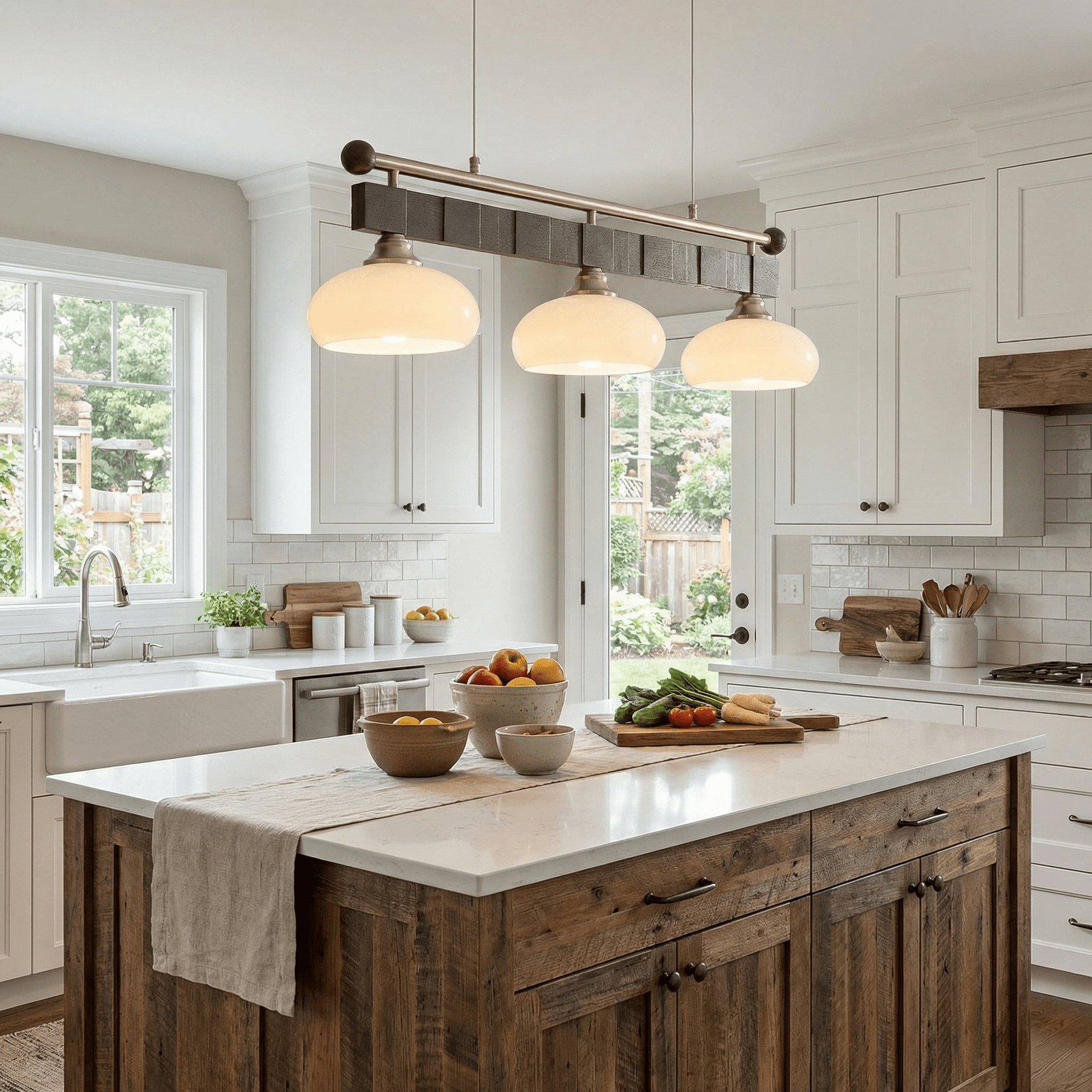 The Caldwell Rail Linear Pendant brings a clean, architectural look to kitchen islands and dining tables. Four softly rounded glass shades line up across a slim horizontal bar, creating balanced, glare-free light that feels warm and inviting—not harsh.