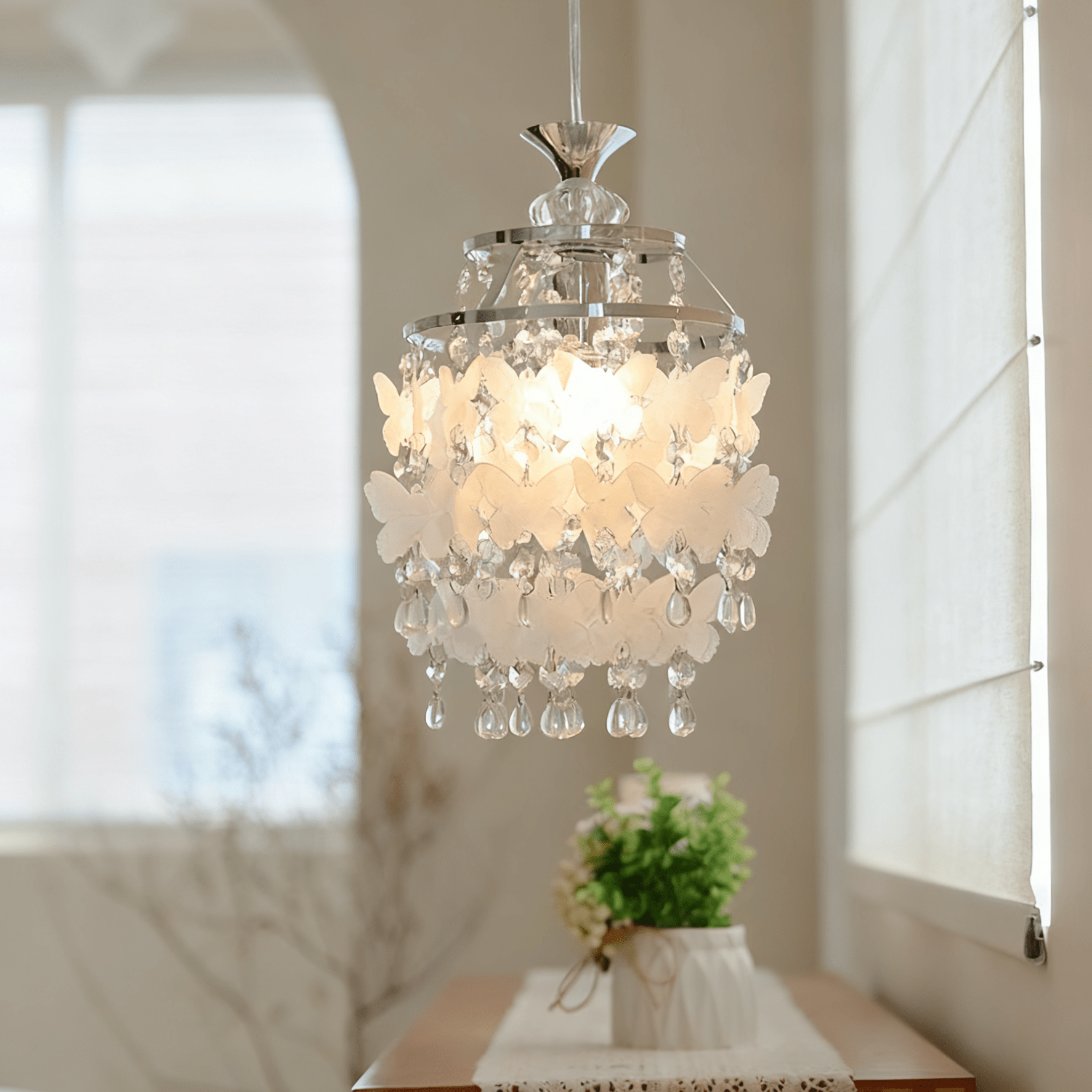 This pendant light features delicate white butterfly - shaped accents cascading down, paired with shimmering crystal beads. The silver - toned top component adds a touch of elegance. When illuminated, it casts a dreamy, romantic glow, creating a whimsical and enchanting atmosphere, perfect for adding a fairy - tale - like charm to bedrooms, girl's rooms, or spaces seeking a touch of delicate beauty.