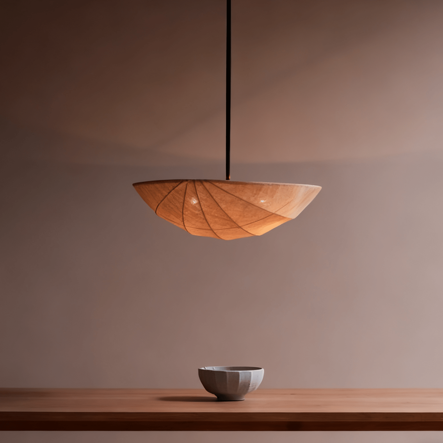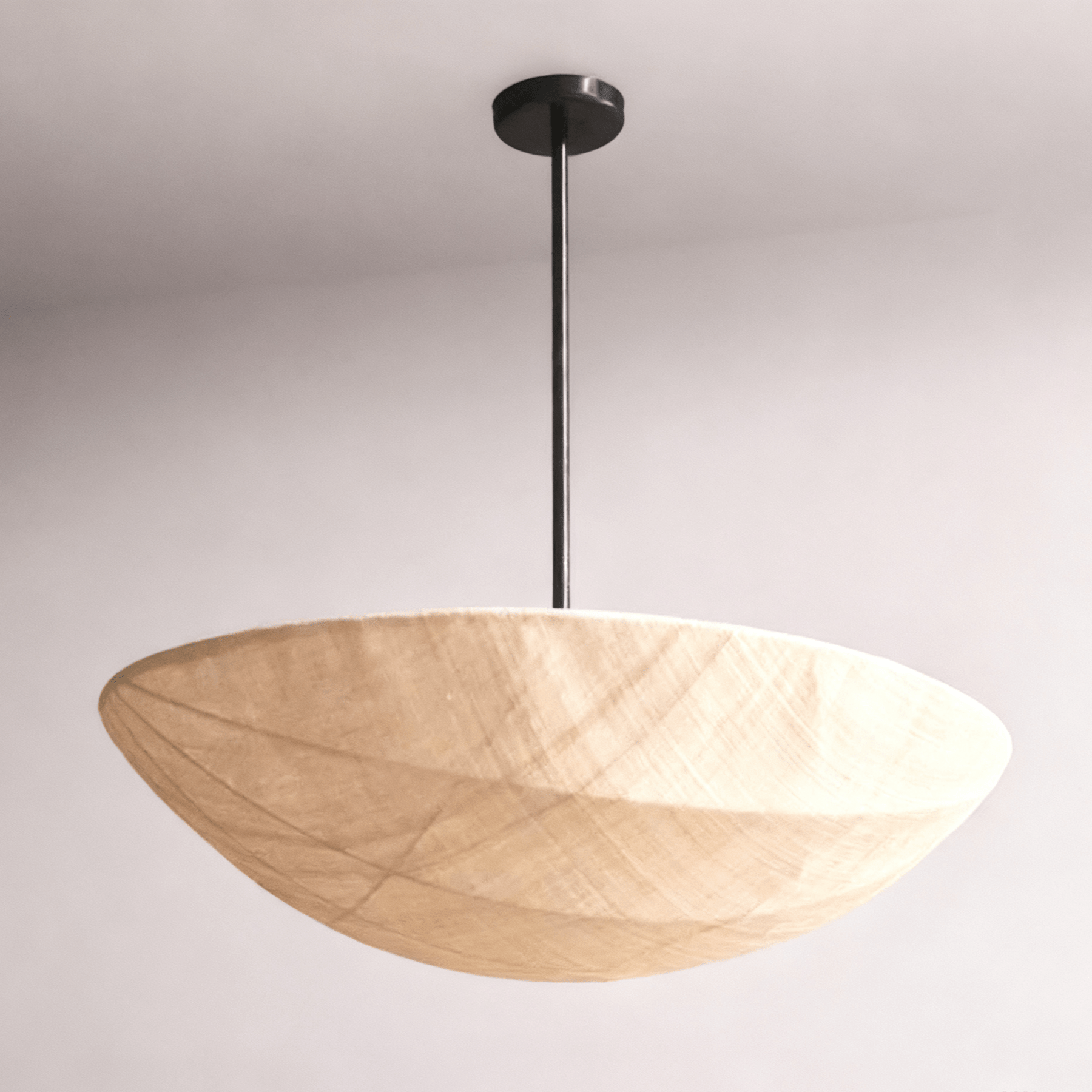 This pendant light features a saucer - shaped shade crafted from fabric. The fabric material gives the shade a soft texture and allows it to diffuse light gently, creating a warm and cozy ambiance. Suspended by a slender metal rod, the light has an overall lightweight and elegant appearance. It is suitable for various spaces such as dining rooms, living rooms, or bedrooms, and can effortlessly blend into different interior styles, adding a touch of softness and unique charm to the space.