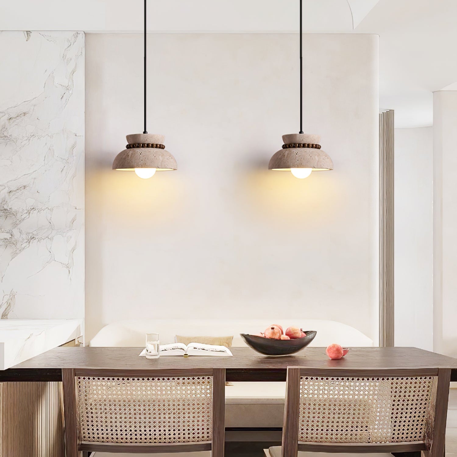 This pendant lamp masterfully combines the natural allure of travertine with the warm, rustic charm of wooden beads. The travertine shade, with its characteristic pitted texture and earthy tones, forms a gentle dome shape. A ring of wooden beads is artfully placed around the upper part of the shade, adding a tactile and visual contrast. Suspended by a sleek black cord, the lamp emits a soft, inviting glow that highlights the unique textures and materials. Ideal for spaces like dining rooms, coffee shops, or living areas, it infuses a cozy, bohemian - rustic ambiance while serving as a striking focal point.