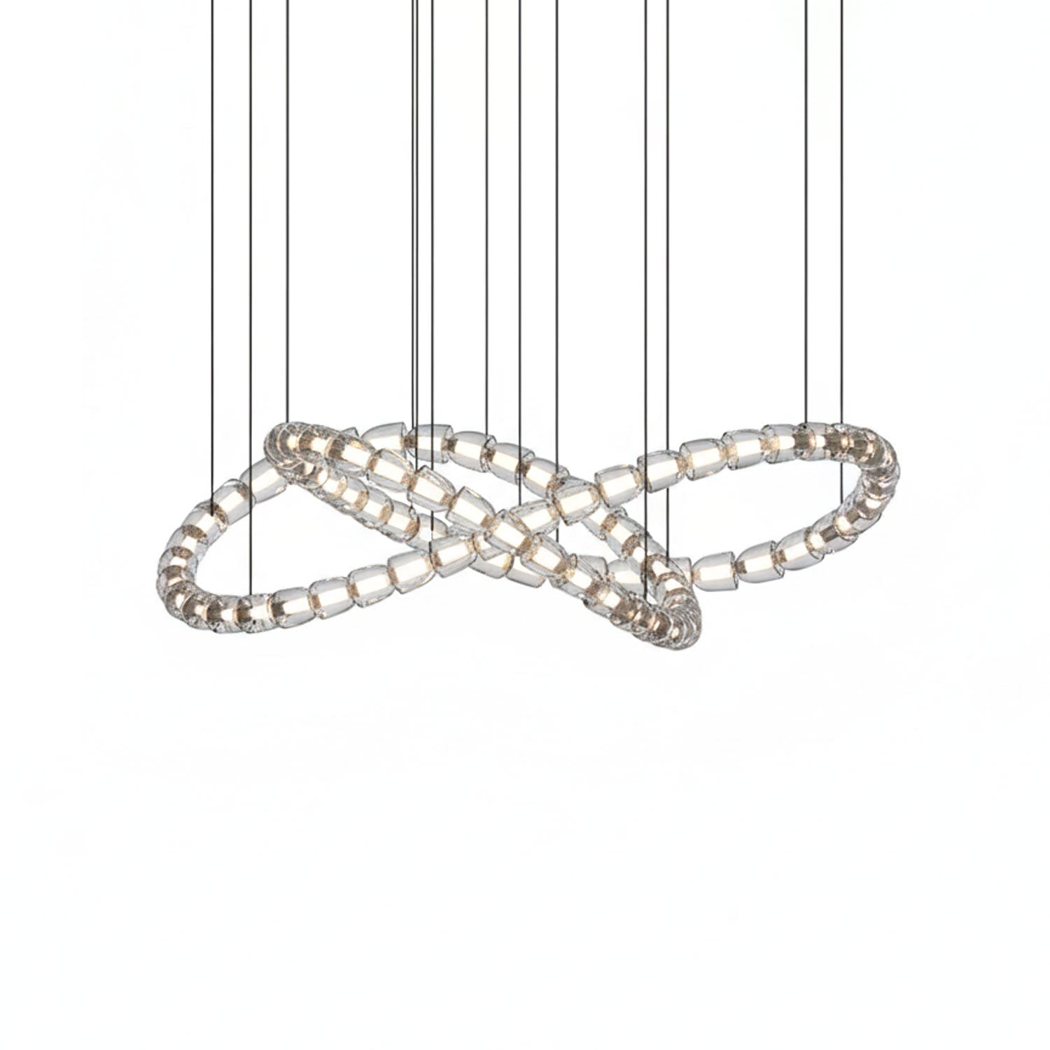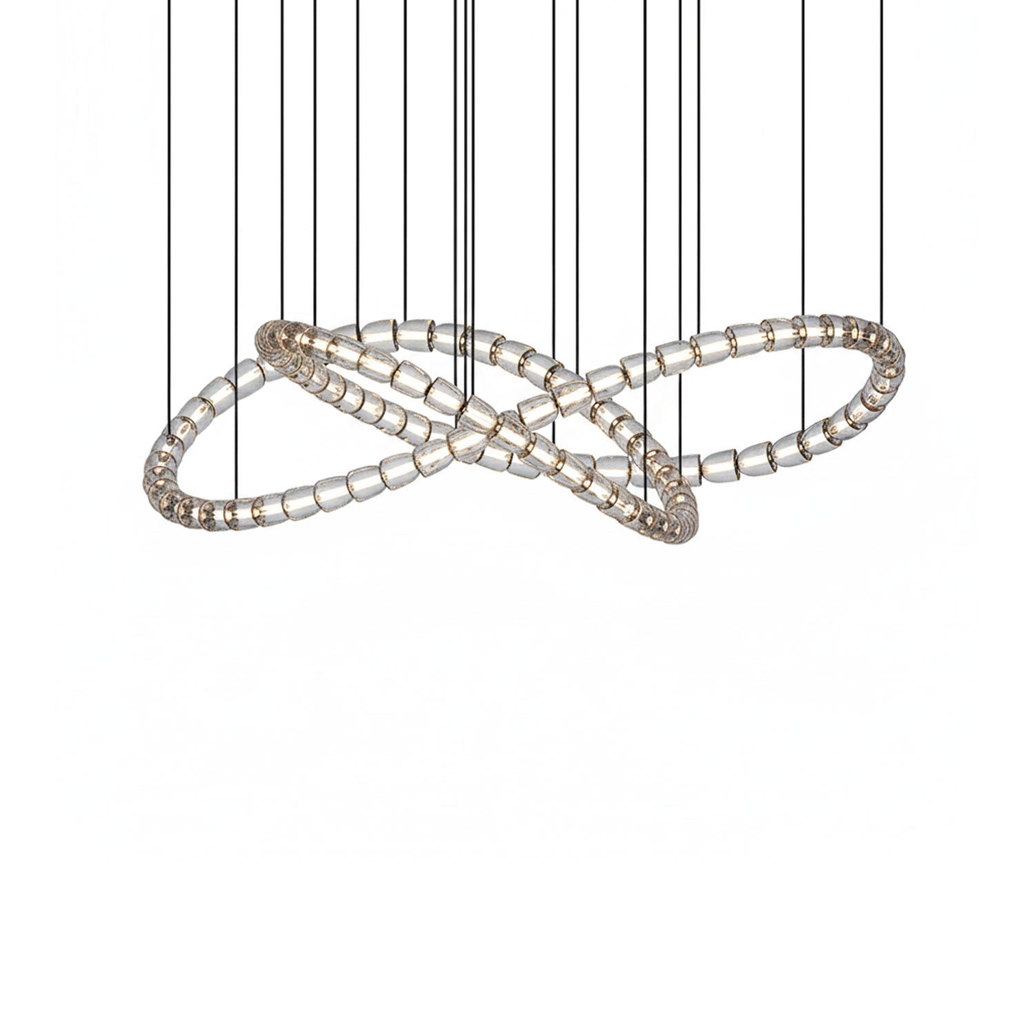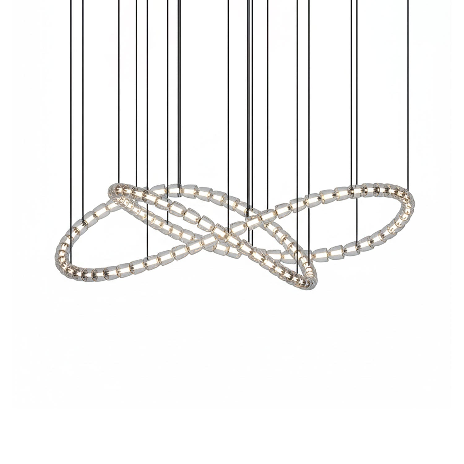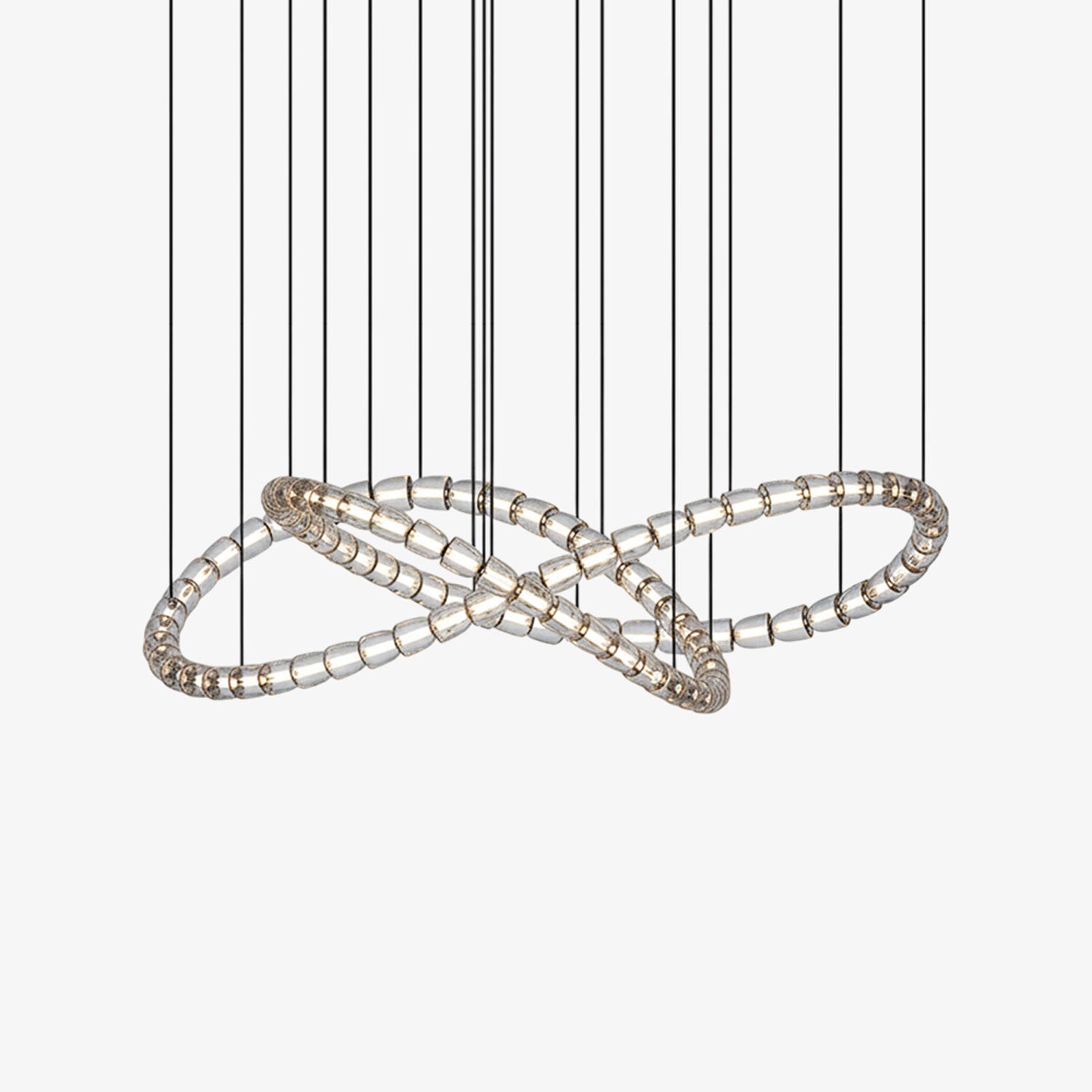 This Gabriel Chandelier C from our collection embodies the fluidity of movement and the elegance of minimalist design. The installation features sinuous curves and intertwining loops, like a sculptural snake suspended in mid-air. Each section is carefully crafted and connected to form a harmonious acrylic trajectory that meanders seamlessly, evoking the elegance of crystal and the fashion of modern art.