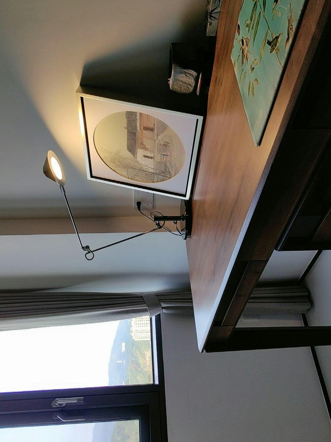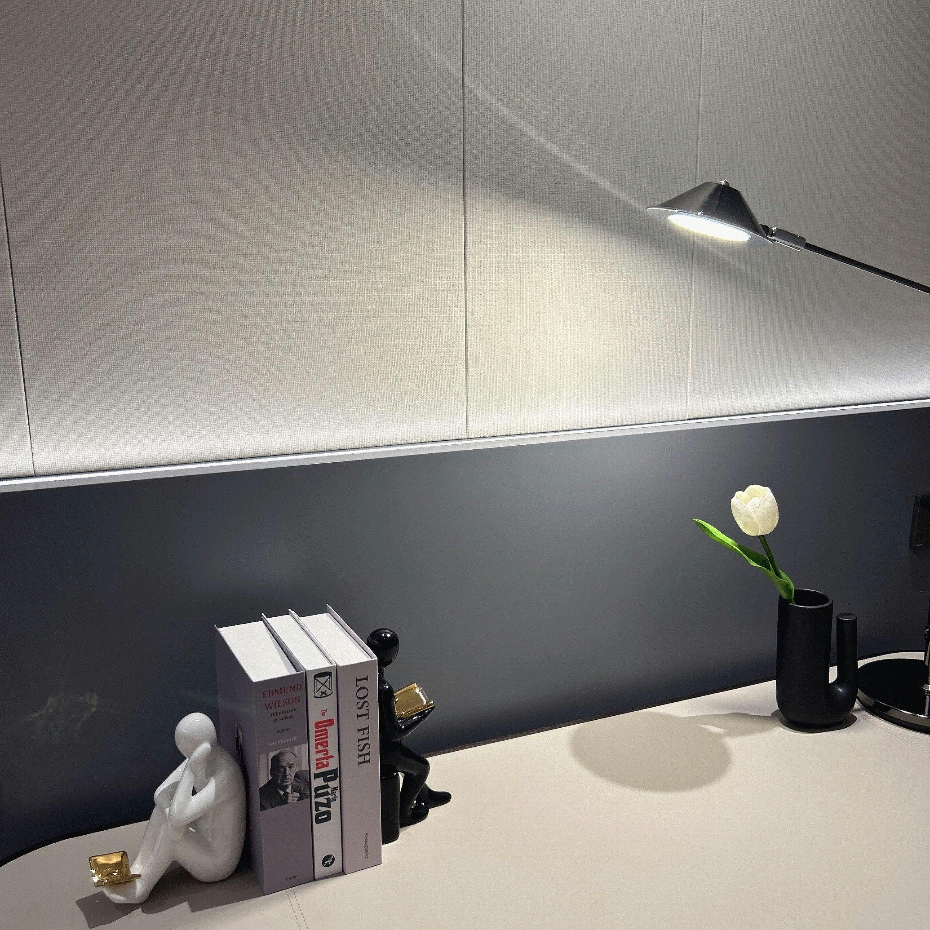 This adjustable black office task lamp is made of metal and features a sleek black cone-shaped lampshade. Its long arm allows for easy positioning and its design caters specifically to task lighting needs in office environments. Illuminate your workspace with precision and style.